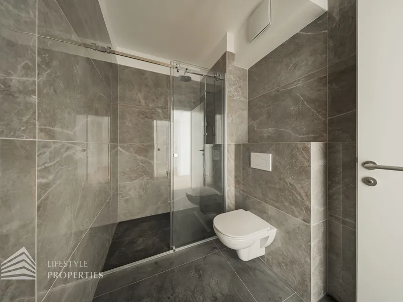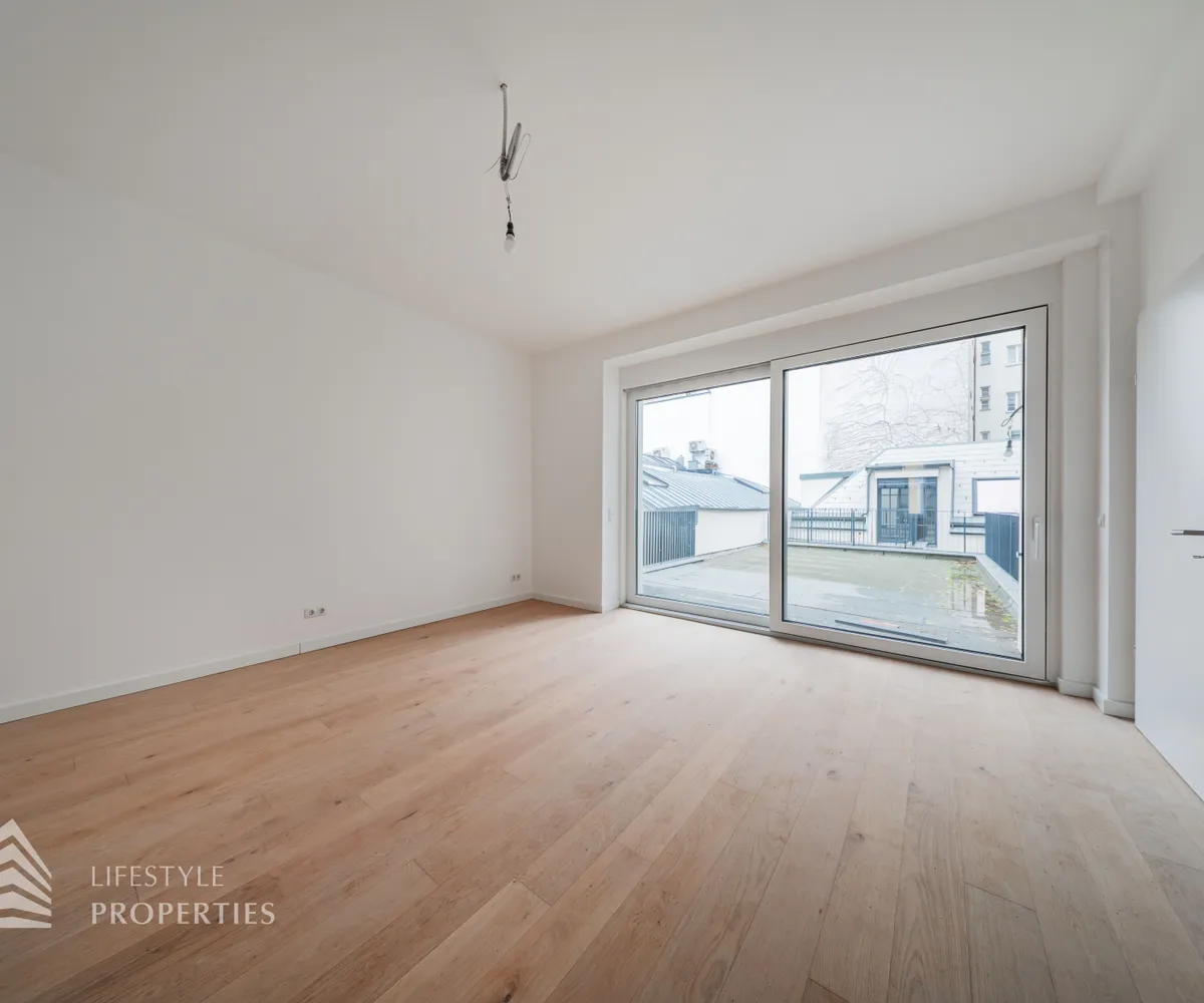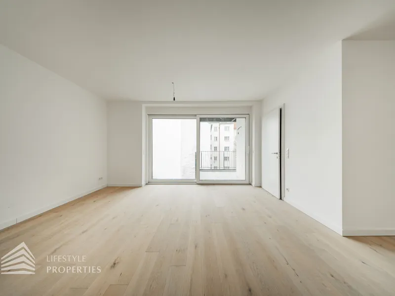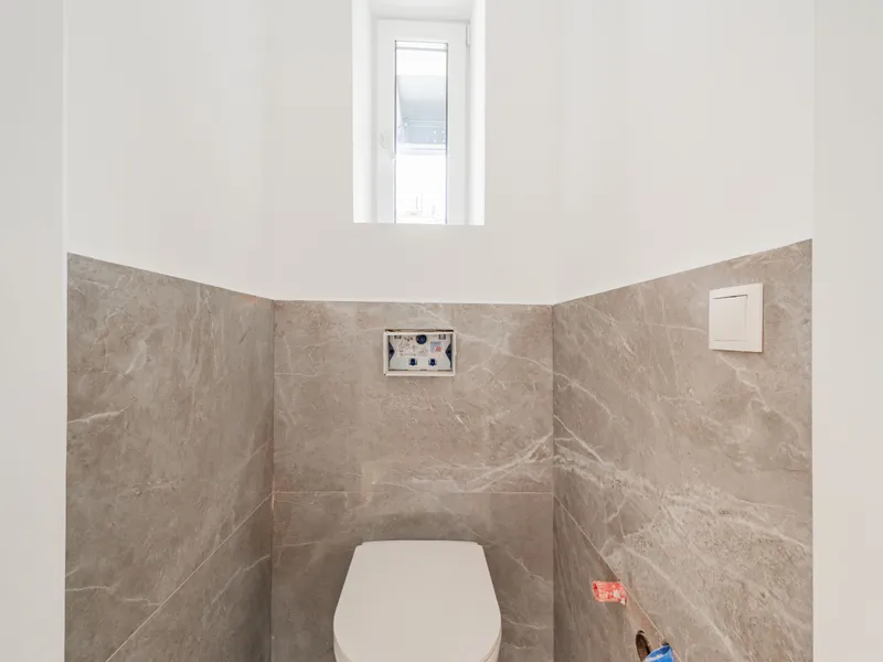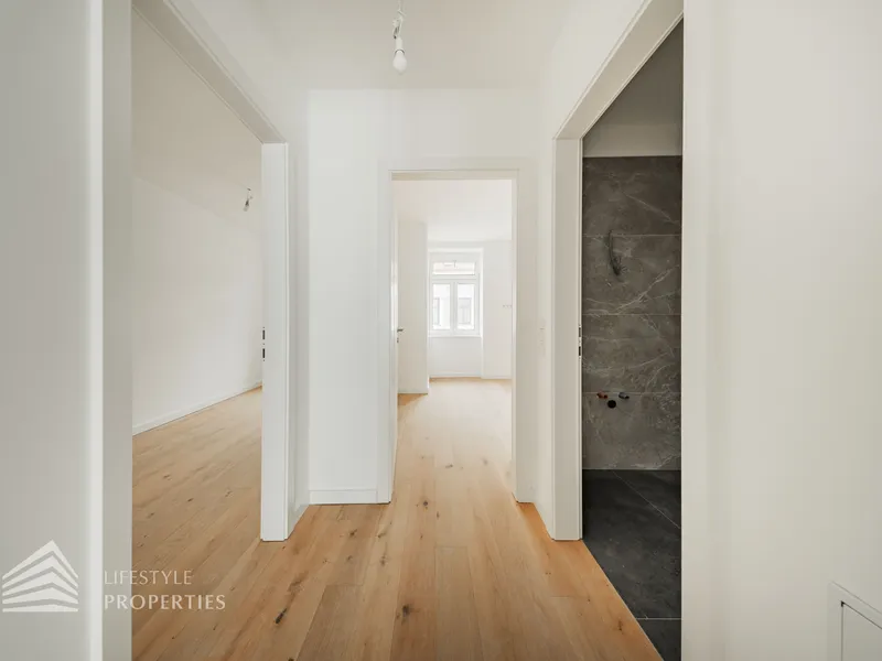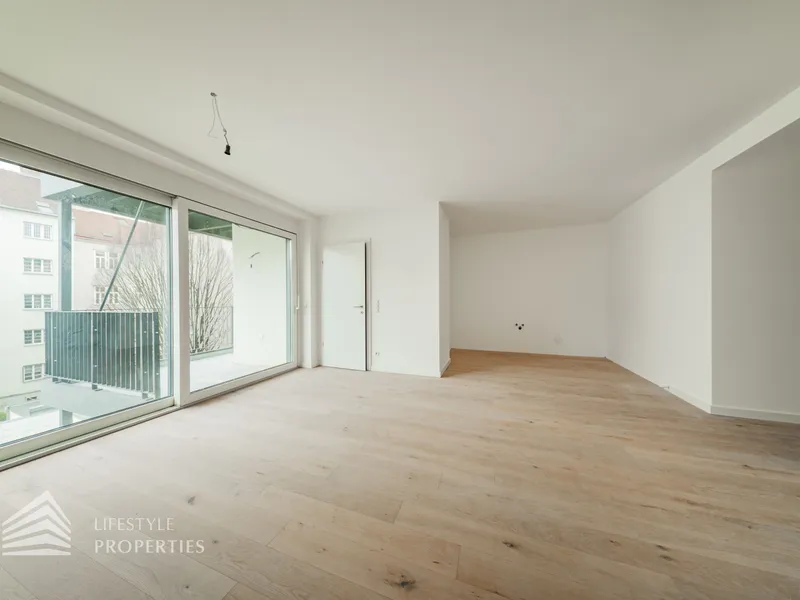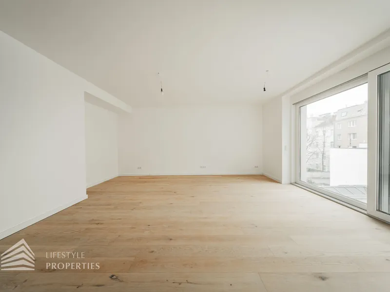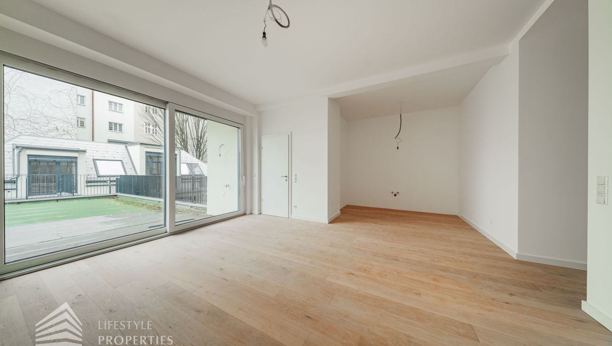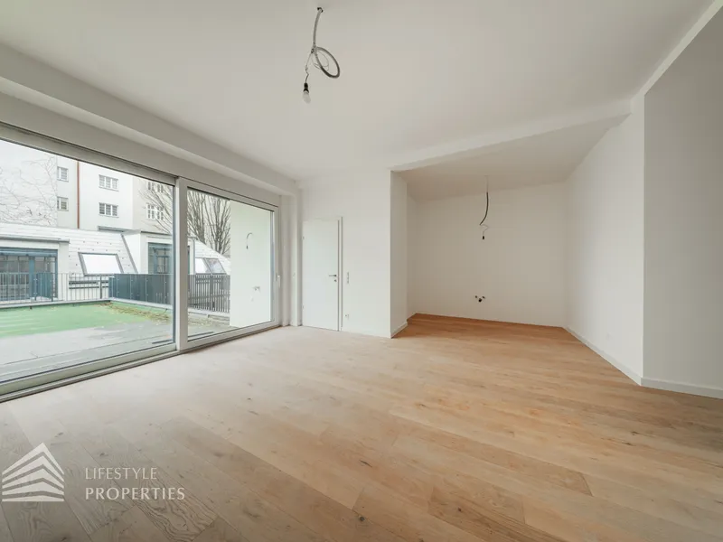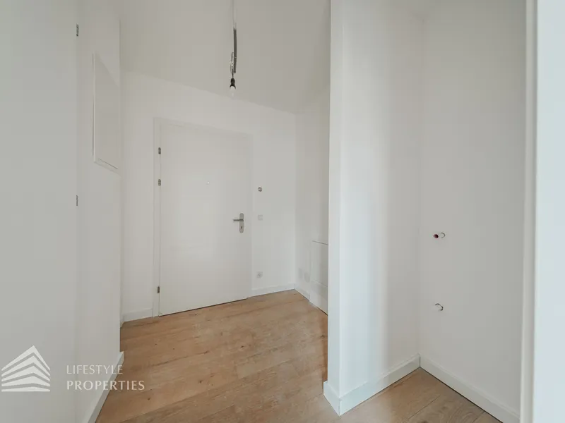 Der Vorraum bietet Platz für eine Garderobe und verfügt über eine praktische Nische mit Anschluss für eine Waschmaschine. Von hier aus gelangt man sowohl in die separate Gäste-Toilette mit Fenster und Handwaschbecken als auch in die großzügige Wohnküche. Die Küchenanschlüsse werden individuell nach Käuferwunsch vorbereitet.Das Highlight der Wohnung ist die ca. 25 m² große, süd- und hofseitig ausgerichtete Terrasse. Die beiden Zimmer sind zentral begehbar. Das moderne Badezimmer ist mit Dusche, WC und Waschbecken ausgestattet.