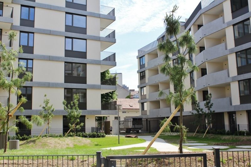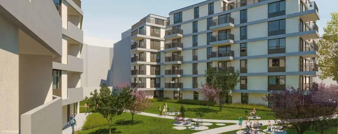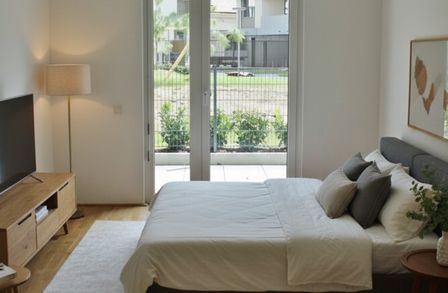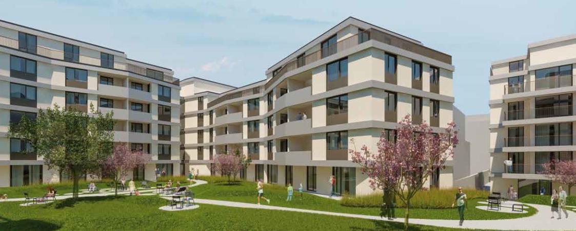 Die Wohnung befindet sich im Erstbezug eines Neubauprojekts und ist Teil einer architektonisch klar strukturierten Anlage mit mehreren Baukörpern und hofseitiger Orientierung. Abseits des Straßenraums, eingebettet in Grün, entfaltet sich hier eine angenehm zurückgezogene Wohnqualität.