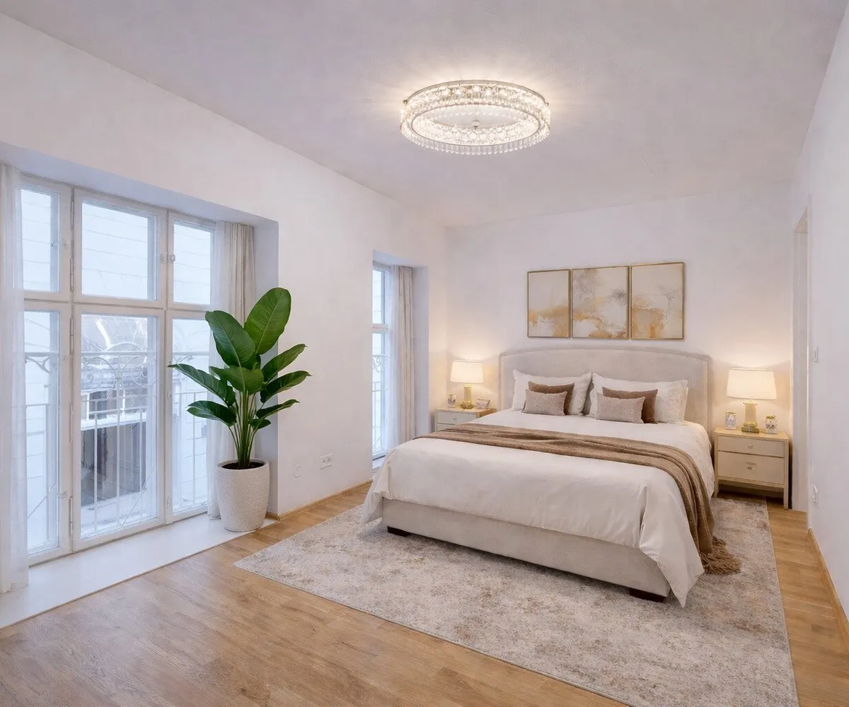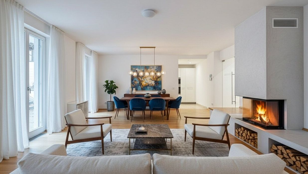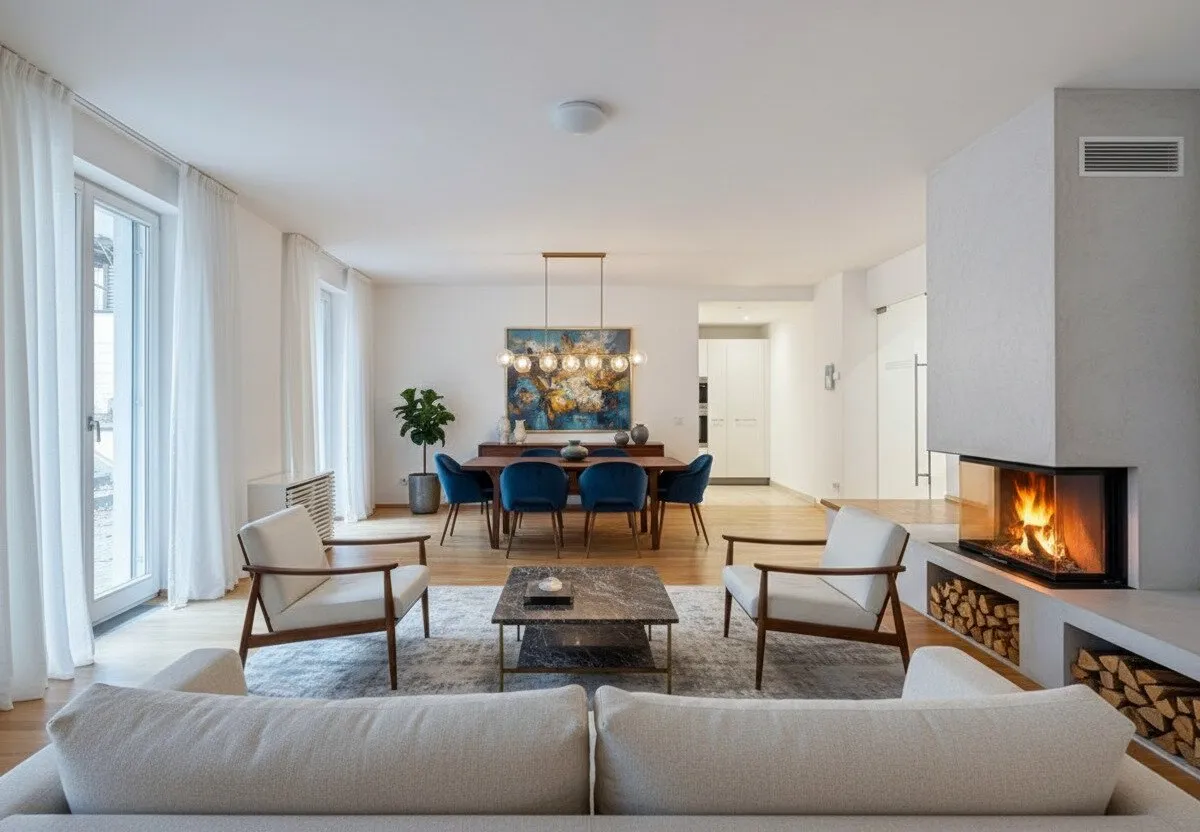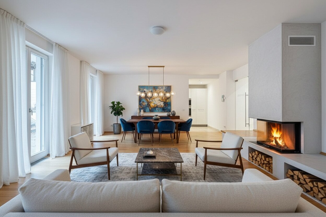Die Wohnung selbst präsentiert sich mit zeitgemäßem, modernem Wohnkomfort - eingebettet in ein architektonisch eindrucksvolles historisches Gebäude.