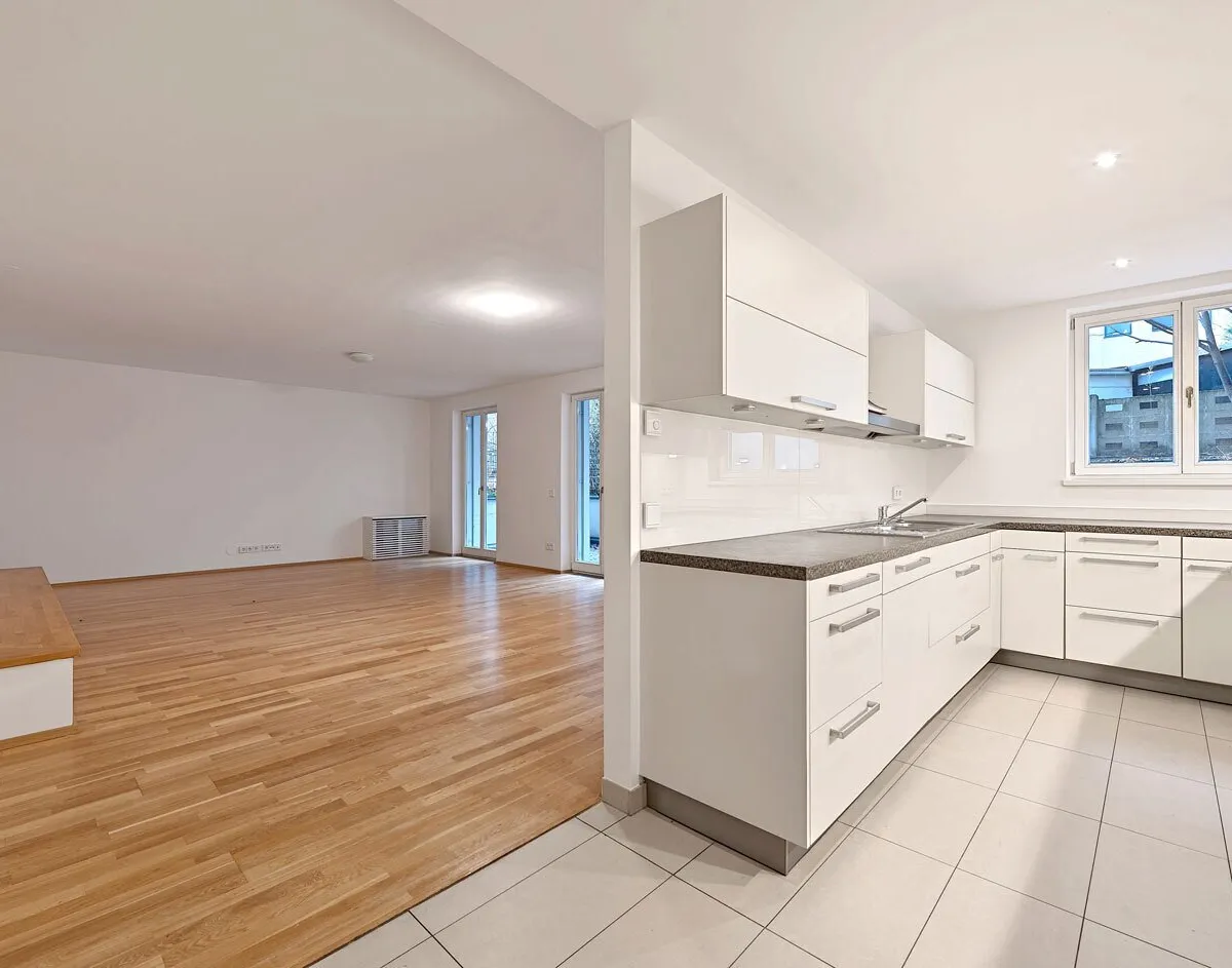 Im Erdgeschoß befindet sich neben dem Eingangsbereich und dem Gäste-WC, der großzügige Wohn-/Essbereich mit rund 46 m² und die voll ausgestattete Küche. Für behagliche Wintertage ist ein Kaminanschluss vorgesehen. Ein besonderes Highlight ist der direkte Zugang zur Terrasse (ca. 17,5 m²) und angrenzendem Garten (ca. 42 m²) - beides in herrlicher Süd-Südost-Ausrichtung gelegen.