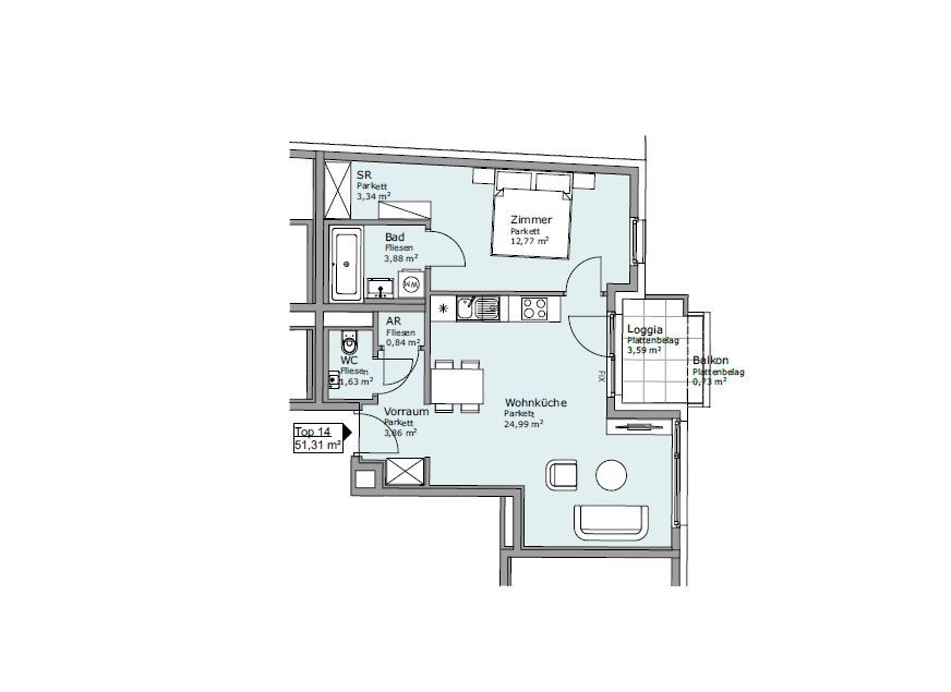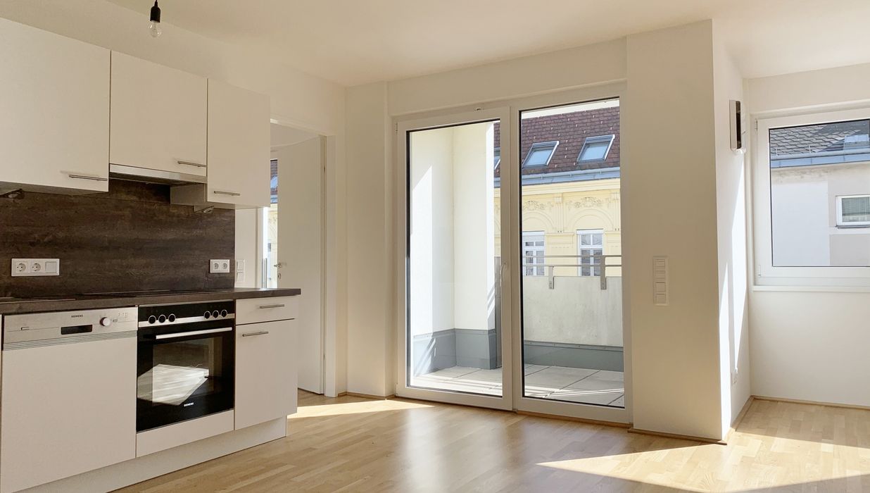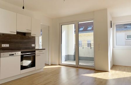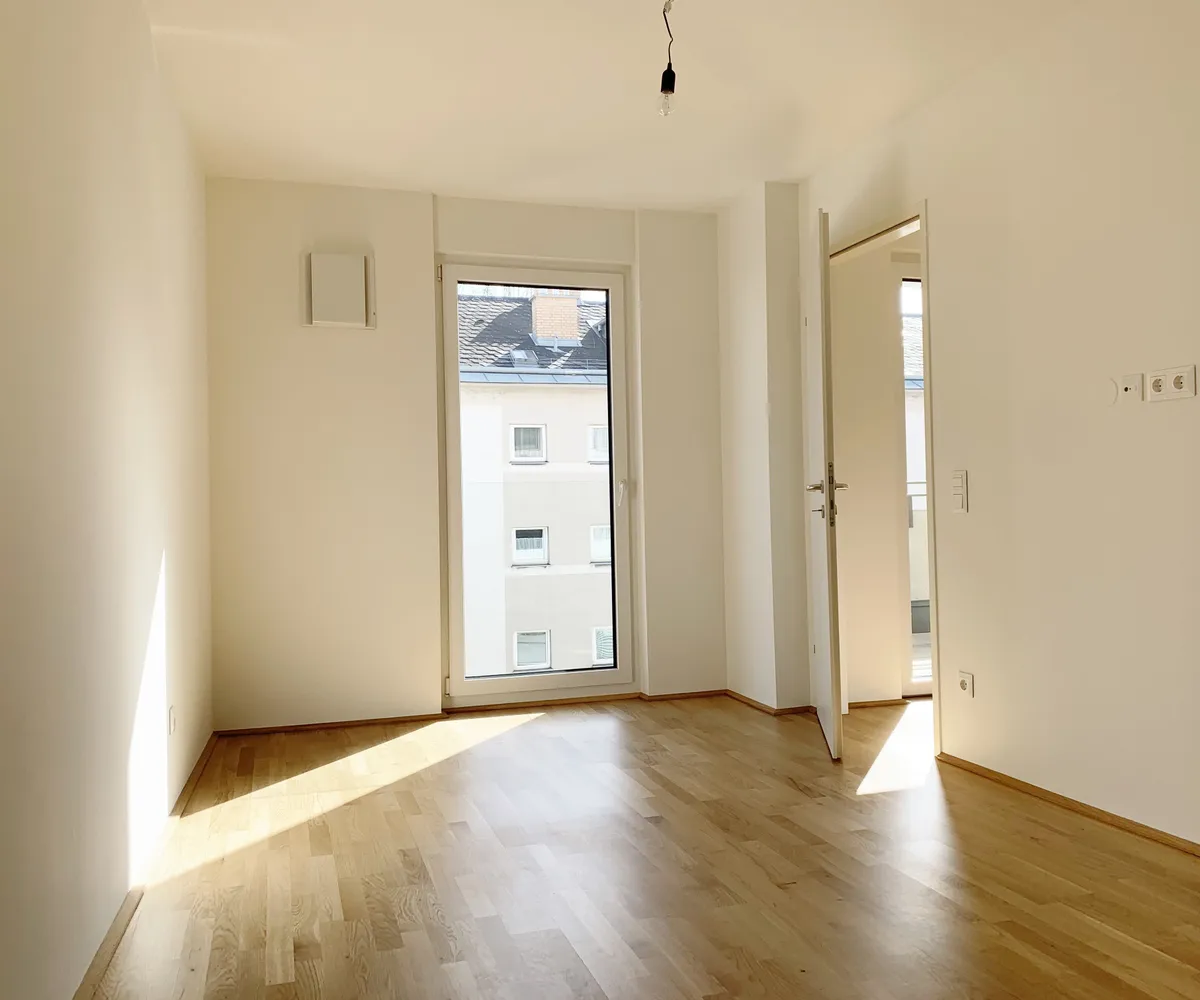 Die Wohnung befindet sich im 4. Obergeschoss und verfügt über eine großzügige Wohnküche mit vollausgestatteter Einbauküche, ein Schlafzimmer mit Schrankraum, ein Badezimmer mit Wanne und Waschmaschinenanschluss, eine separate Toilette, einen Abstellraum und einen Vorraum. Die Loggia lädt zum gemütlichen Beisammen ein und rundet das Wohnerlebnis perfekt ab.