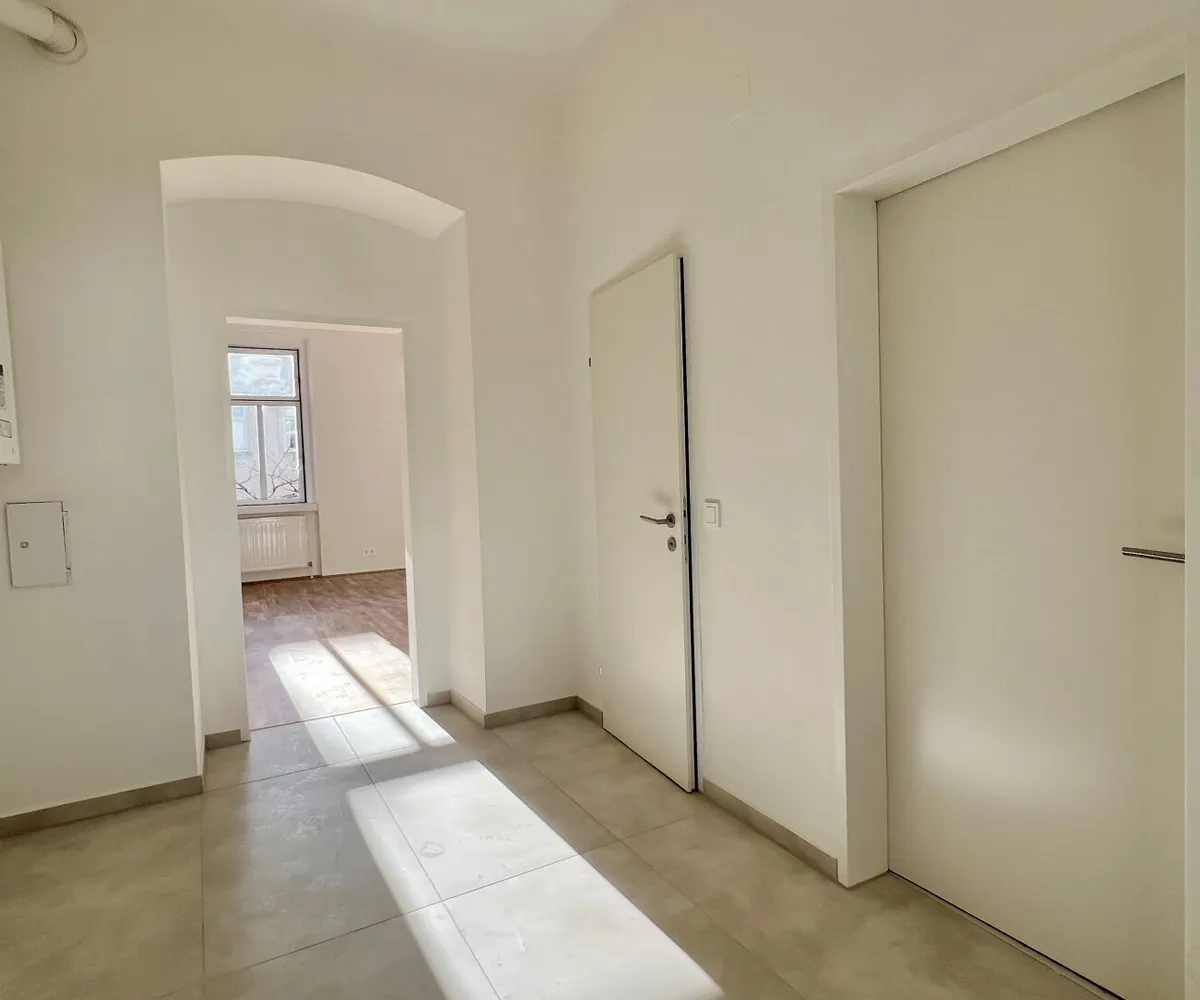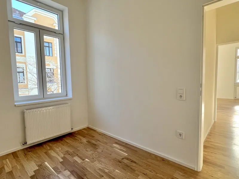 , einen hellen, großzügigen Vorraum, ein geräumiges Wohnzimmer und ein hofseitig gelegenes Schlafzimmer.