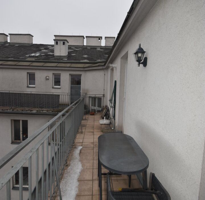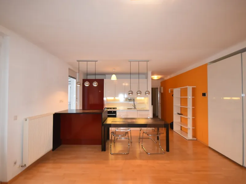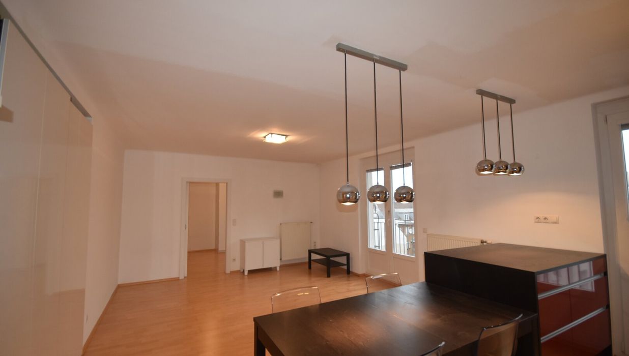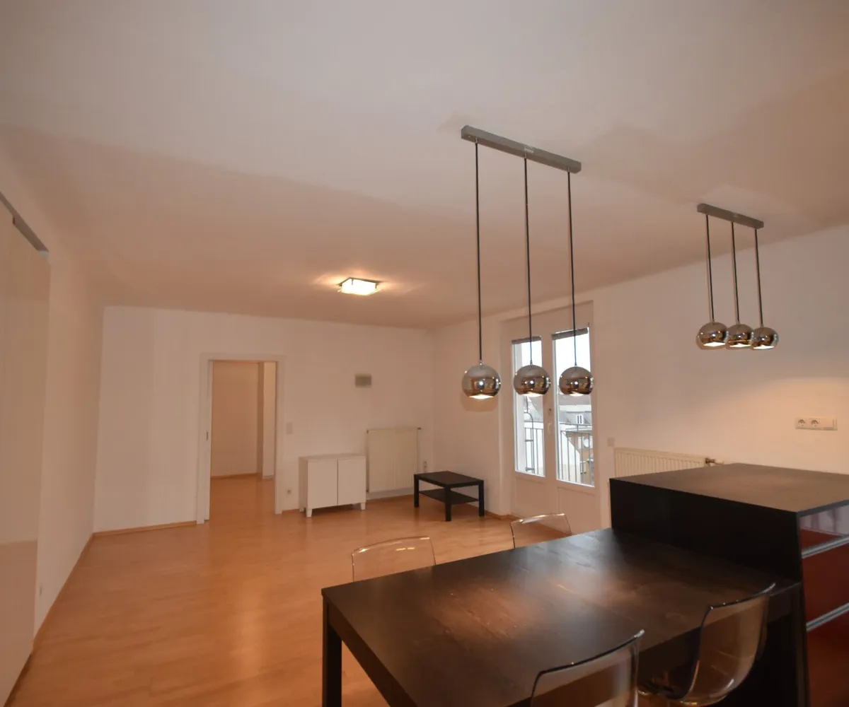 Vom Eingang gelangt man über das Vorzimmer direkt in den einladenden Wohn-Essbereich sowie zu dem ungewöhnlich großen, innenhofseitig gelegenen Balkon. Hinter dem Wohn-Essbereich befindet sich das Schlafzimmer, das ebenfalls über einen Zugang zum Balkon verfügt und damit zusätzlichen Wohnkomfort bietet.