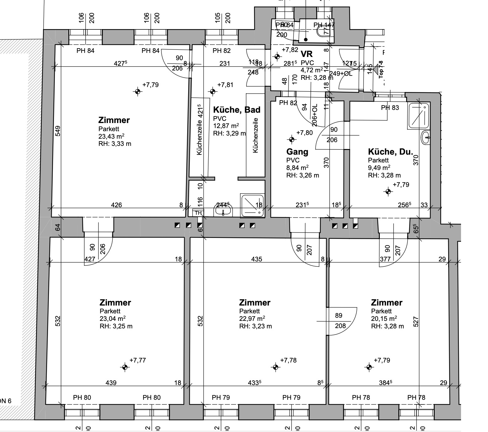 Die Heizungsversorgung erfolgt teilweise über Gasetagenheizungen , überwiegend jedoch über Gaskonvektoren . Der Sanitärstandard entspricht in den meisten Wohnungen nicht dem heutigen Wohnkomfort: Bis auf zwei Einheiten verfügen die Wohnungen derzeit über kein separates Badezimmer ; in diesen Fällen ist lediglich eine Duschmöglichkeit in der Küche vorhanden. Im Zuge einer umfassenden Sanierung lassen sich jedoch moderne Badezimmerlösungen problemlos realisieren.