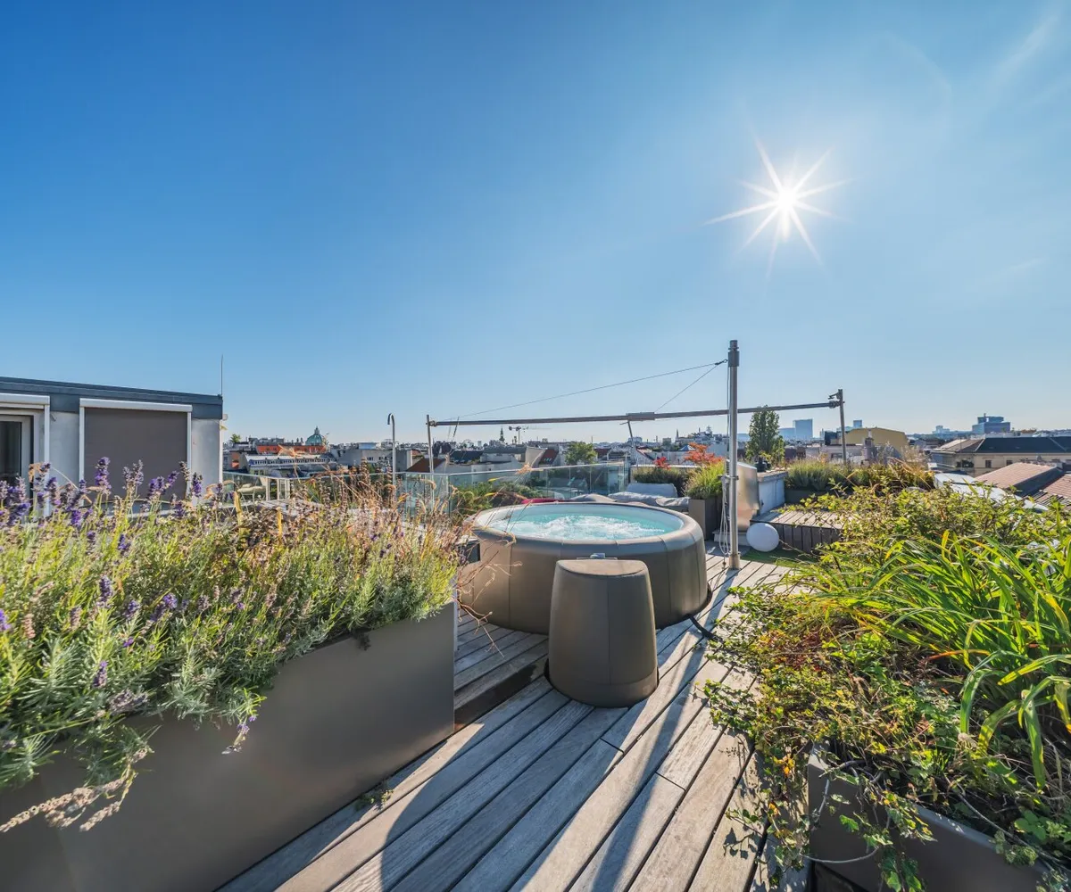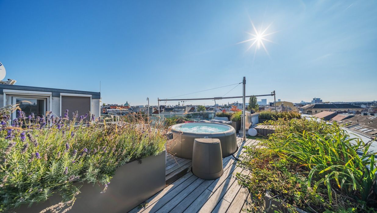 Großzügige Dachterrasse mit atemberaubendem Ausblick, Whirlpool , Outdoordusche , Sonnensegel , Outdoorküche , Pergola & ambiente Beleuchtung
