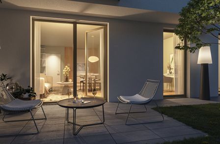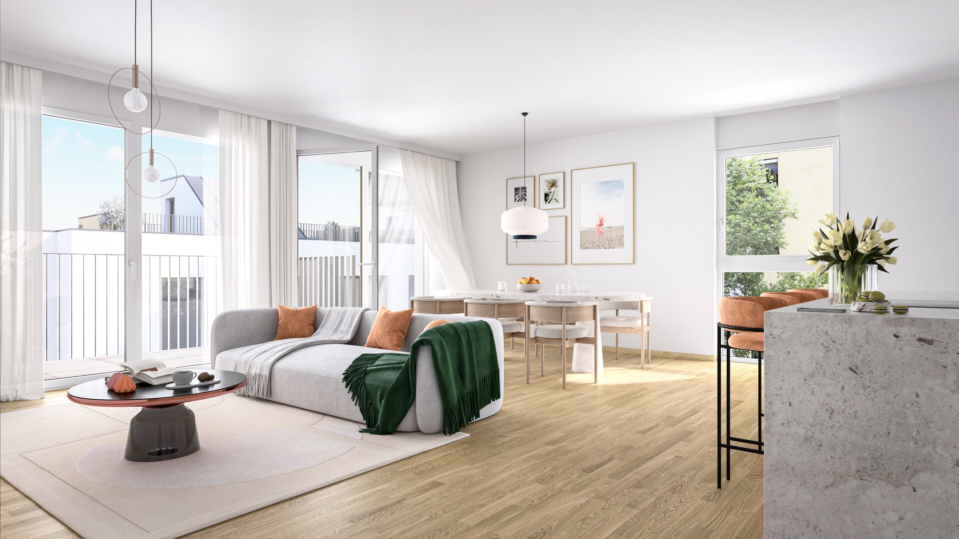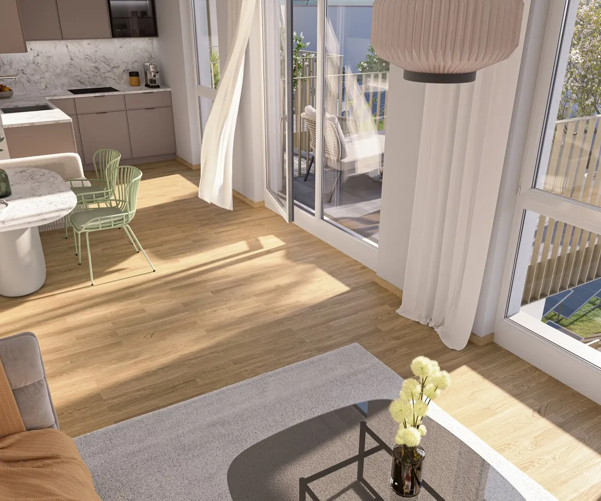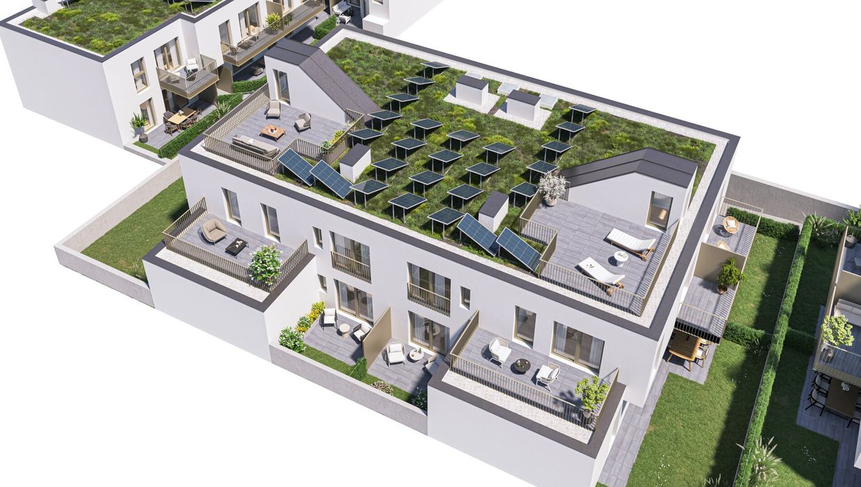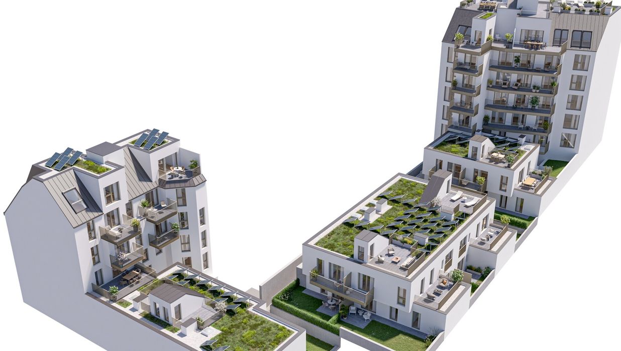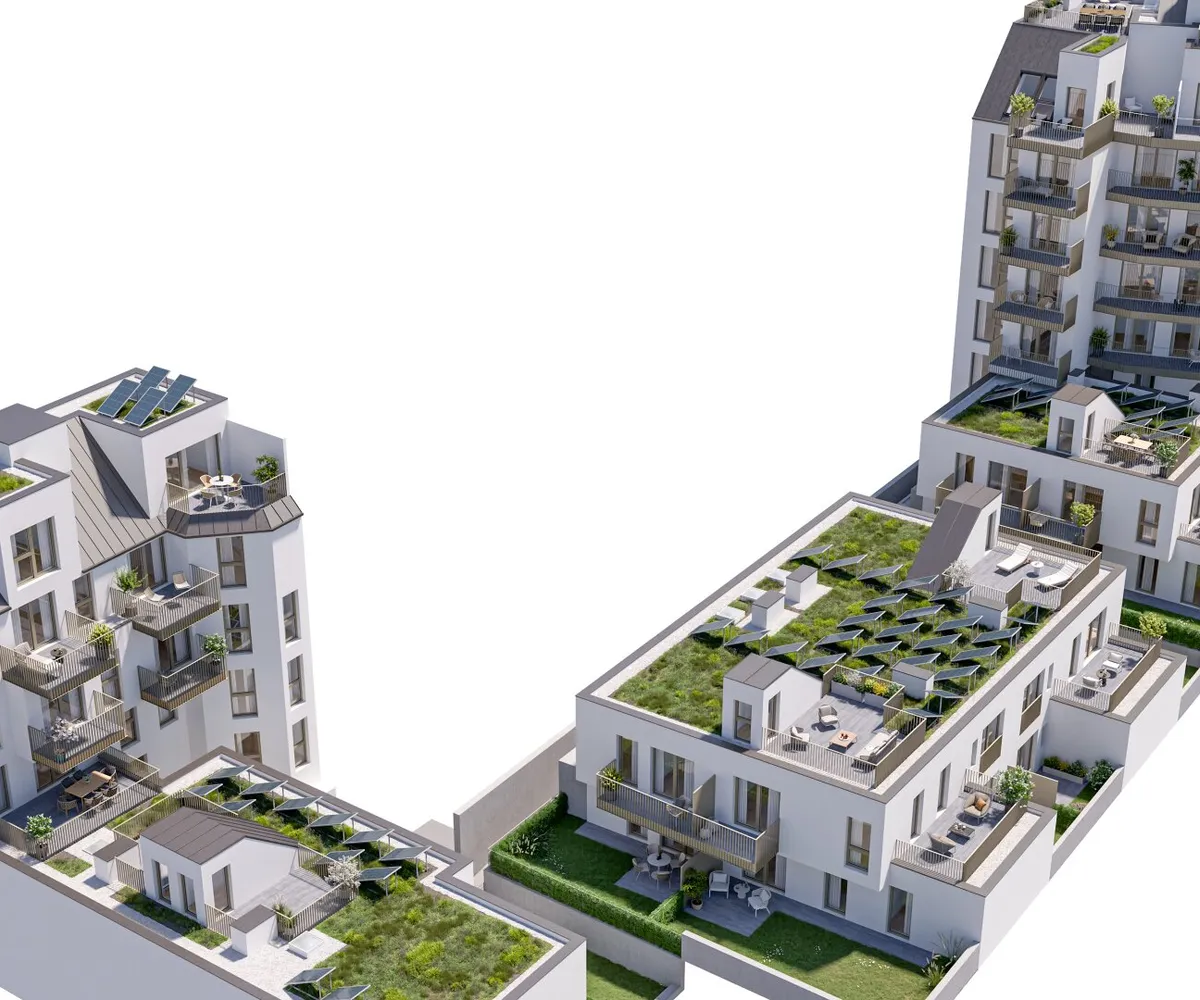 Die sorgfältig geplanten Eigentumswohnungen und Townhouses bieten mit ihren vielfältigen Grundrissen und Wohnungsgrößen für jede Lebensphase die ideale Wohnlösung. Ein behagliches Wohnambiente erzeugen die edlen Eichenparkettböden sowie die hochwertige Sanitärausstattung in den Bädern. Die Raumtemperatur lässt sich bequem über die Fußbodenheizung, die durch Fernwärme betrieben wird, sowie über die elektrisch bedienbaren Raffstores oder Rollläden regulieren. In den Dachgeschosswohnungen sorgen zusätzlich installierte Klimaanlagen dafür, dass es auch im Sommer angenehm kühl bleibt. Jede Wohneinheit verfügt über eine eigene private Freifläche, die die Wohnräume nach außen erweitert und einen idealen Rückzugsort für Erholung und Entspannung bietet.