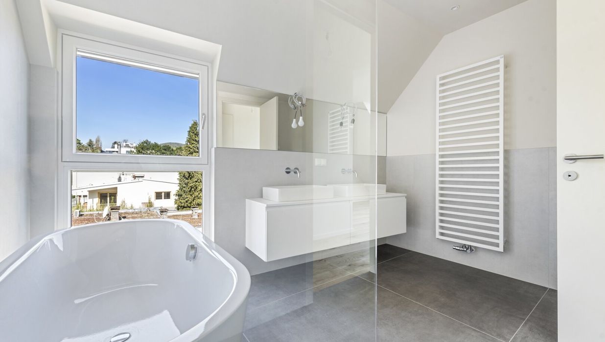 Über einen kurzen Gang gelangen Sie zu einem WC mit Vorraum und Handwaschbecken, hin zu Ihren privaten Räumlichkeiten: Mit Blick zu den Weinbergen befindet sich der ca. 28 m² große Masterbedroom der Wohnung. Ein großes Badezimmer, welches mit hochwertigem Sanitär, wie Badewanne, Walk-In-Dusche, WC und Doppel-Waschbecken mit Unterbaukästen ausgestattet ist befindet sich en suite im Masterbedroom.