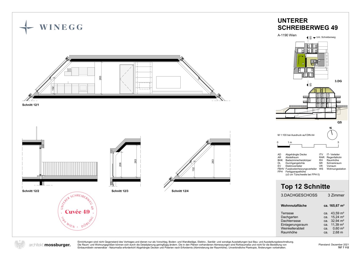 Die Wohnung Top 12 befindet sich als einzige Wohnung im 2. DG und verfügt über eine Wohnfläche von knapp 166 m². Sie verfügt über eine Terrasse auf der Wohnebene mit einer Größe von ca. 44 m² und eine eigene Dachterrasse mit einer Größe von ca. 48 m².