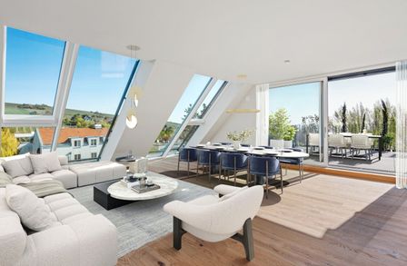Die Wohnung Top 12 befindet sich als einzige Wohnung im 2. DG und verfügt über eine Wohnfläche von knapp 166 m². Sie verfügt über eine Terrasse auf der Wohnebene mit einer Größe von ca. 44 m² und eine eigene Dachterrasse mit einer Größe von ca. 48 m².