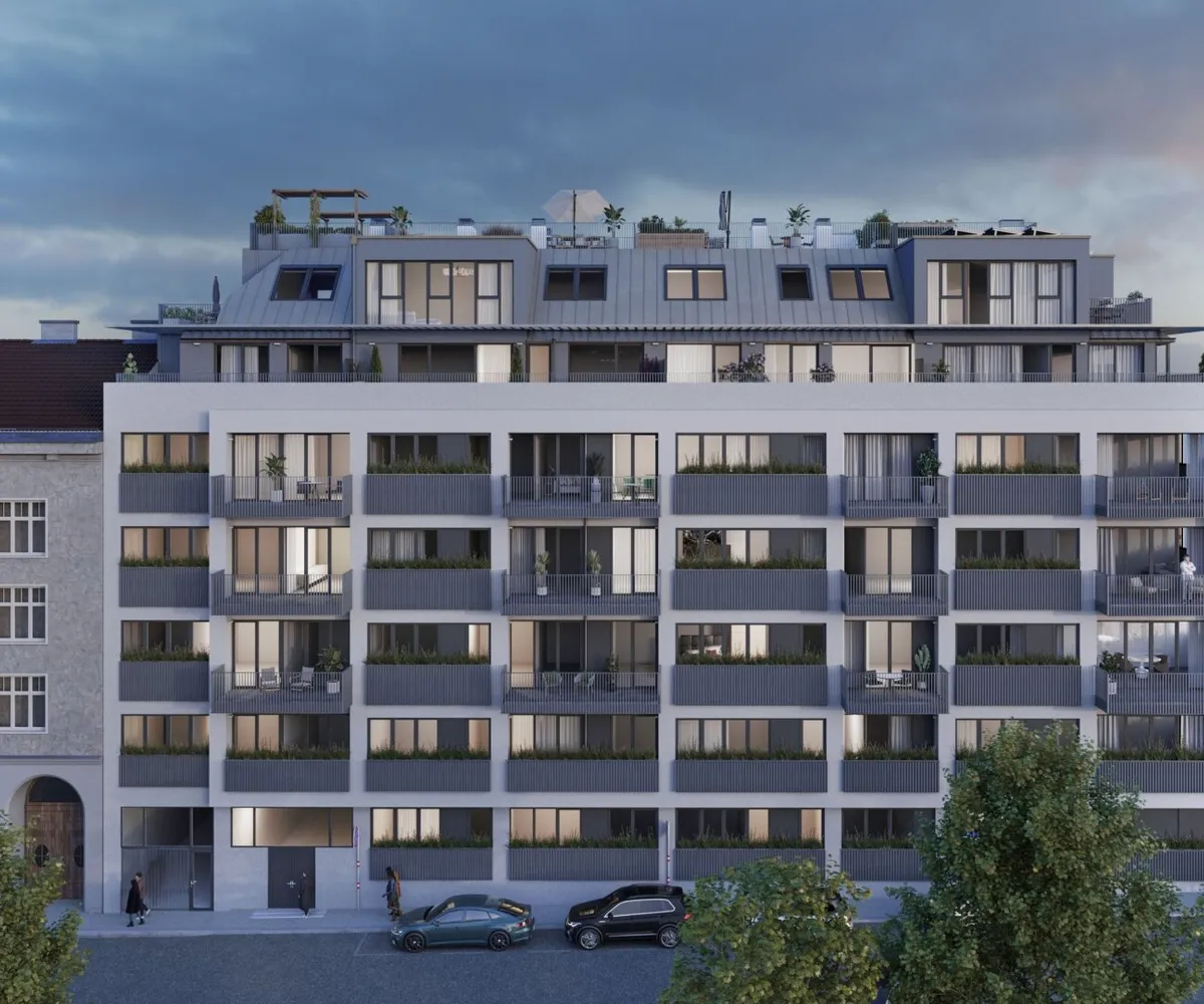 In einer verkehrsberuhigten Sackgasse und direkt am Arik-Brauer-Park gelegen entstehen 150 hochwertige Eigentumswohnungen mit Wohnflächen von ca. 30 m² bis 130 m², die für unterschiedlichste Lebensbedürfnisse und Wohnkonzepte ausgelegt sind. Die Wohnungen bieten attraktive Extras wie private Gärten, Balkone, Loggien und eine beeindruckende Panorama-Terrasse, die einen atemberaubenden 360° Panoramablick über Wien eröffnet. Mit großzügigen Raumhöhen schaffen wir ein offenes und luftiges Wohngefühl. Darüber hinaus stehen Tiefgaragenstellplätze zur Verfügung und moderne Energiekonzepte, wie Photovoltaik und Fernwärme, garantieren eine nachhaltige und effiziente Energieversorgung. Hier wohnen Sie stilvoll, zukunftsorientiert und überaus komfortabel.
