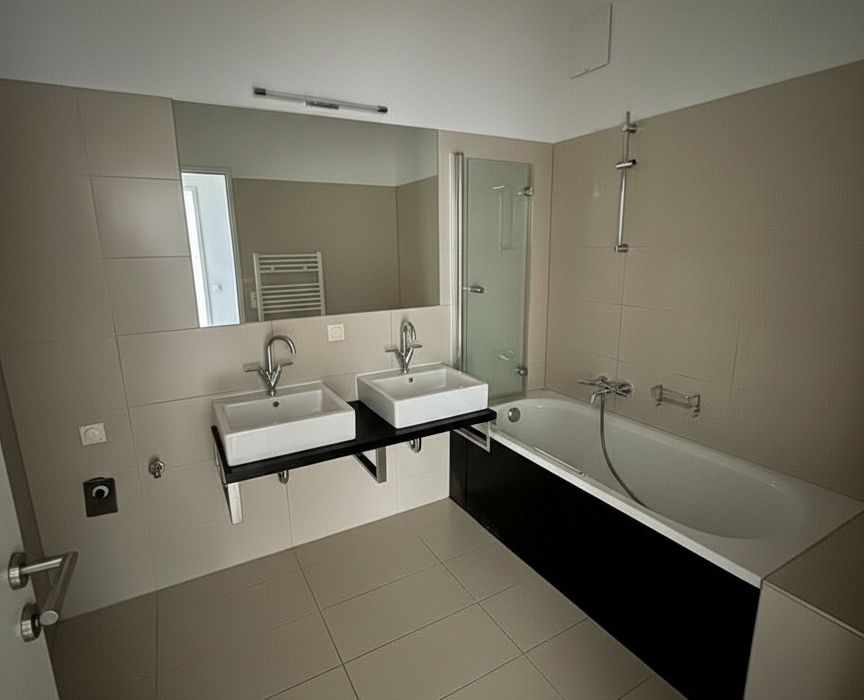 Das Badezimmer ist mit einer Badewanne sowie einem Doppelwaschbecken ausgestattet.