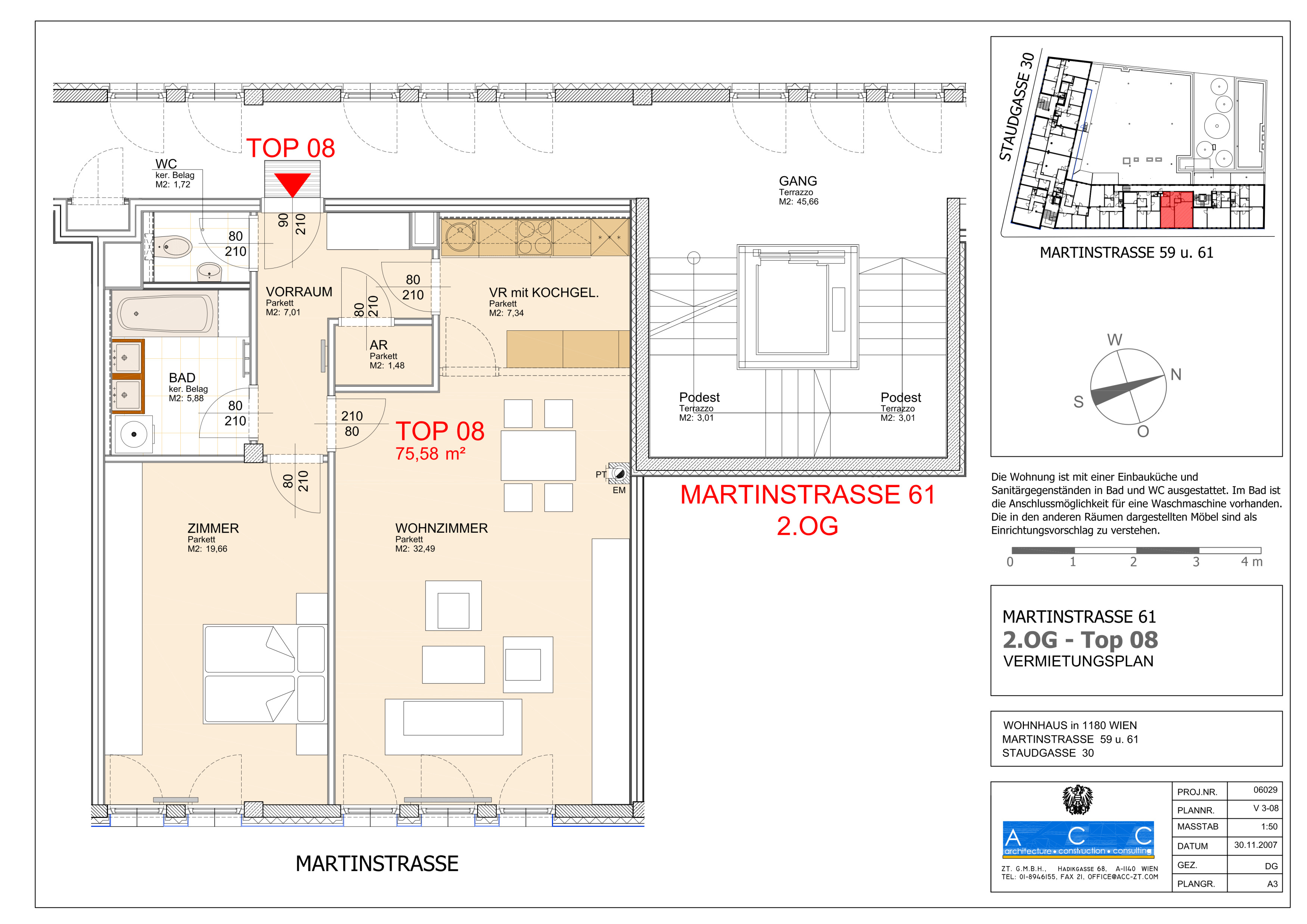 Die Wohnung verfügt über ein großzügige Vorzimmer, von dem aus die einzelnen Räume zentral begehbar sind. Ein separates WC sorgt für zusätzlichen Komfort.