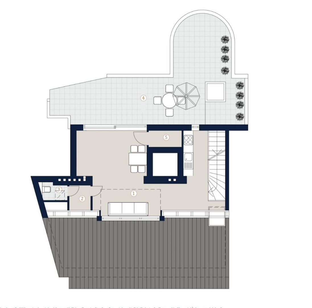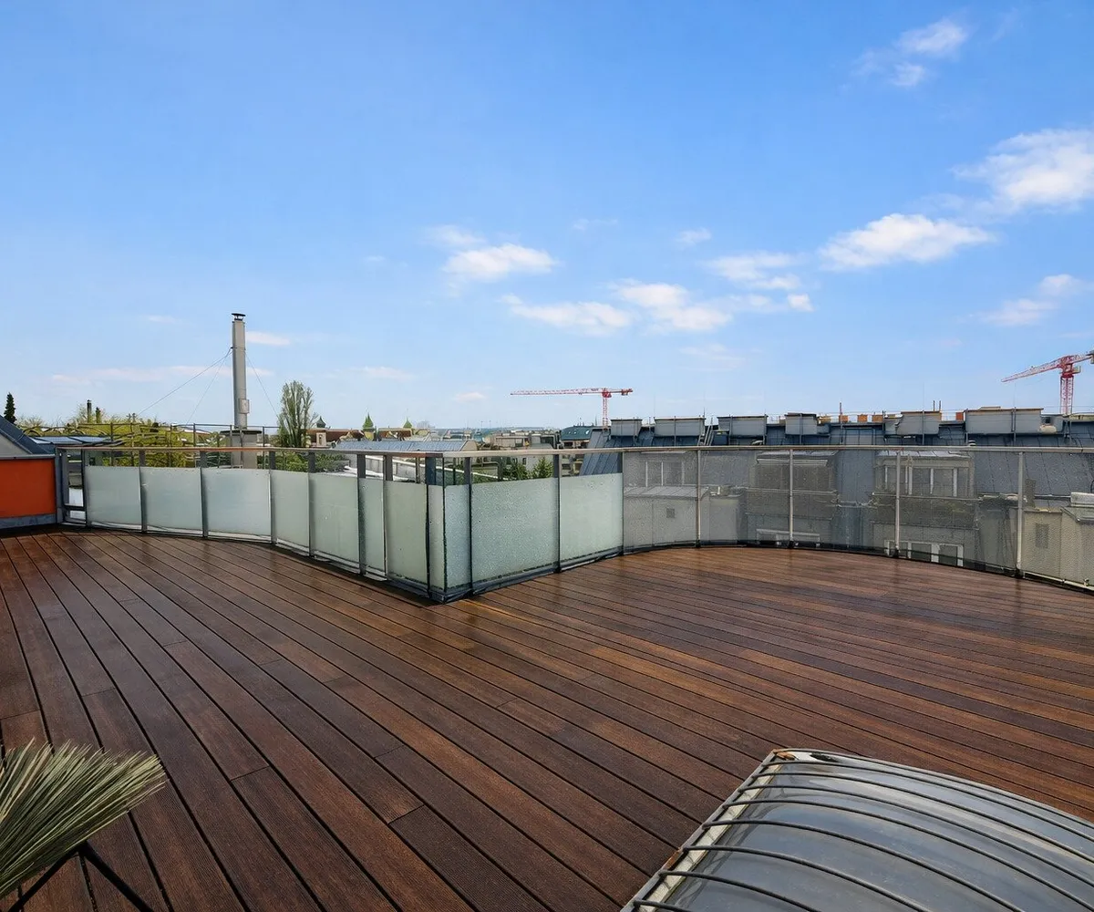 Die Dachterrasse bietet reichlich Platz für Lounge-Möbel, Grillbereich oder Urban Gardening – ein privates Outdoor-Wohnzimmer über der Stadt.