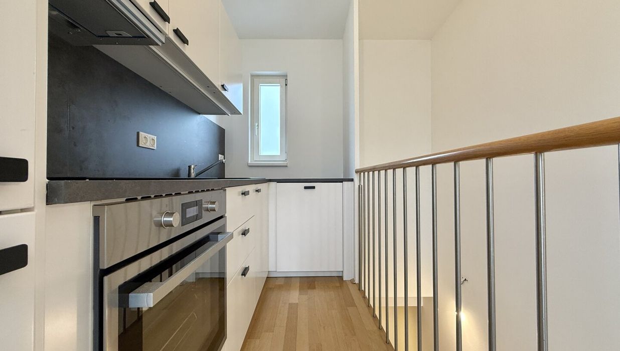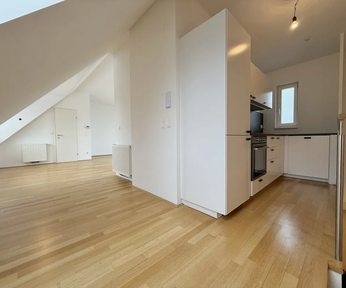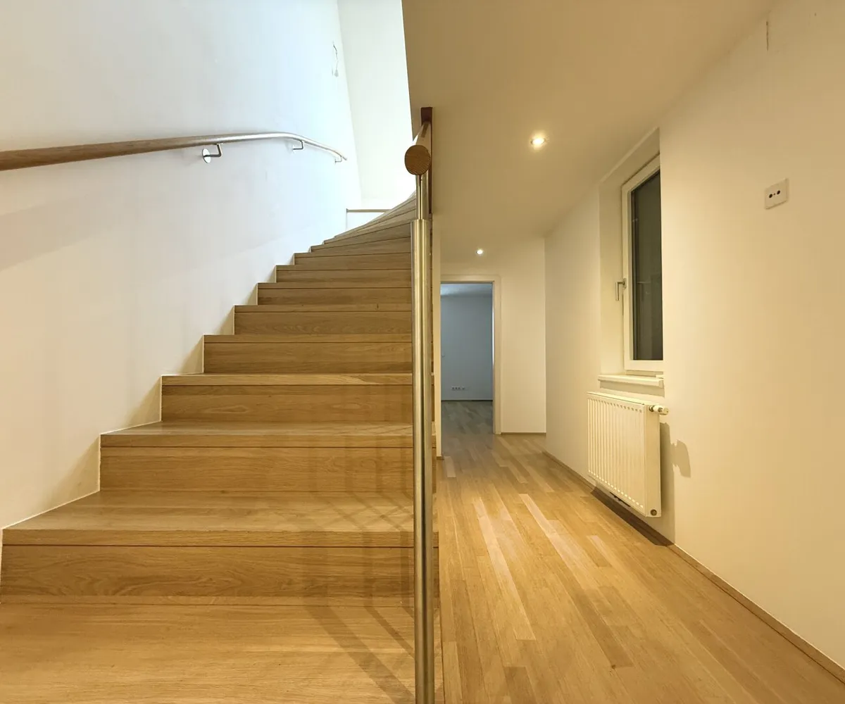 Diese außergewöhnliche Maisonette-Wohnung auf zwei Ebenen vereint modernes Design, großzügige Raumaufteilung und luxuriösen Wohnkomfort zu einem Zuhause der Extraklasse. Hochwertiger, heller Parkettboden zieht sich durch die gesamte Wohnung und schafft eine warme, elegante Atmosphäre.