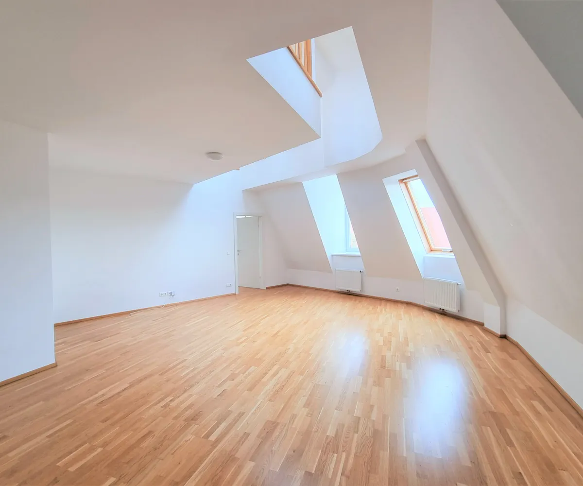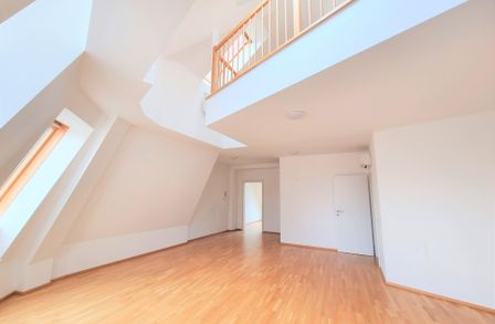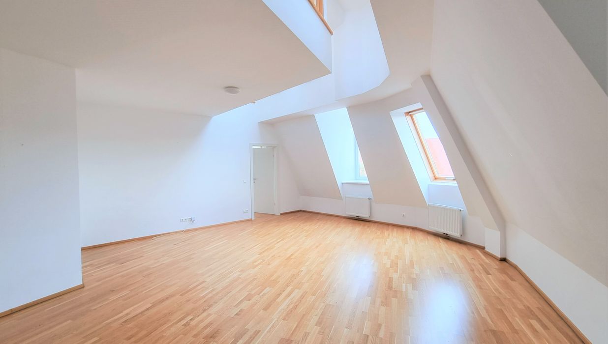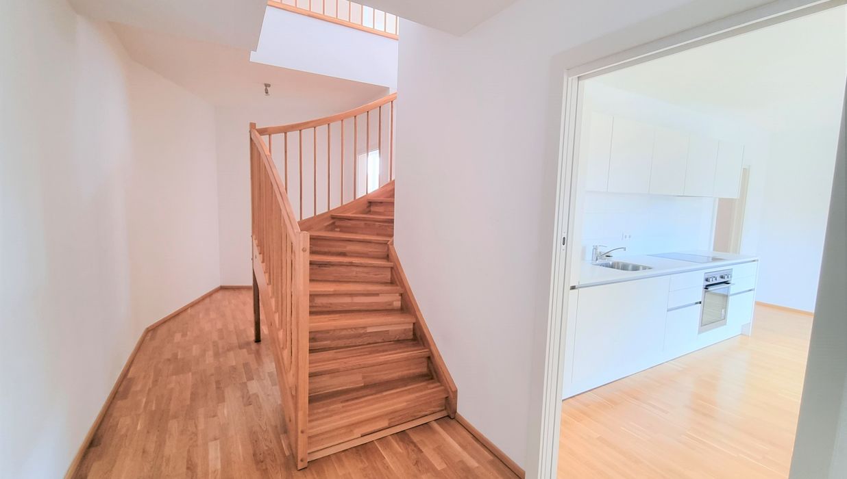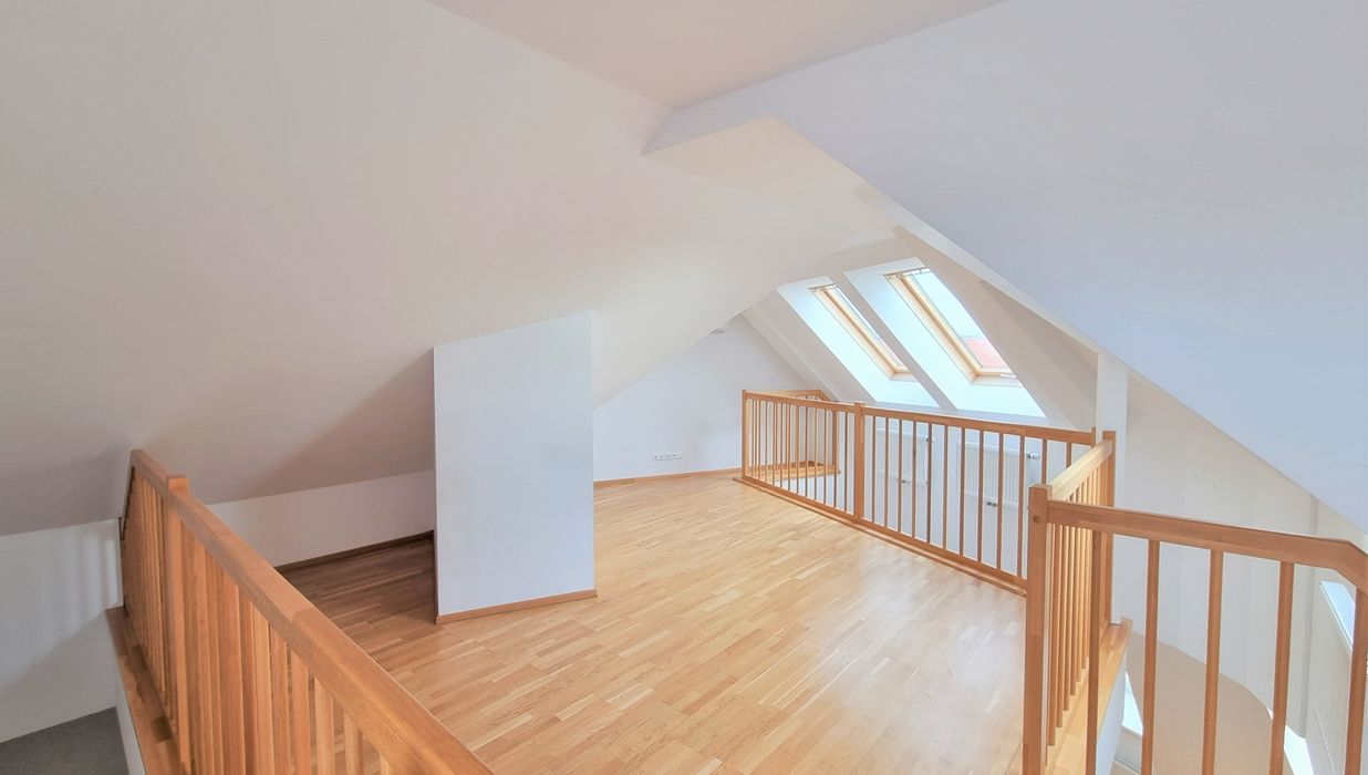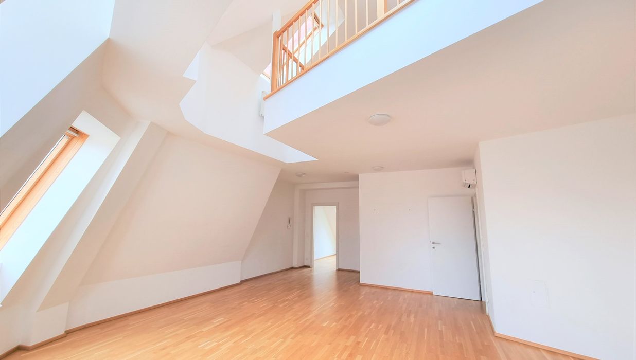 Die Wohnung selbst erstreckt sich über das 1. und 2. Dachgeschoß und verfügt über einen großzügigen Wohnraum, eine separate Küche, ein Schlafzimmer, eine Galerie, ein Badezimmer mit Badewanne, ein separates WC und zwei Abstellräume, einer davon mit Waschmaschinenanschluss. Eine große Terrasse lädt zum gemütlichen Beisammensein ein.
