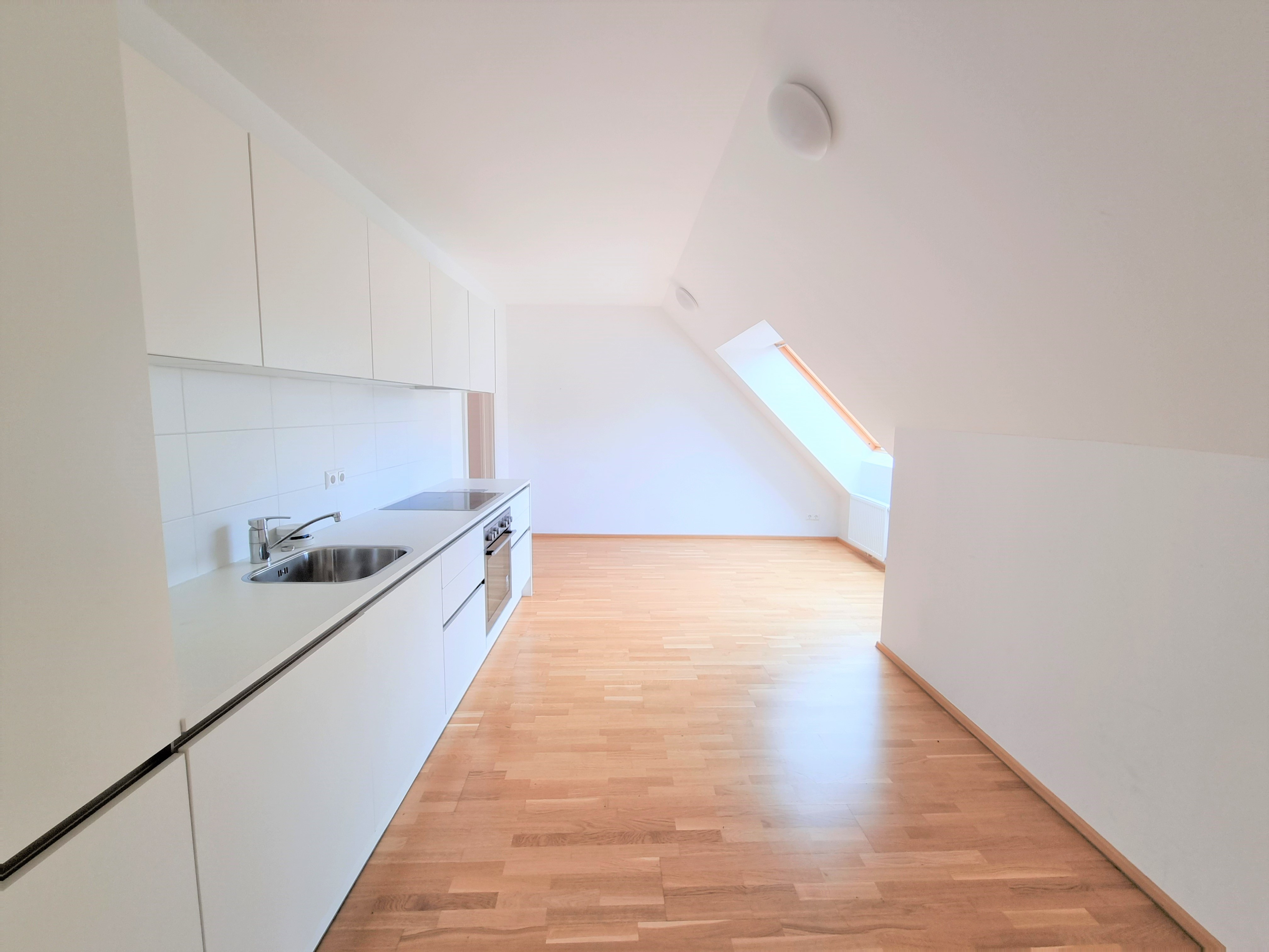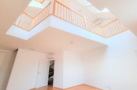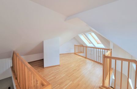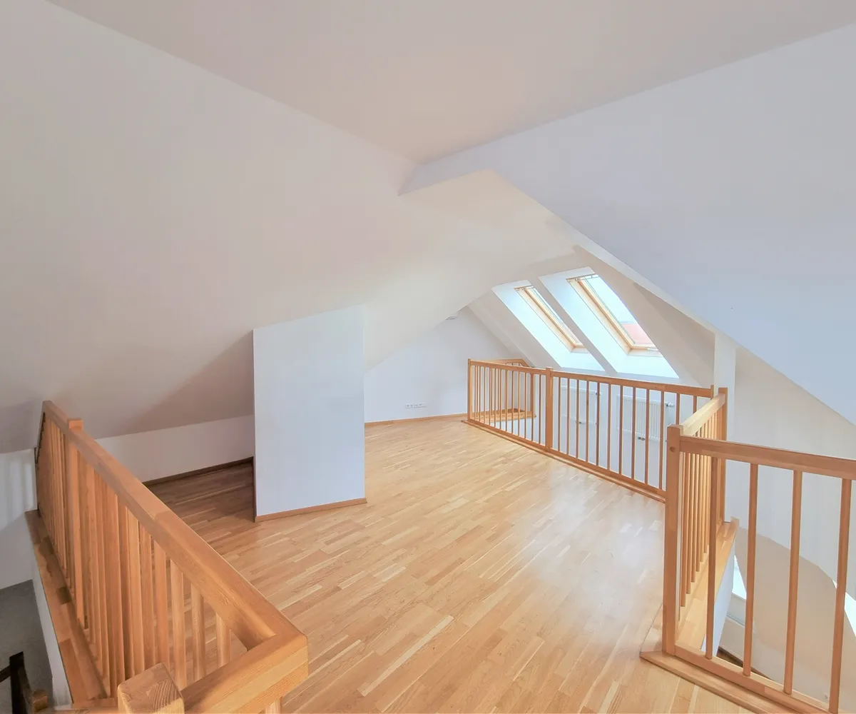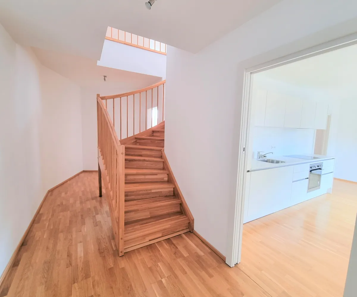 Die Wohnung selbst erstreckt sich über das 1. und 2. Dachgeschoß und verfügt über einen großzügigen Wohnraum, eine separate Küche, ein Schlafzimmer, eine Galerie, ein Badezimmer mit Badewanne, ein separates WC und zwei Abstellräume, einer davon mit Waschmaschinenanschluss. Eine große Terrasse lädt zum gemütlichen Beisammensein ein.