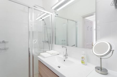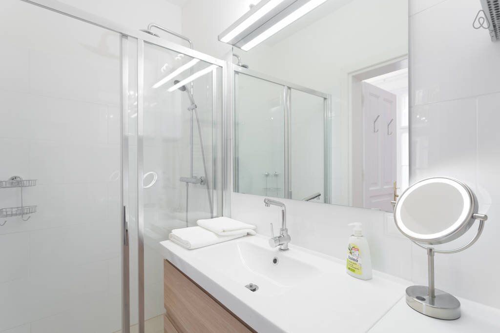 Im Badezimmer befindet sich eine Dusche, ein Waschtisch und ein großer Spiegel.