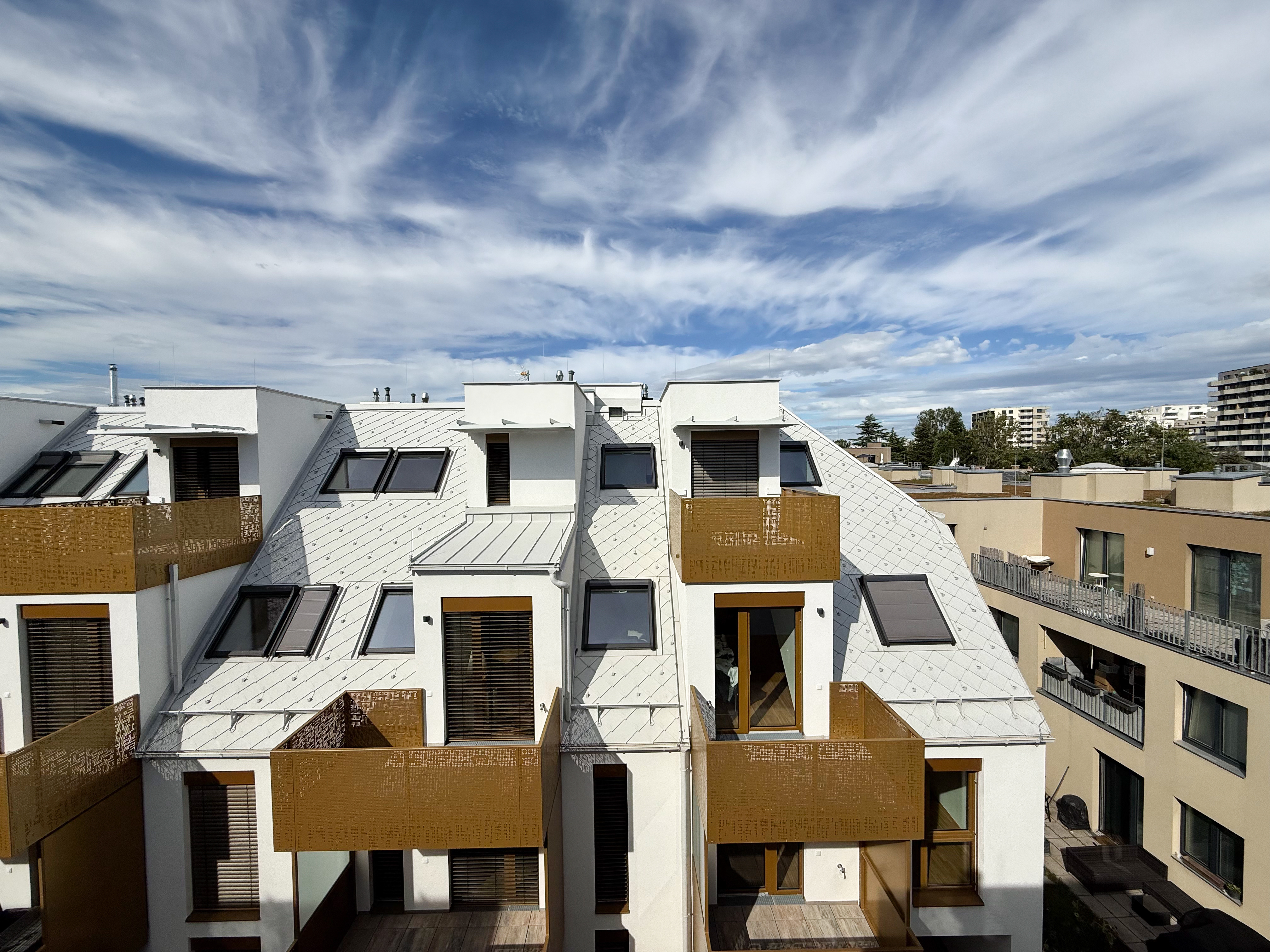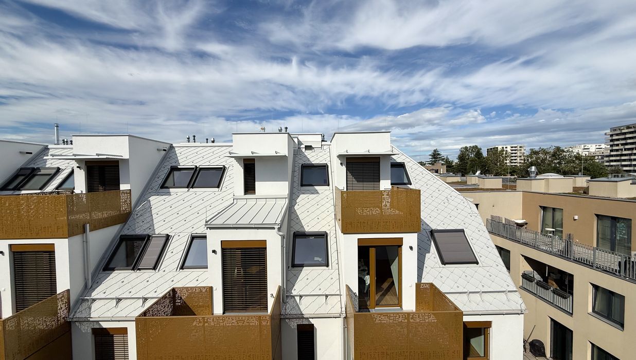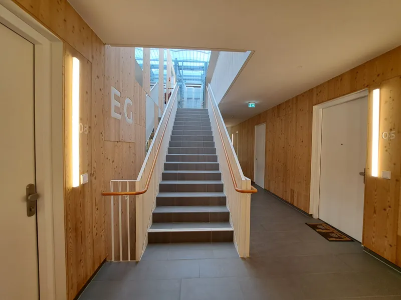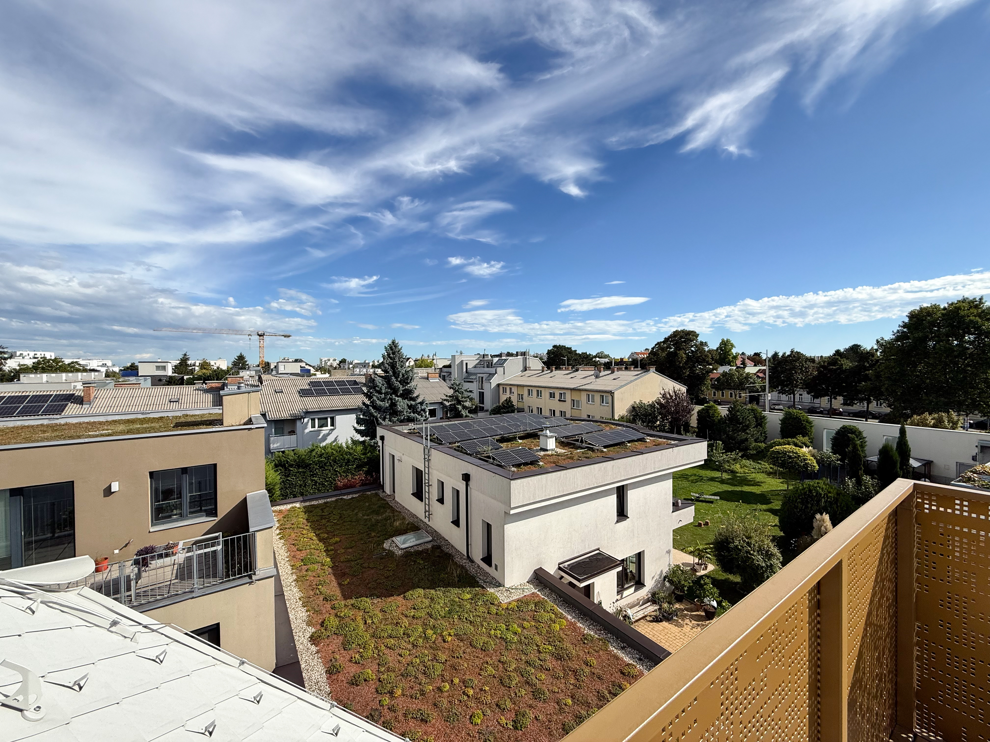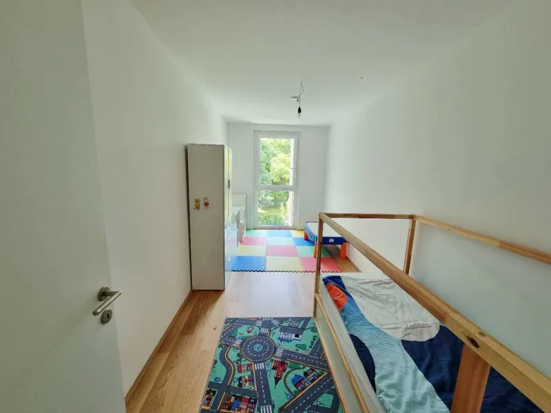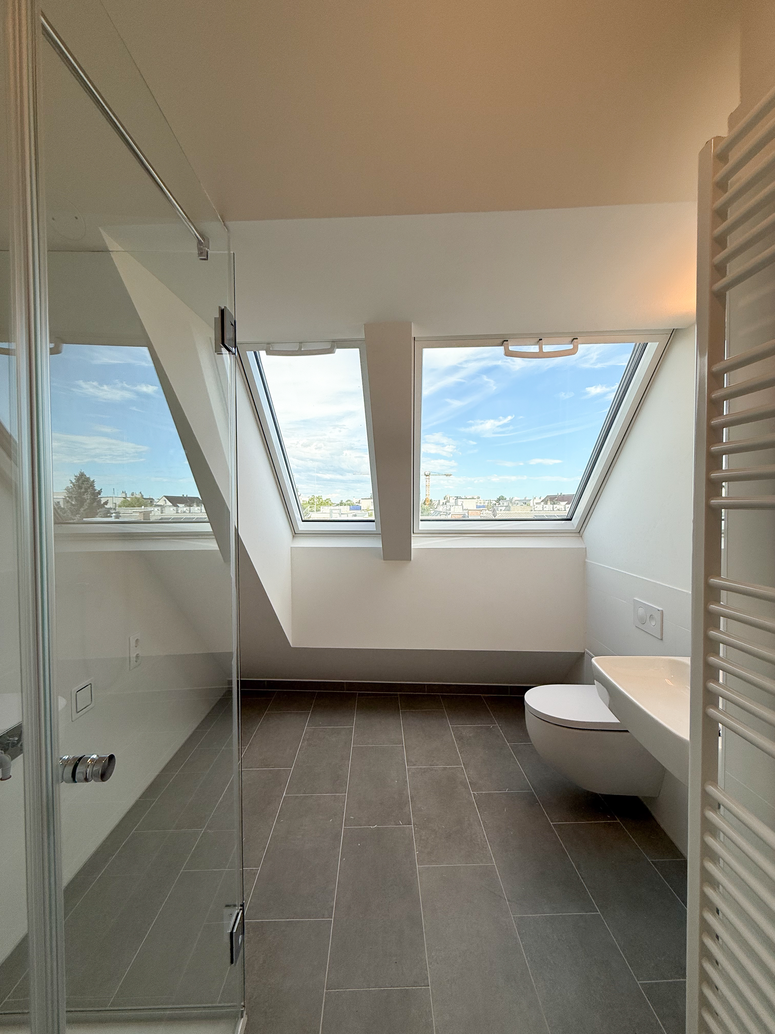 Die Wohnung ist mit hochwertigen Parkettböden in den Wohnräumen, modernen Fliesen in den Nassbereichen sowie zeitgemäßer Haustechnik ausgestattet. Großflächige Fensterflächen mit Sonnenschutz sorgen für helle Räume und ein angenehmes Wohngefühl. Das Gebäude verfügt außerdem über Fahrradabstellplätze , Kinderwagenräume und ein begrüntes Flachdach .