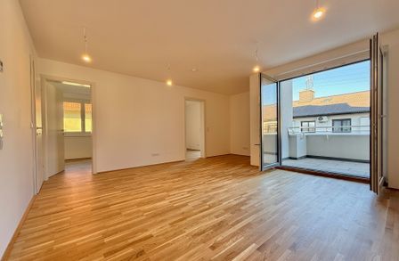 Die Wohnung liegt im 1. Liftstock und bietet ca. 55 m² Wohnfläche mit zentralem Vorraum, offener Wohnküche und zwei gut geschnittenen Schlafzimmern. Der Balkon mit ca. 8 m² ist von der Wohnküche aus begehbar.
