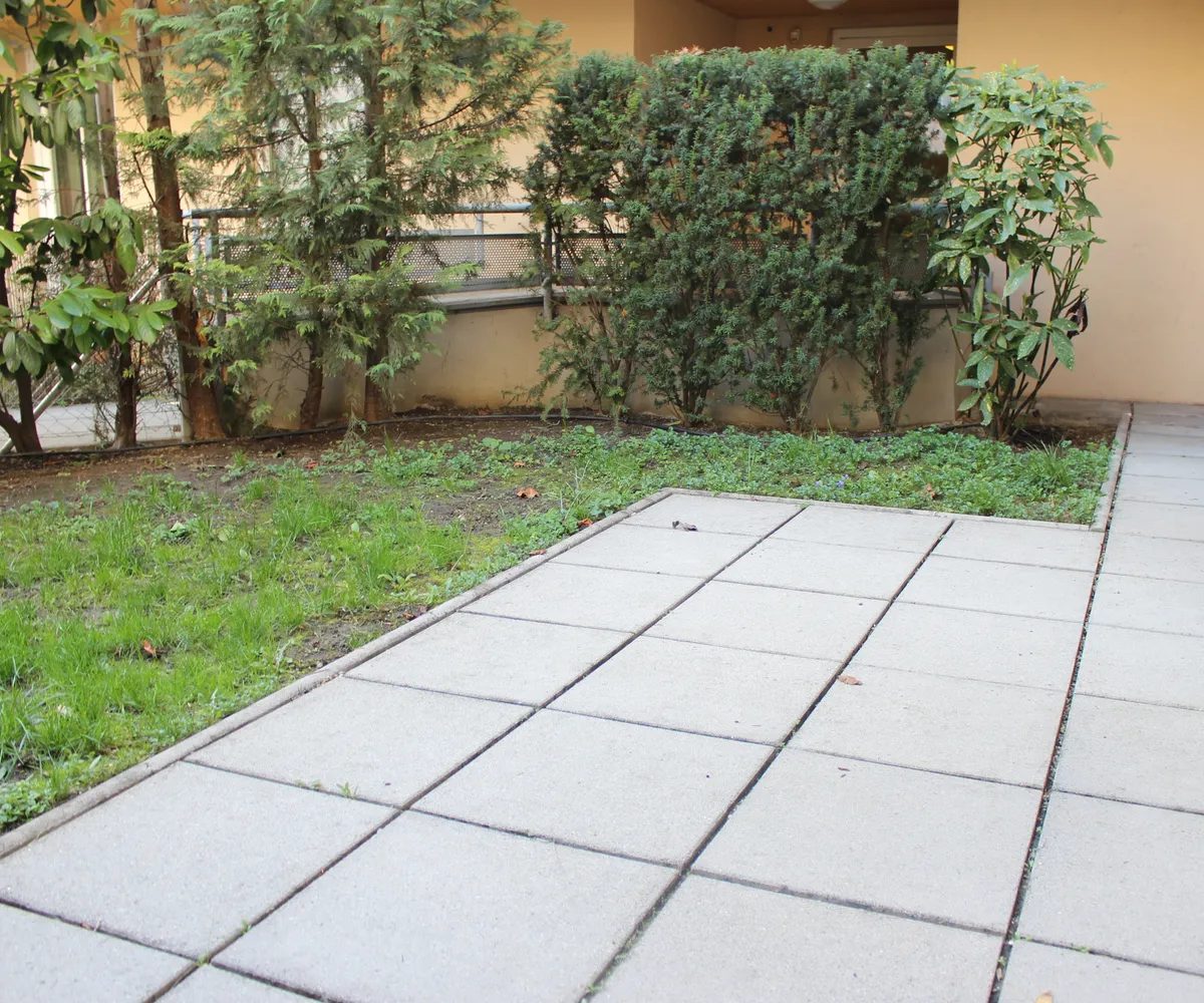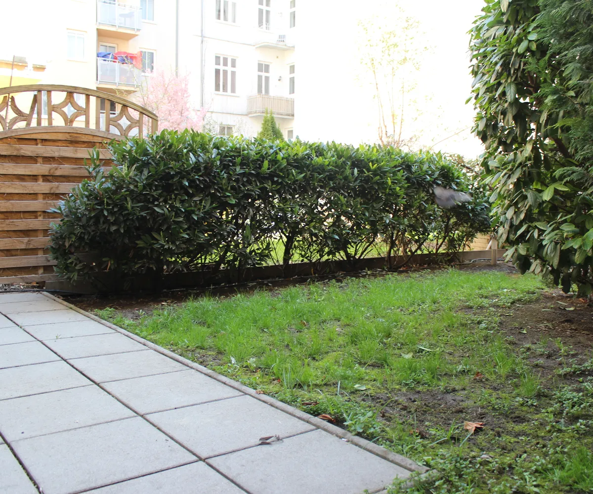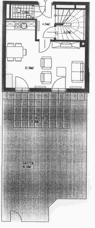 Die Maisonette-Wohnung befindet sich im Erdgeschoss und ist auf zwei Ebenen aufgeteilt. Im Erdgeschoss befindet sich eine großzügige Wohnküche mit Zugang auf die Terrasse und dem Garten, eine separate Toilette sowie ein Vorraum. Auf der zweiten Ebene befindet sich ein Schlafzimmer, ein Badezimmer mit Badewanne und WC.