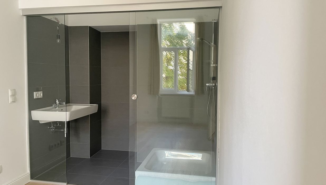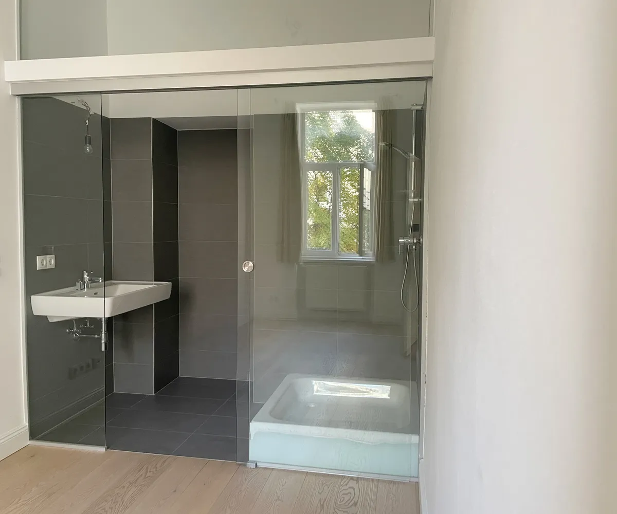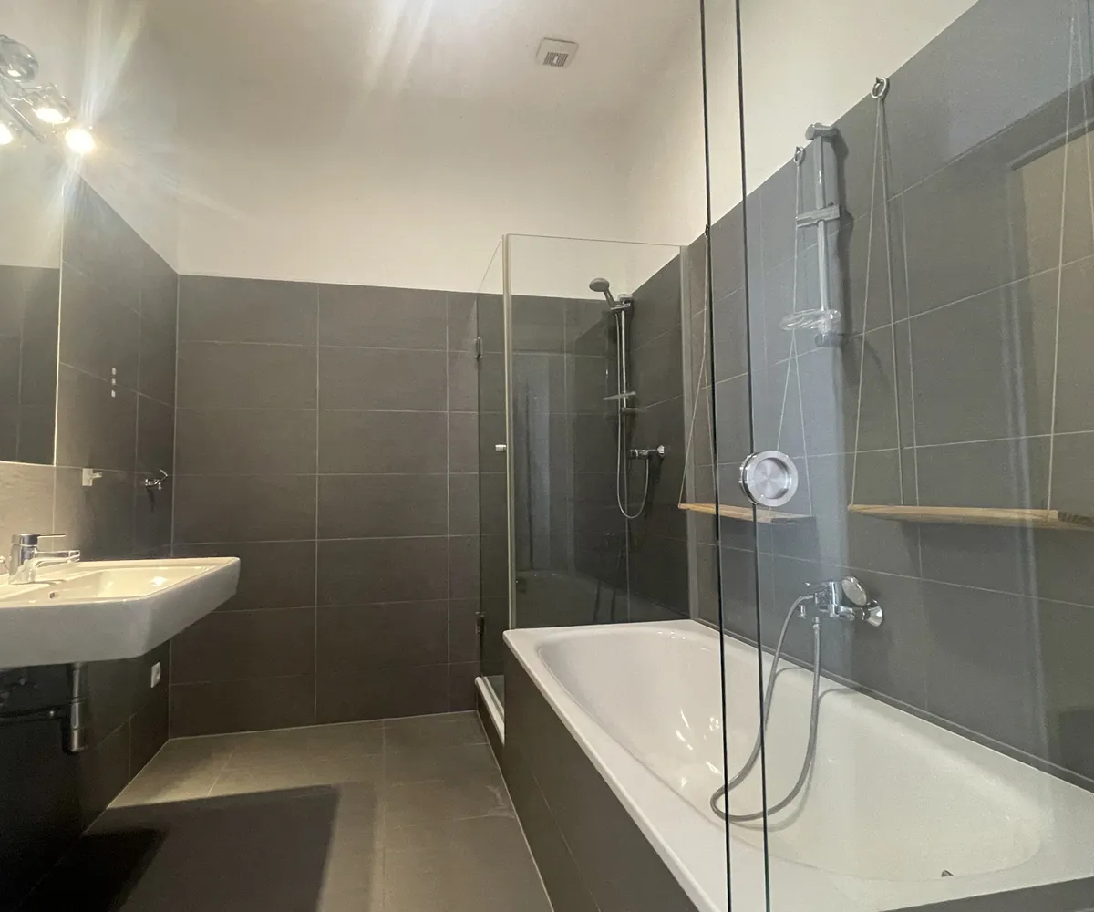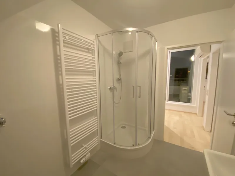Das kleinere Schlafzimmer verfügt über ein eigenes Duschbad en suite und schafft damit einen privaten Rückzugsbereich. Das große Badezimmer ist über einen dezent angelegten Zwischenraum sowohl mit dem Wohnbereich als auch mit dem großen Schlafzimmer verbunden und bietet mit Dusche und Badewanne ein hohes Maß an Komfort und Flexibilität.
