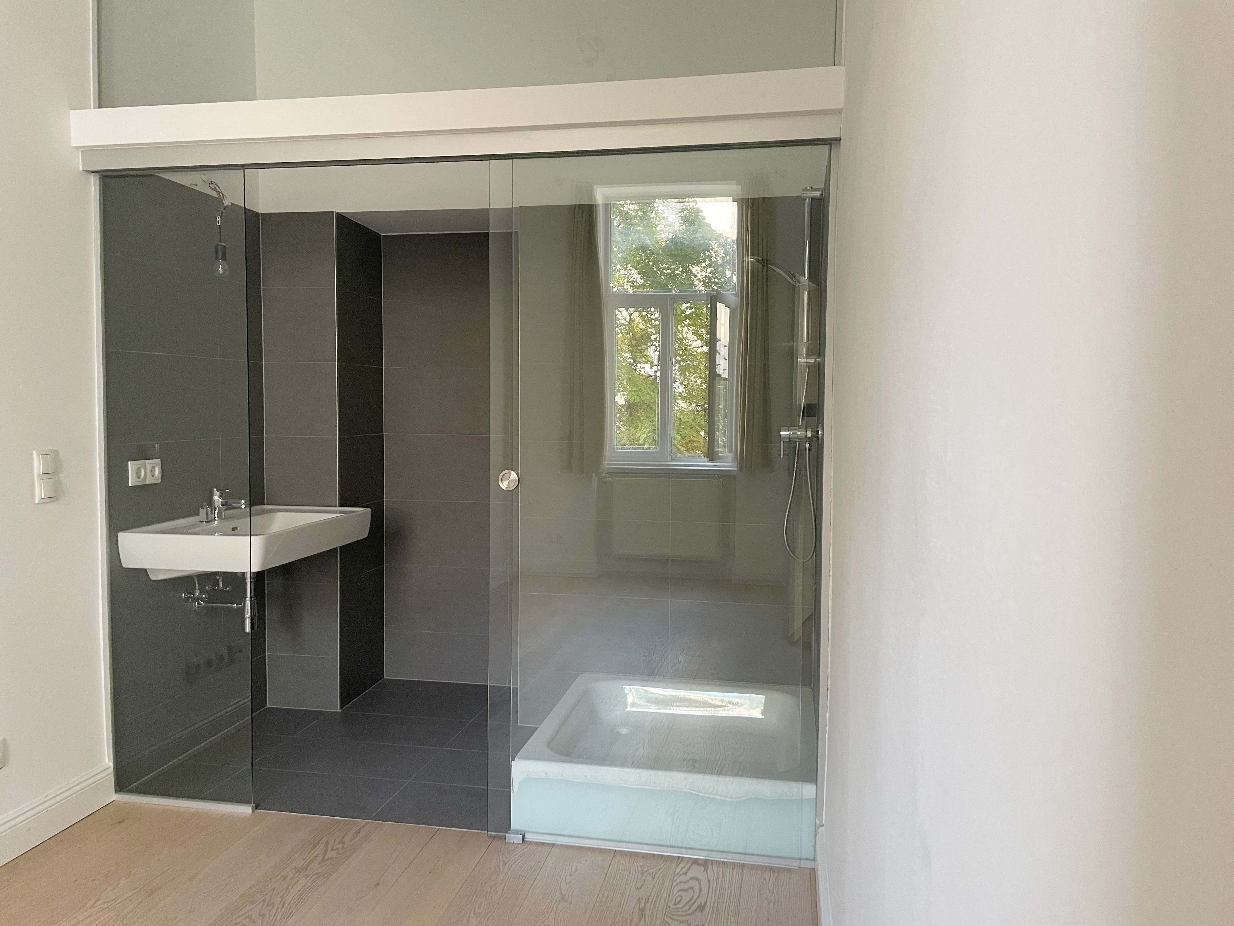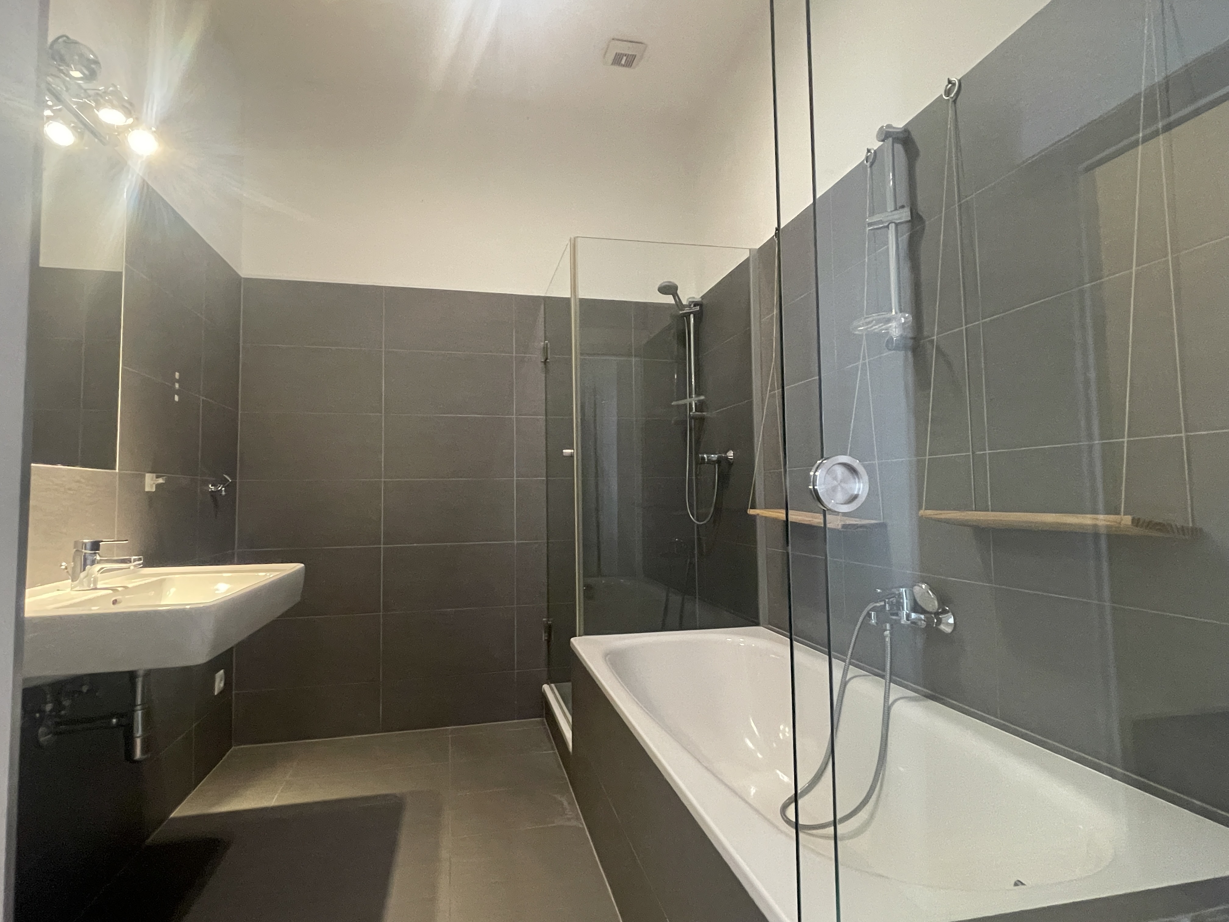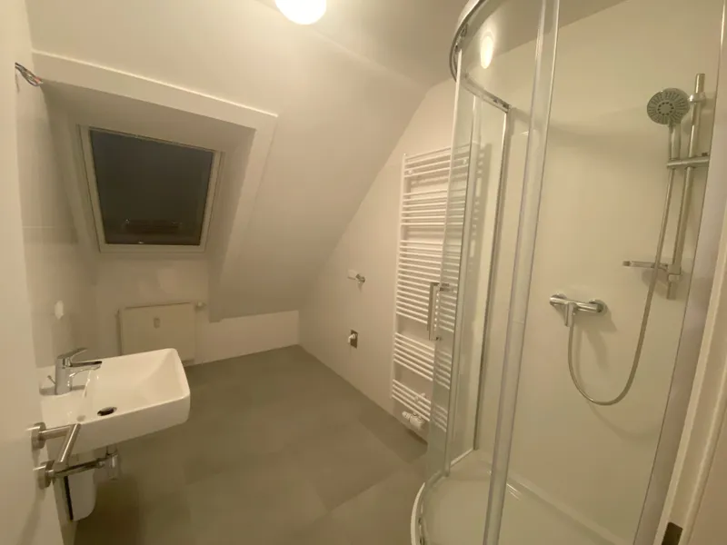 Das kleinere Schlafzimmer verfügt über ein eigenes Duschbad en suite und schafft damit einen privaten Rückzugsbereich. Das große Badezimmer ist über einen dezent angelegten Zwischenraum sowohl mit dem Wohnbereich als auch mit dem großen Schlafzimmer verbunden und bietet mit Dusche und Badewanne ein hohes Maß an Komfort und Flexibilität.