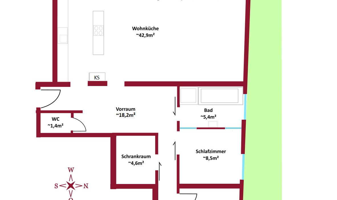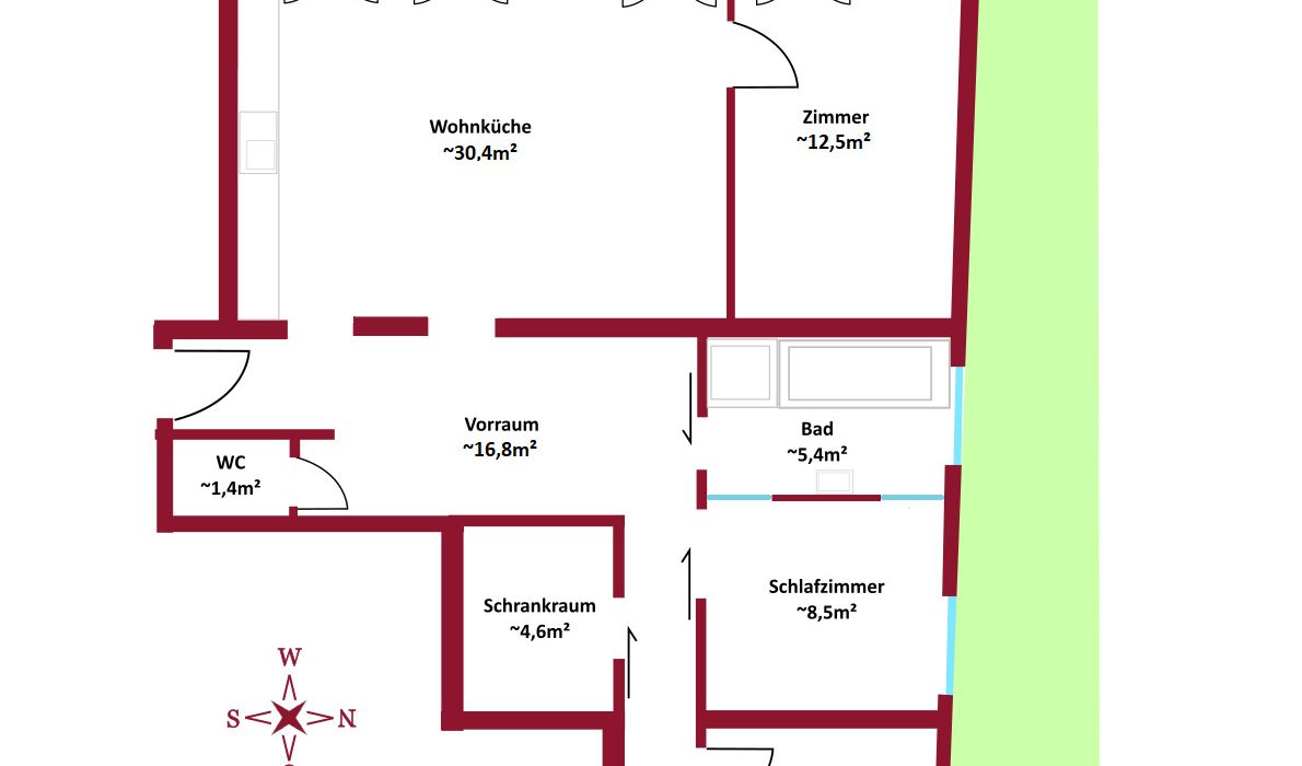 Gestaltungsmöglichkeiten: Aktuell verfügt die Wohnung über 3 Zimmer . Durch Adaptierungsarbeiten lässt sich rasch ein viertes Zimmer dazugewinnen. (s. Alternativplan)