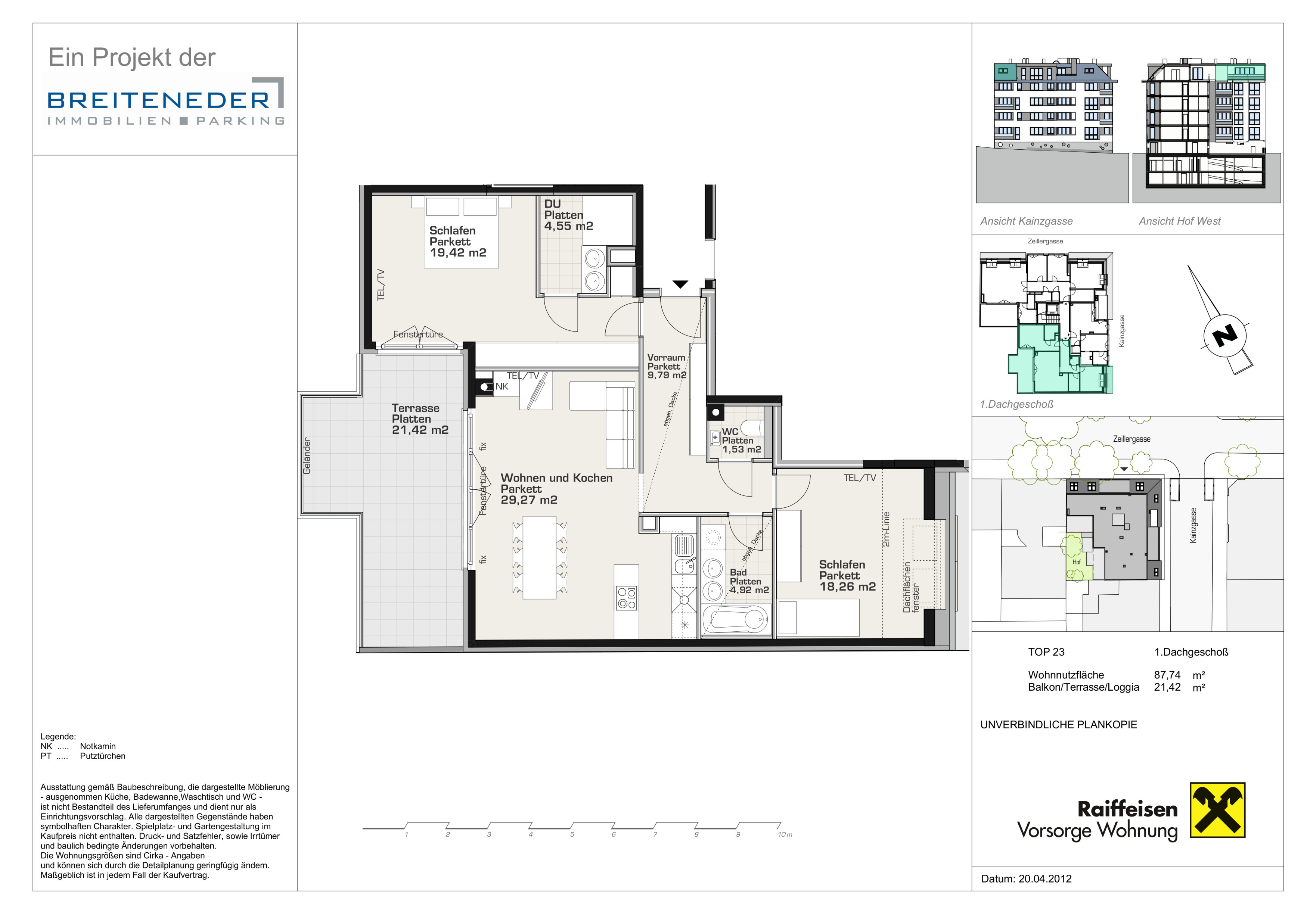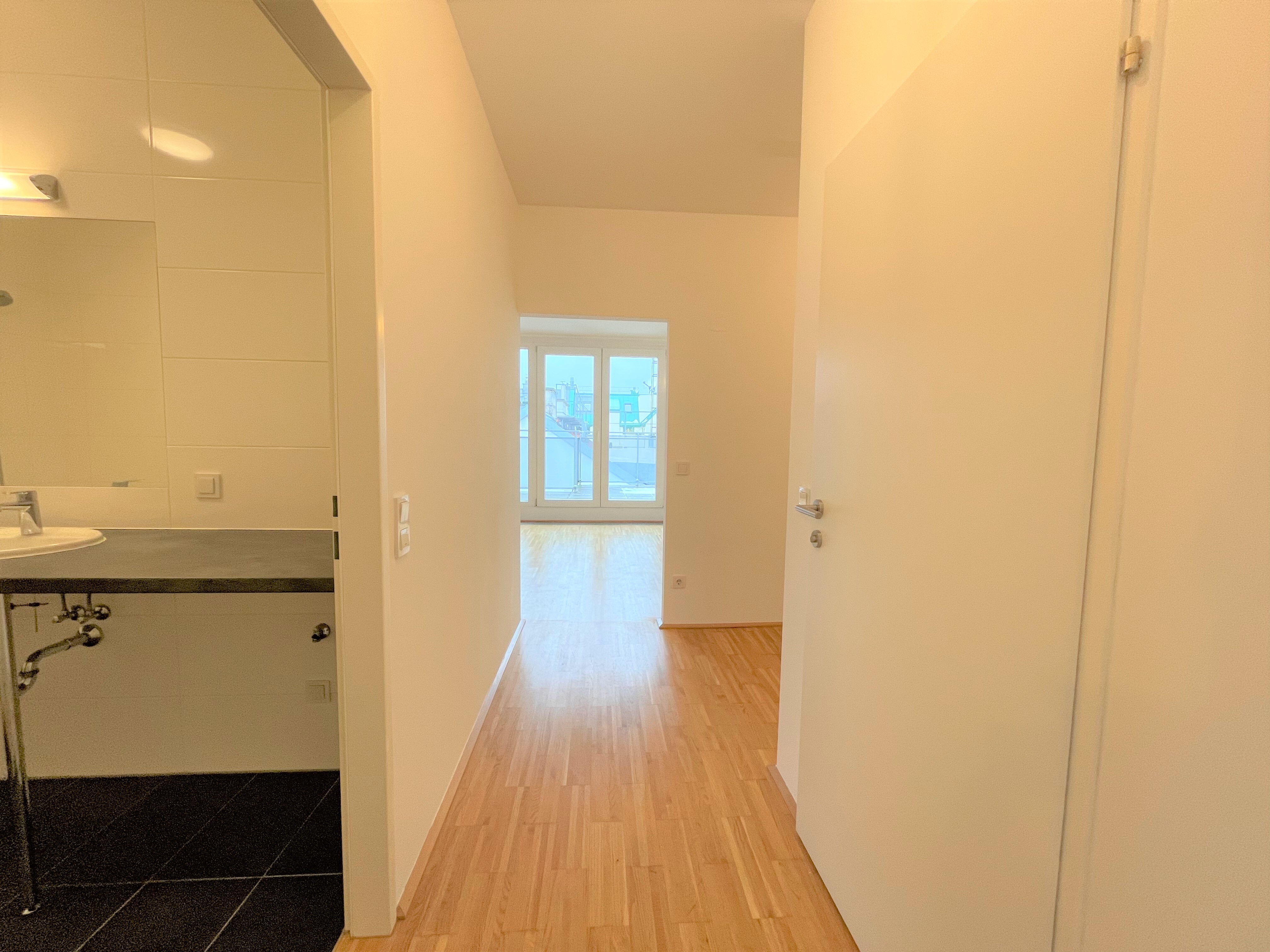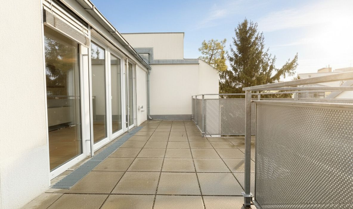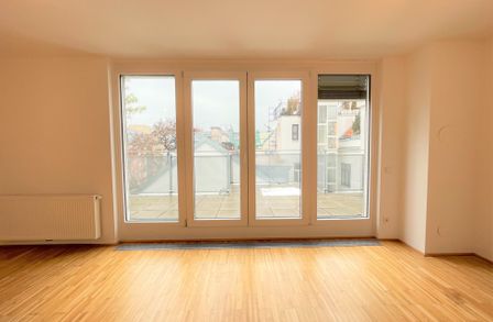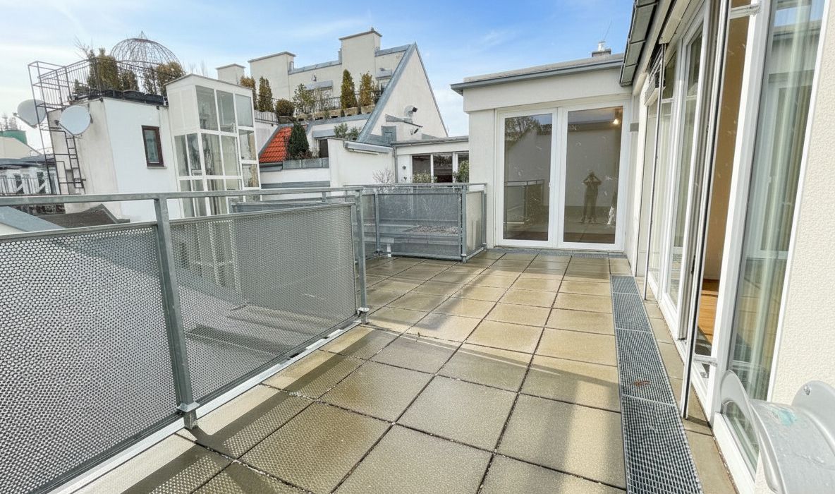 Sie verfügt über eine geräumige Wohnküche, ein großzügig angelegtes Schlafzimmer mit Bad en suite. Beide Räume habe direkten Zugang auf die hofseitige nach Westen ausgerichtete Dachterrasse mit ca. 22m².