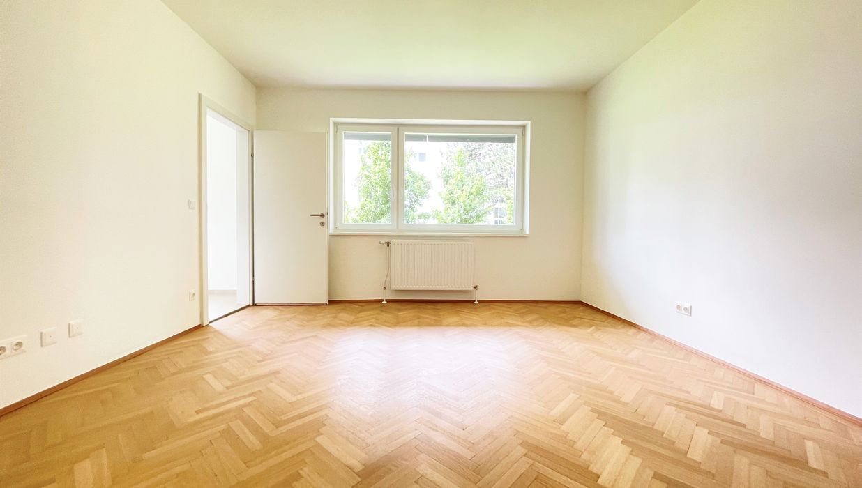 Die Wohnung befindet sich im Erdgeschoss und verfügt über einen geräumigen Wohnraum, eine Einbauküche, zwei Schlafzimmer, ein Badezimmer mit Badewanne, ein separates WC, einen Abstellraum sowie einen Vorraum.
