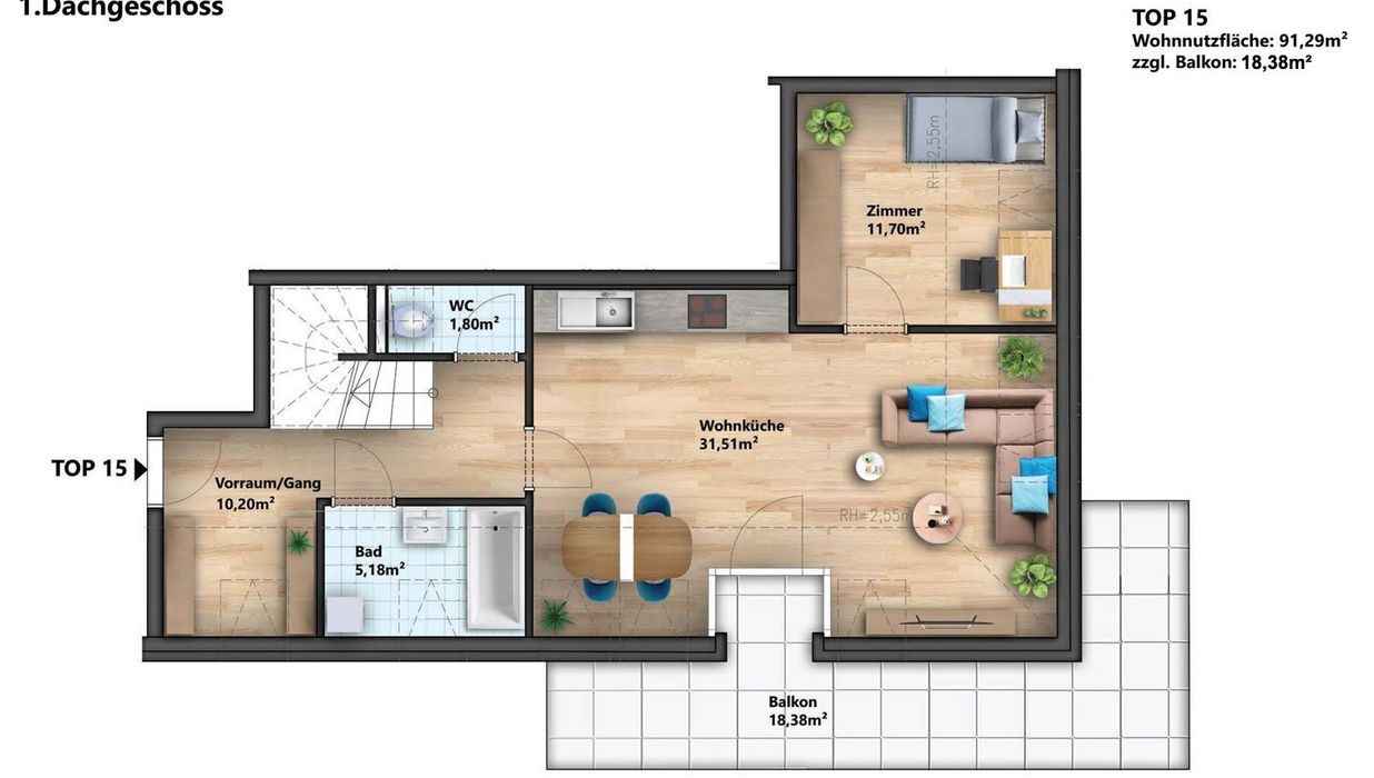 Die Wohnfläche von ca. 91,3m² verteilt sich über die folgenden Räumlichkeiten: