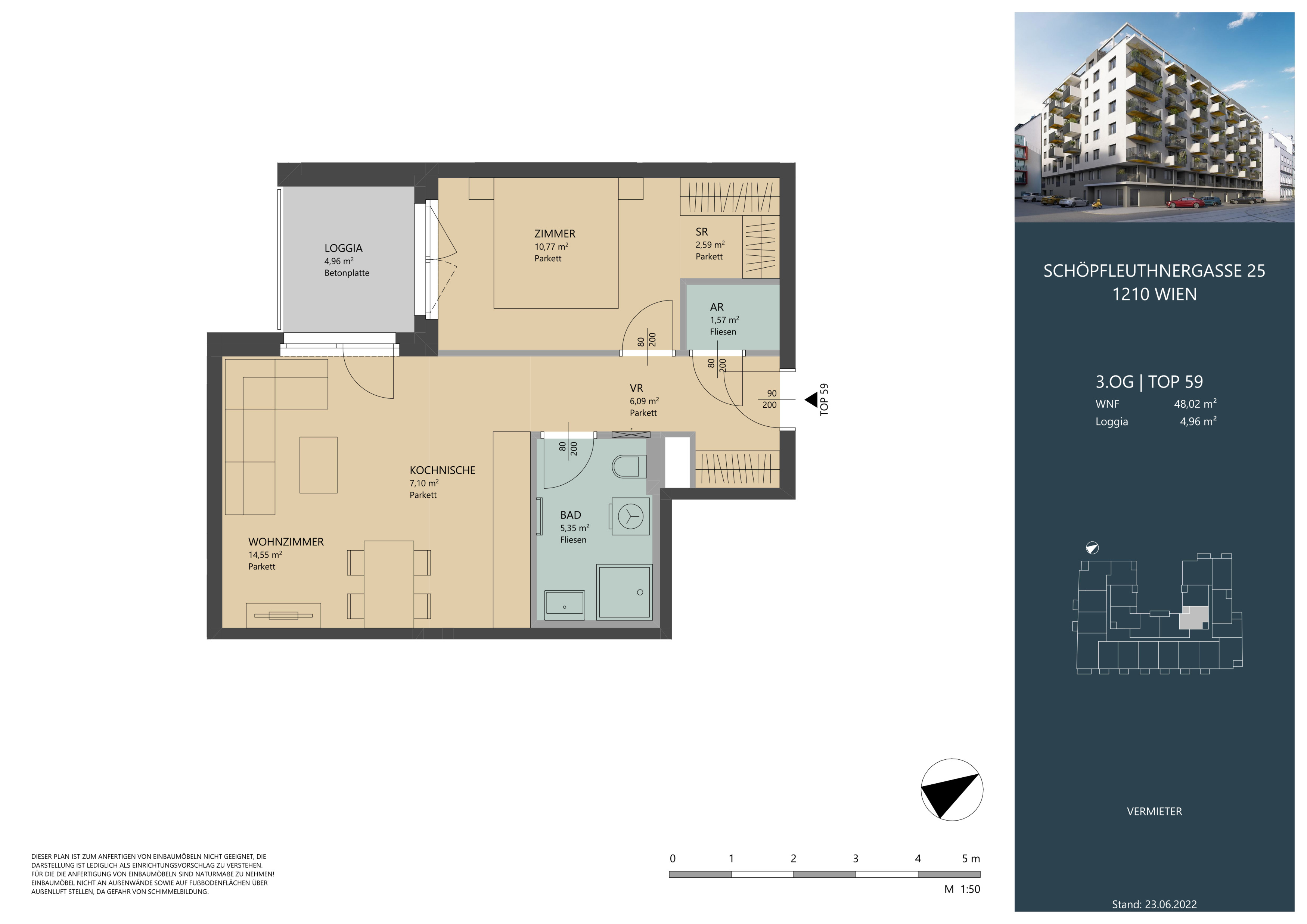 Die Wohnung befindet sich in der 3. Etage und verfügt über eine großzügige Wohnküche mit vollausgestatteter Einbauküche, ein Schlafzimmer, ein Badezimmer mit Dusche, Toilette und Waschmaschinenanschluss, sowie einen Abstellraum und einen Vorraum.
