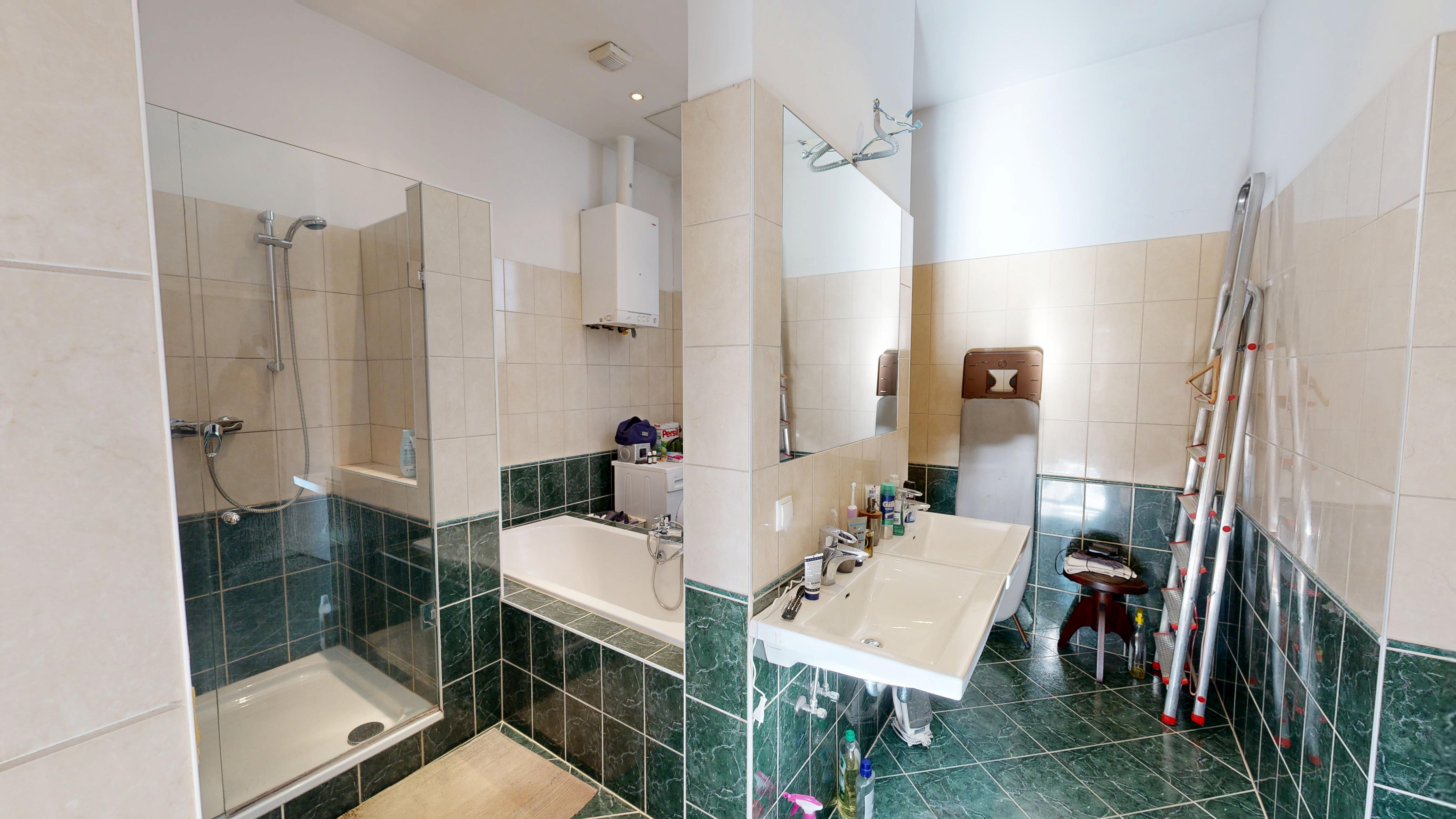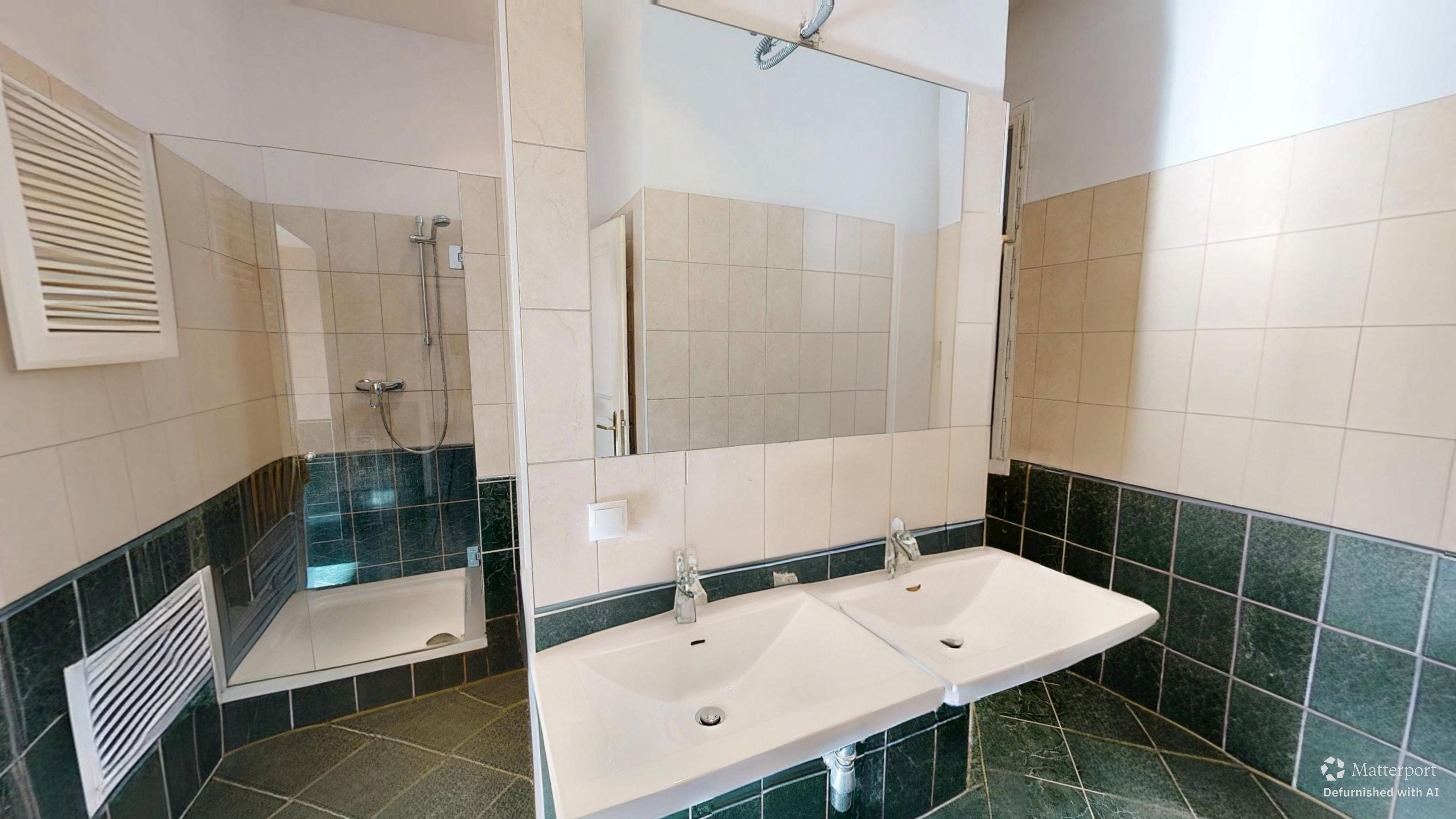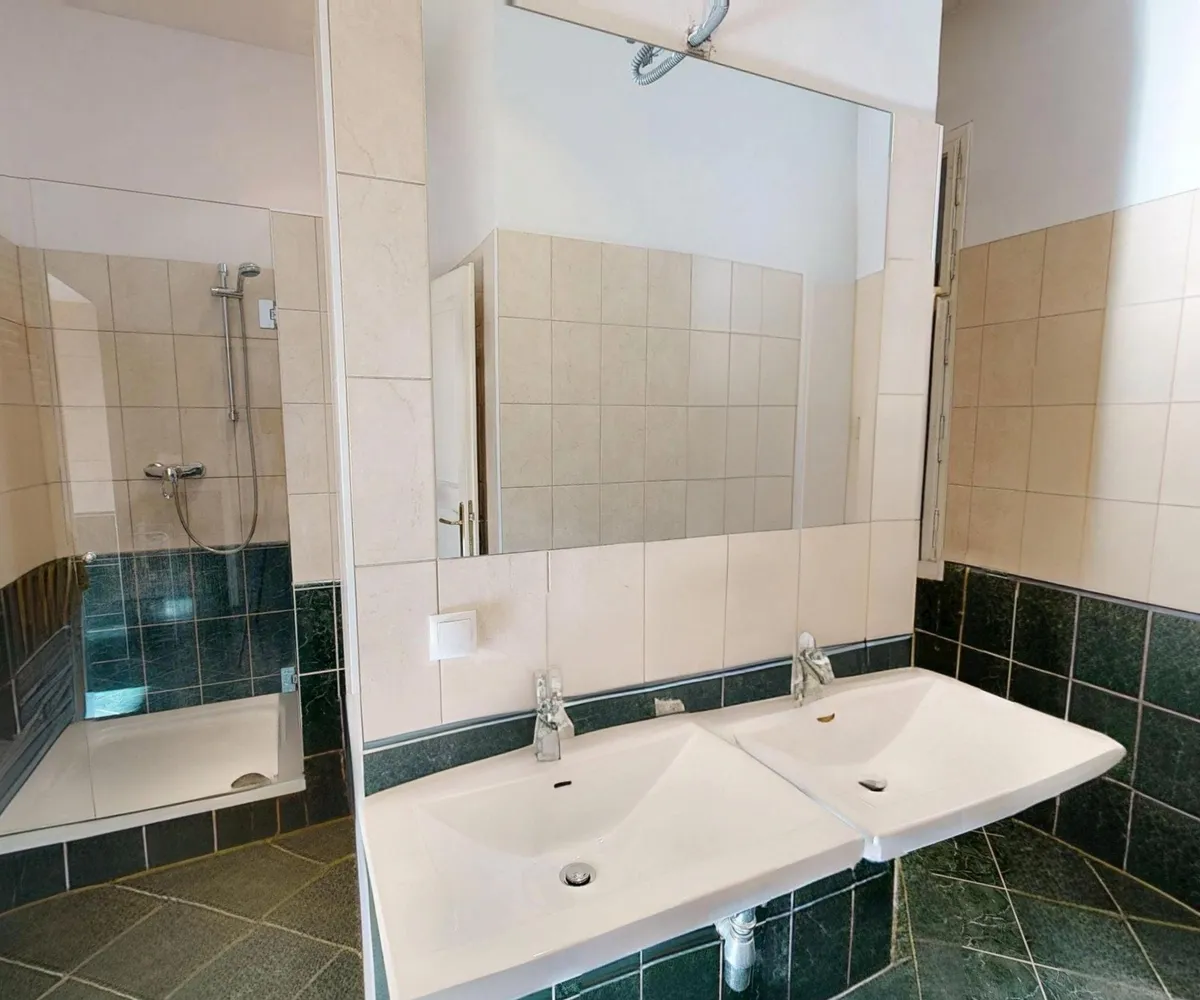 Eine weitere Tür führt in das außergewöhnlich großzügige Badezimmer, das mit Badewanne, Dusche, zwei Handwaschbecken, Waschmaschinenanschluss und Fenster ausgestattet ist – ein Raum, der sowohl funktional als auch komfortabel gestaltet werden kann.