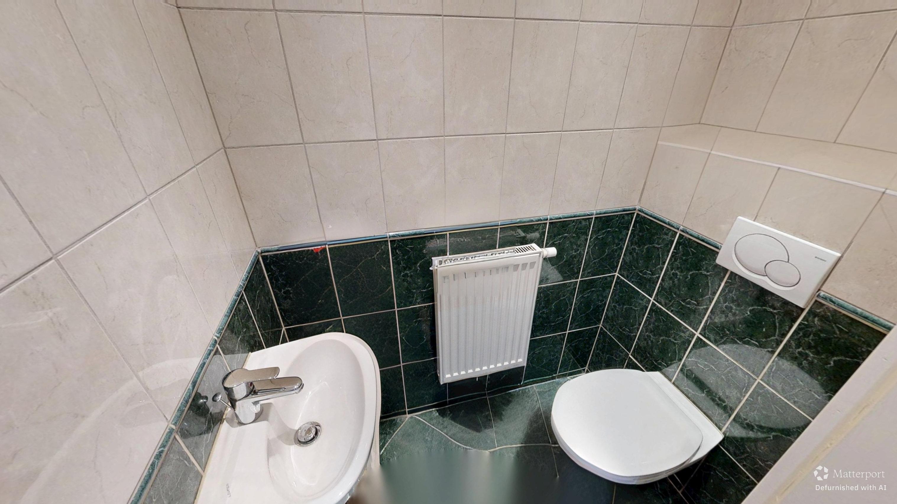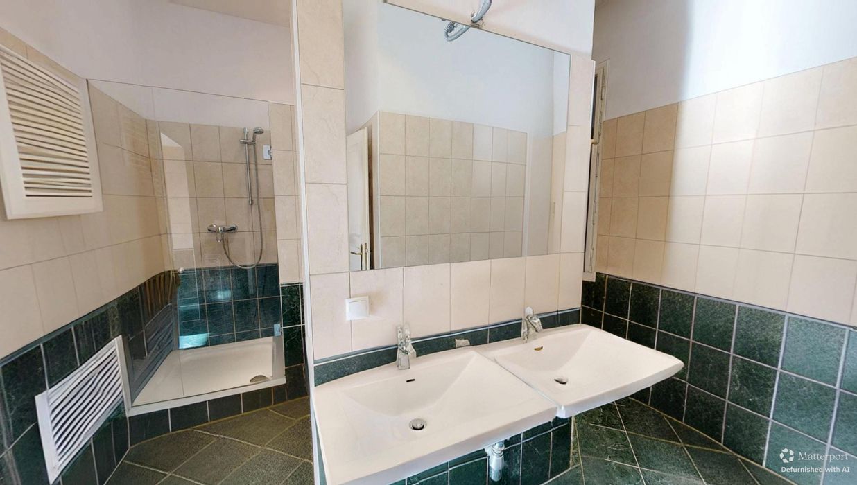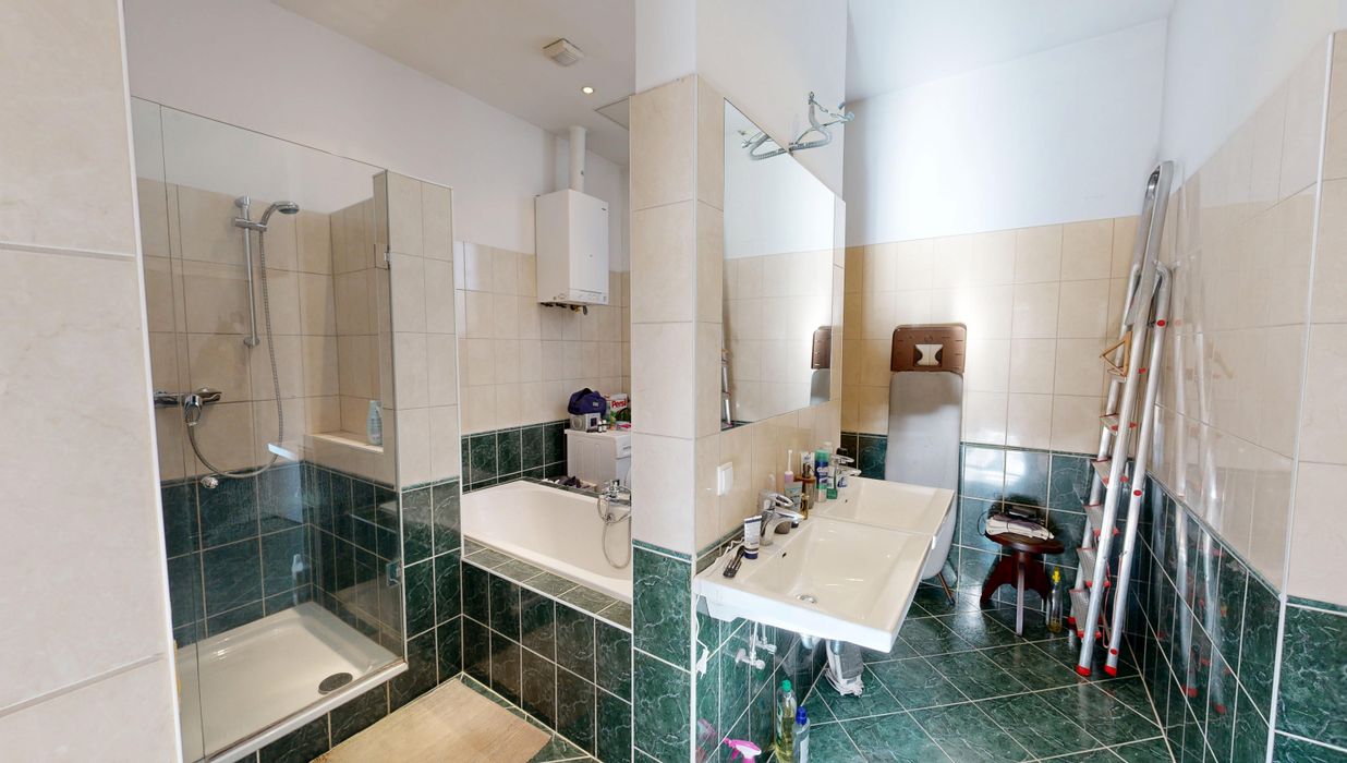 Eine weitere Tür führt in das außergewöhnlich großzügige Badezimmer, das mit Badewanne, Dusche, zwei Handwaschbecken, Waschmaschinenanschluss und Fenster ausgestattet ist – ein Raum, der sowohl funktional als auch komfortabel gestaltet werden kann.