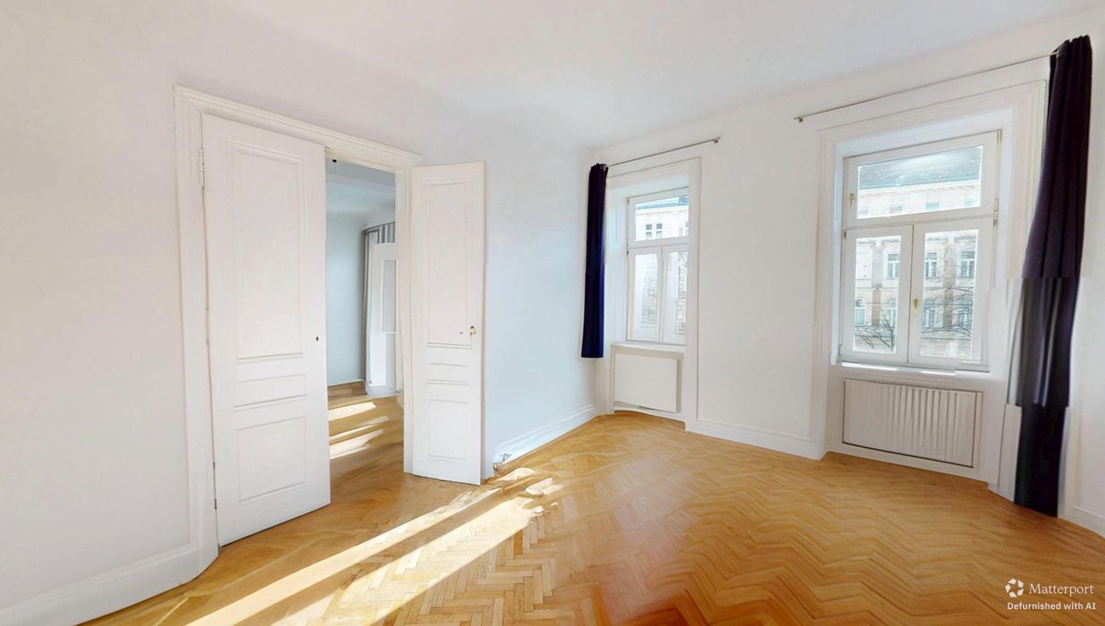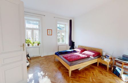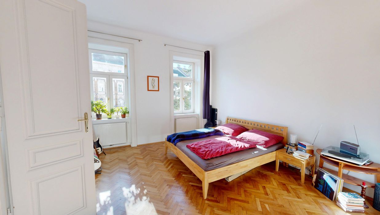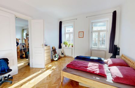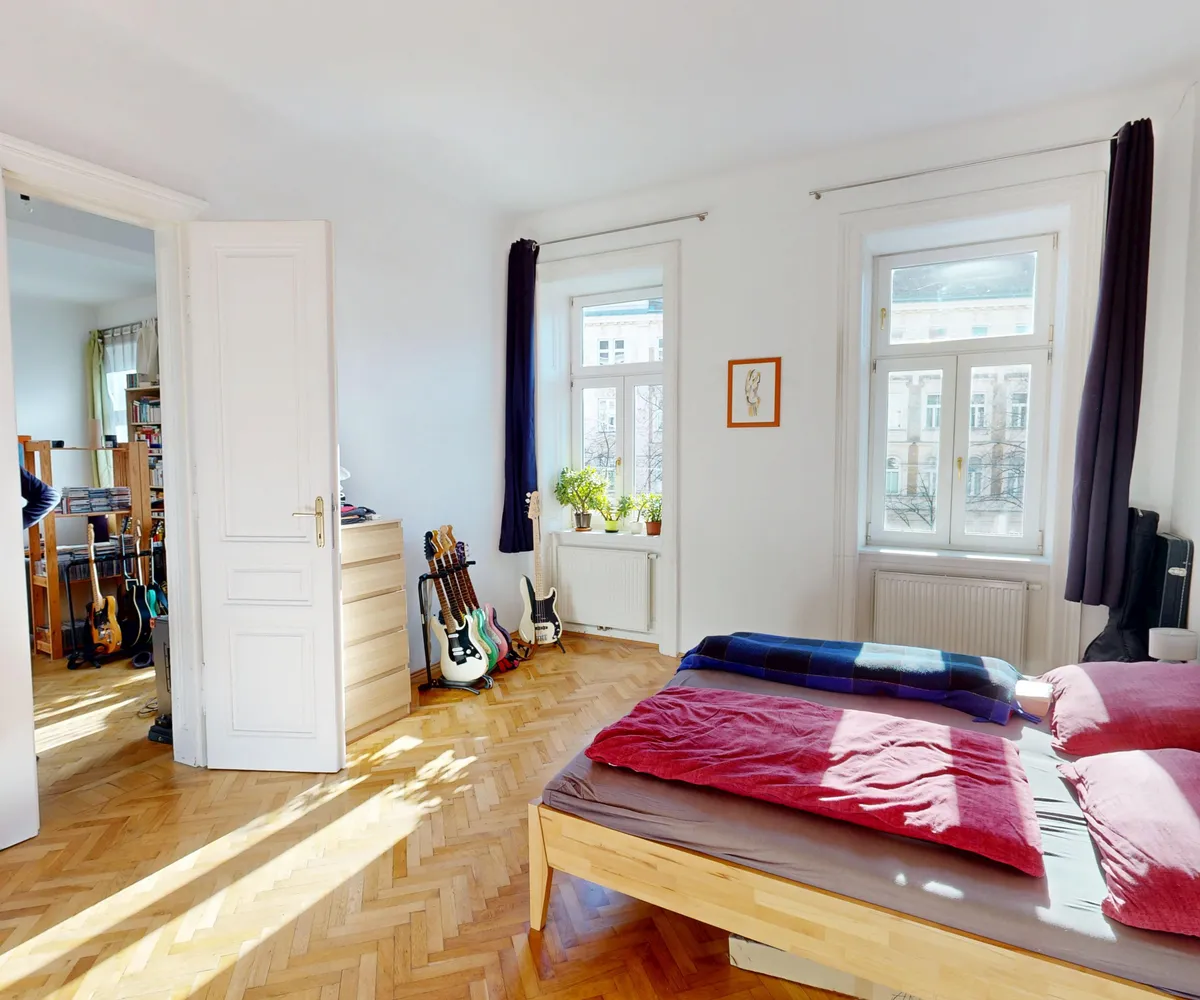 Das rund 20 m² große Schlafzimmer ist sowohl über das Badezimmer als auch über das Wohnzimmer zugänglich und überzeugt mit klassischem Wiener Fischgrätparkett, einer Raumhöhe von etwa 3,30 Metern und angenehmer Proportion. Die hohen Decken und großen Fenster unterstreichen den typischen Altbaucharakter.