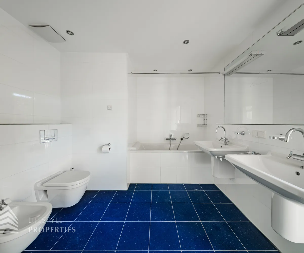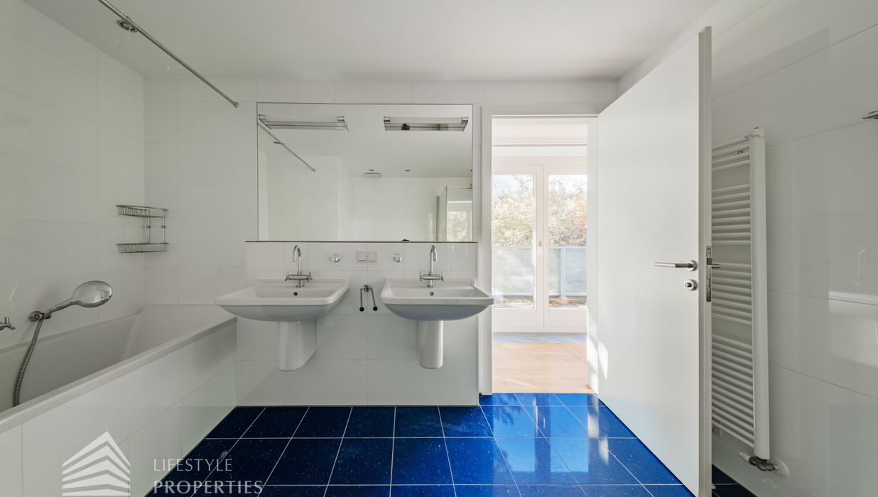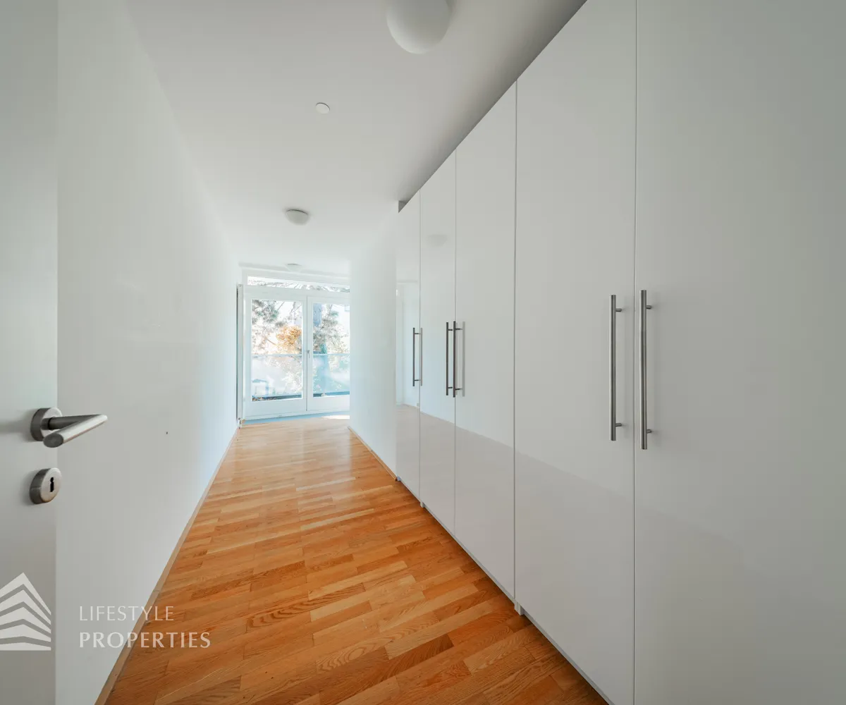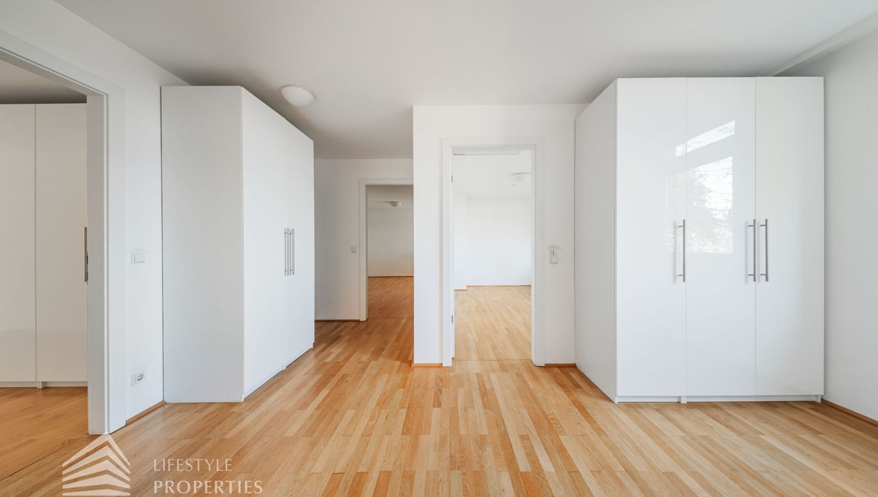 Sie betreten die Wohnung und befinden sich im Vorraum, der direkten Zugang zum großen Wohnraum bietet, von hier gelangen Sie auf einen der Balkone. Links durch den Vorraum gelangen Sie zur Küche und zu einem der Zimmer. Weiter im Gang befindet sich rechts eines der Badezimmer, welches mit einer Badewanne, einem Waschbecken und einem WC ausgestattet ist. Geradeaus gelangen Sie zu weiteren zwei der Zimmer und zum Wirtschaftsraum. Links gelangen Sie zum Master-Bedroom mit en-suite Badezimmer und Zugang zu einem Balkon. Von hier gelangt man außerdem auf die Terrasse und den schönen Garten. Im Vorraum befindet sich außerdem zwei Abstellräume und das separate WC.