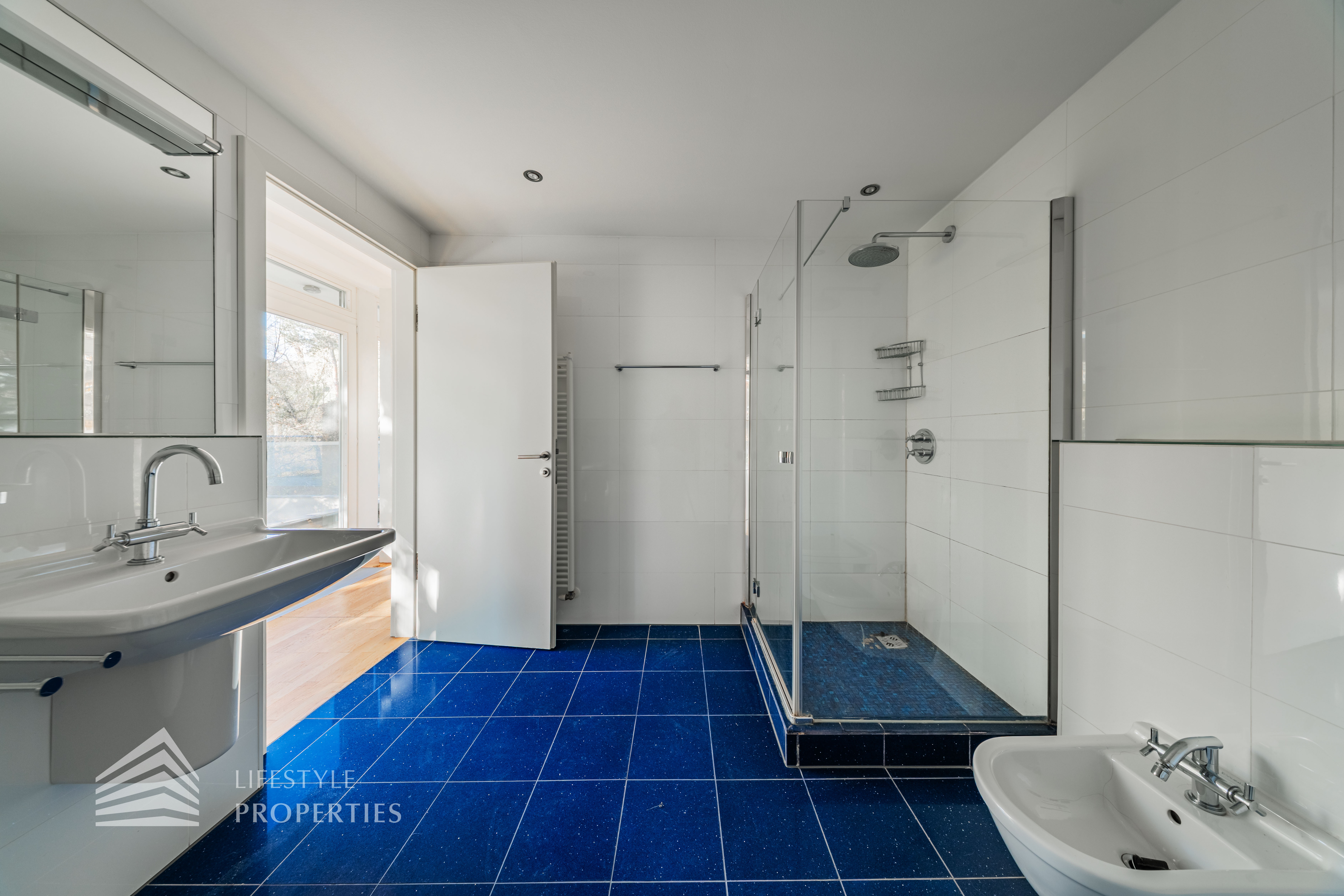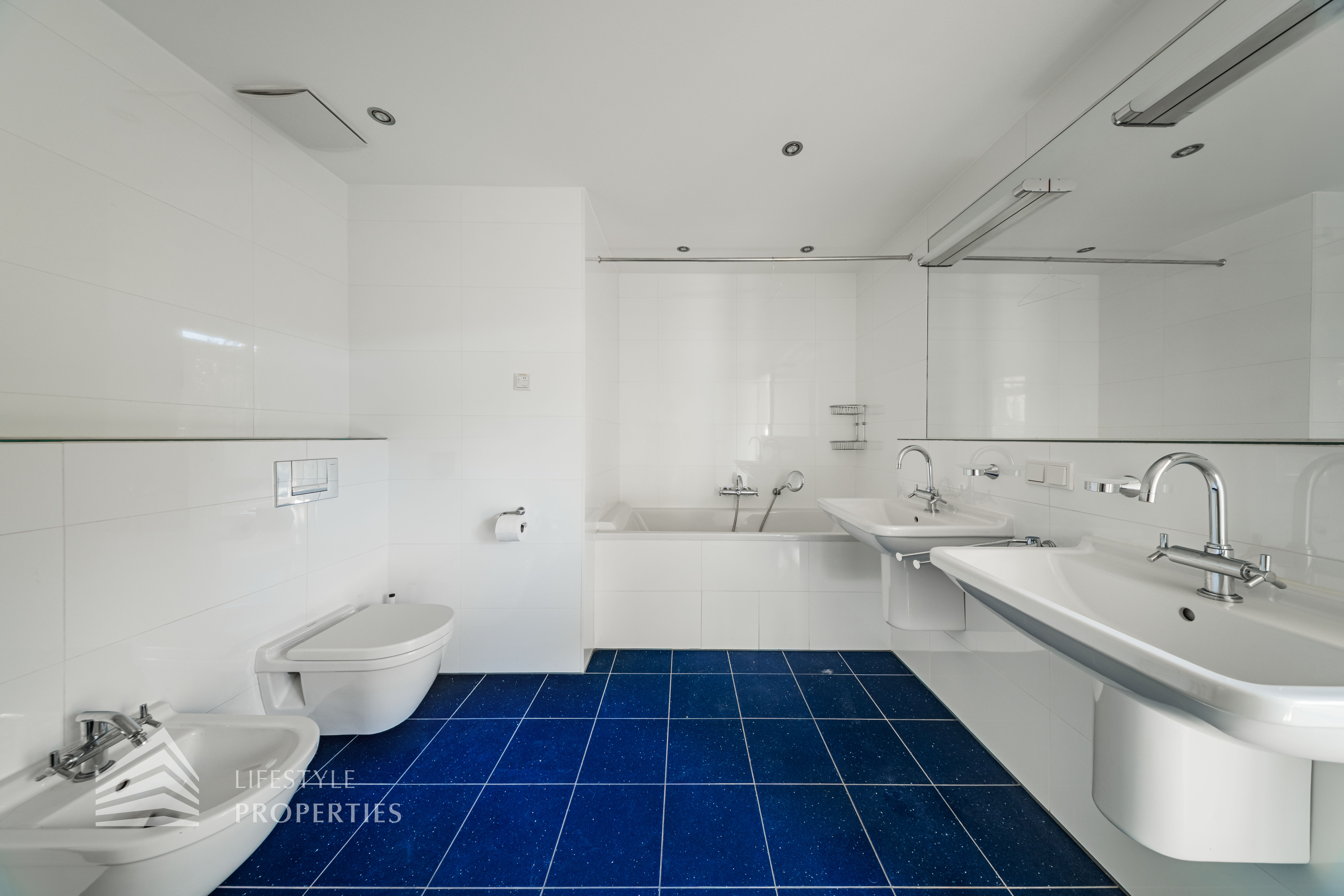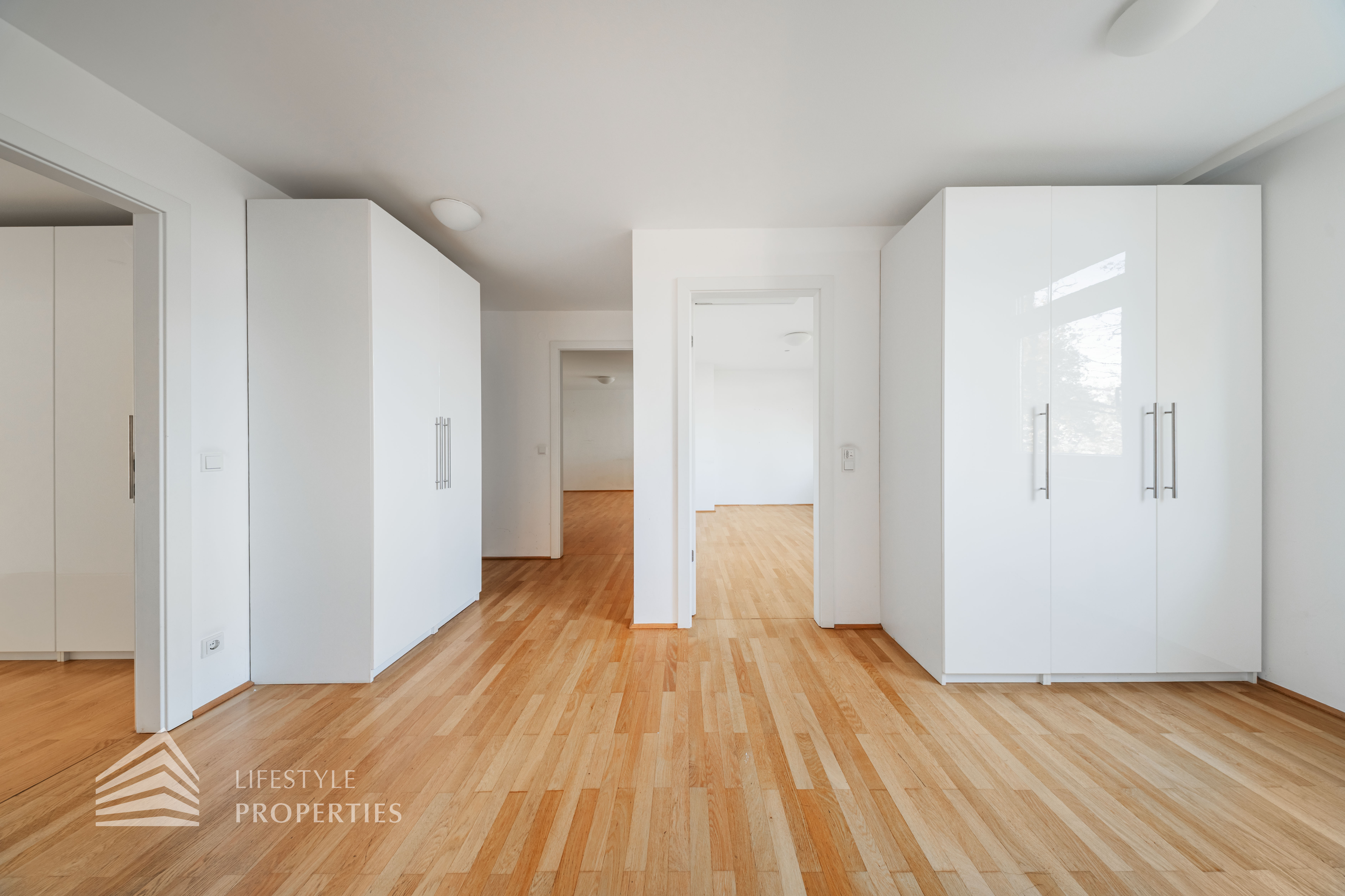 Sie betreten die Wohnung und befinden sich im Vorraum, der direkten Zugang zum großen Wohnraum bietet, von hier gelangen Sie auf einen der Balkone. Links durch den Vorraum gelangen Sie zur Küche und zu einem der Zimmer. Weiter im Gang befindet sich rechts eines der Badezimmer, welches mit einer Badewanne, einem Waschbecken und einem WC ausgestattet ist. Geradeaus gelangen Sie zu weiteren zwei der Zimmer und zum Wirtschaftsraum. Links gelangen Sie zum Master-Bedroom mit en-suite Badezimmer und Zugang zu einem Balkon. Von hier gelangt man außerdem auf die Terrasse und den schönen Garten. Im Vorraum befindet sich außerdem zwei Abstellräume und das separate WC.