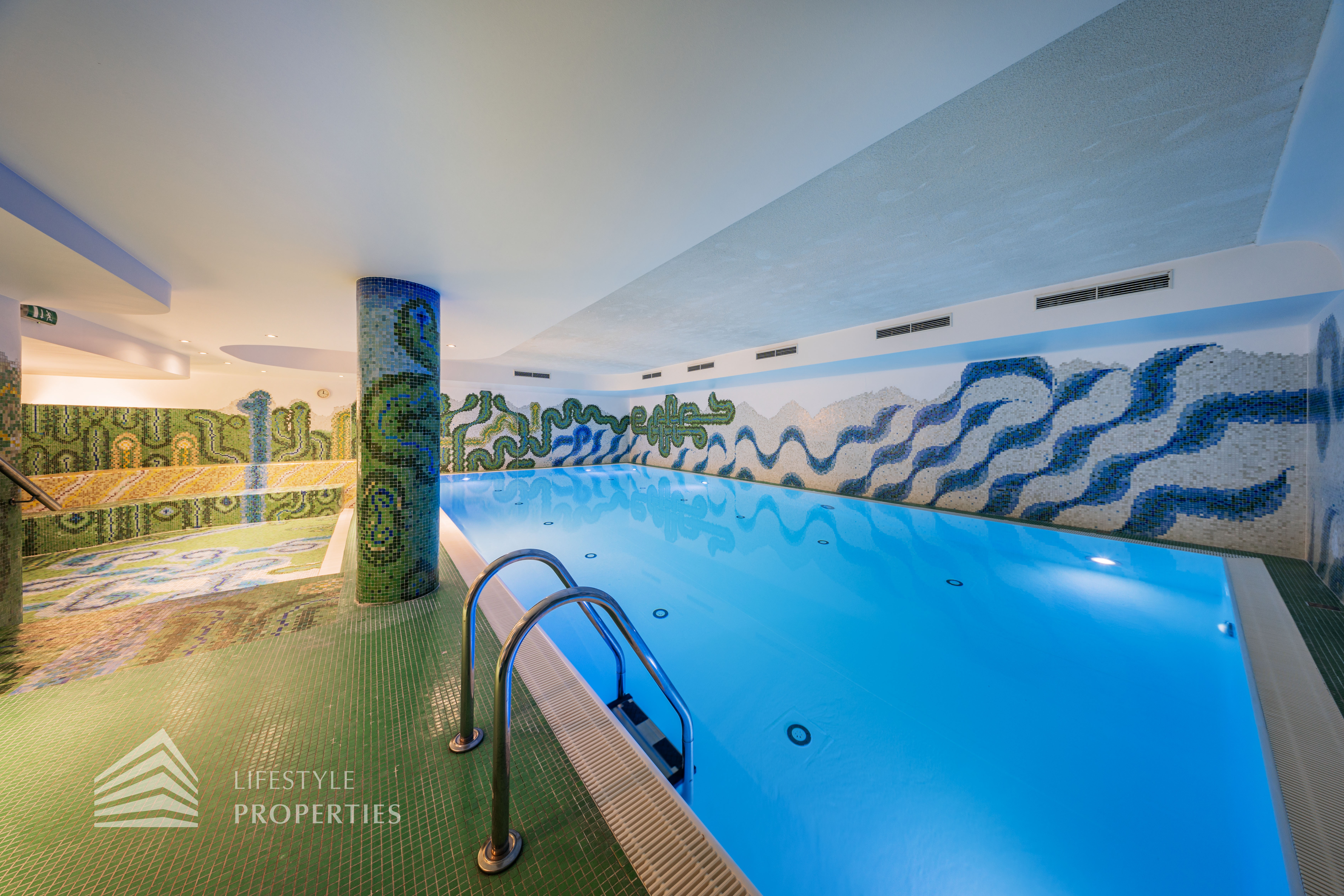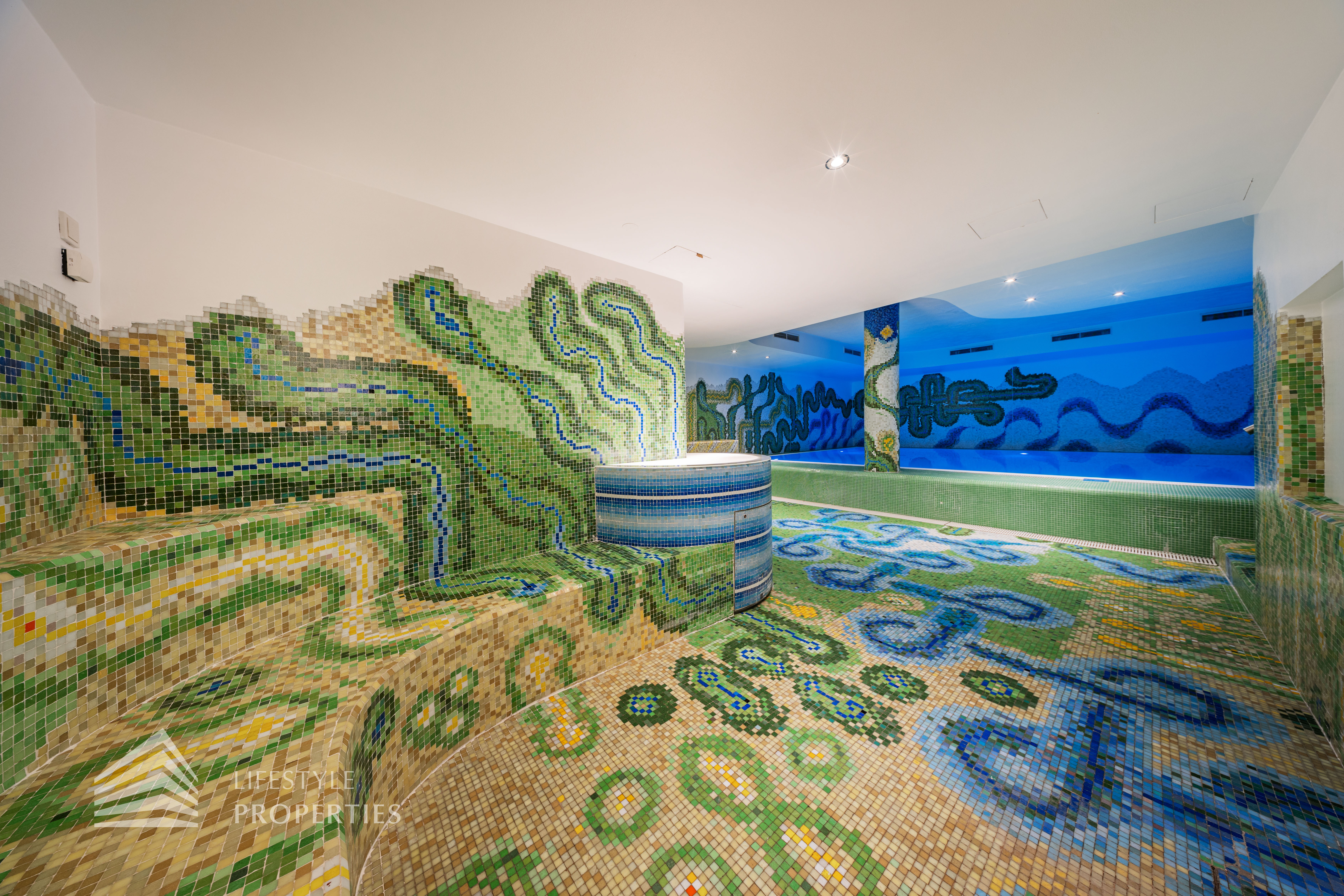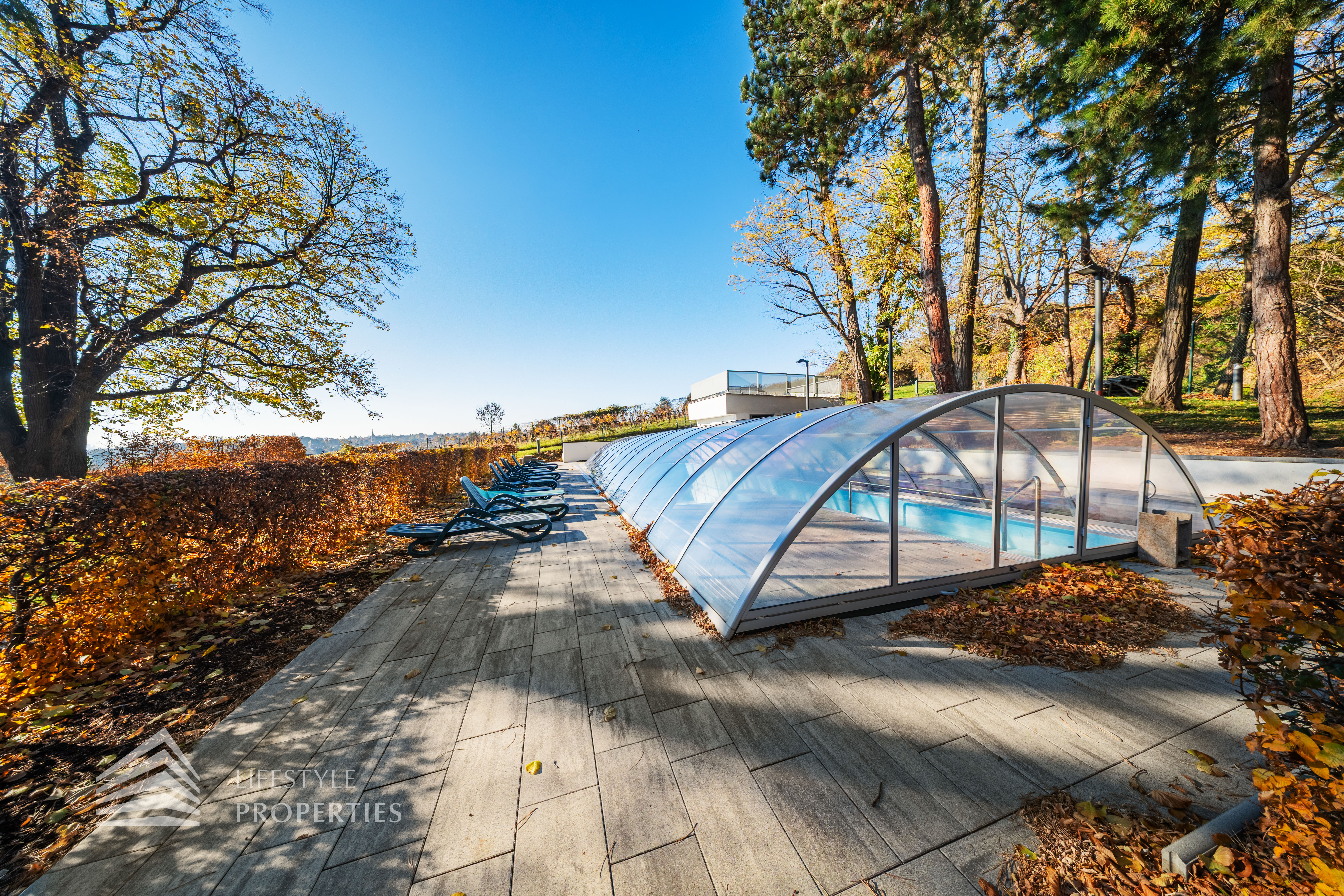 Das Wohnhaus verfügt über einen Innen- sowie Außenpool. Ergänzt wird das Angebot durch eine Sauna mit integrierter Dusche und WC. Alle Einrichtungen stehen das ganze Jahr über zur Verfügung. Ein weiteres Highlight ist der Weinkeller, der nicht nur über individuelle Weinabteile für jede Wohnung verfügt, sondern auch ideal für Feierlichkeiten genutzt werden kann. Zudem gehört ein Kamin zur Ausstattung jeder Wohnung.
