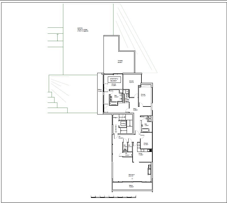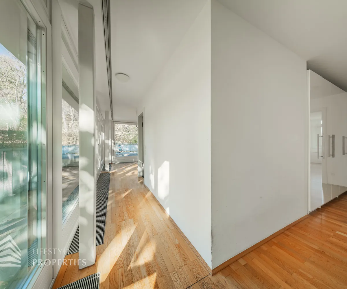 Die Wohnung befindet sich in einem im Jahre 1966 erbauten Neubau, liegt im 1. Stock und ist bequem über einen Lift erreichbar. Sie verfügt über eine Größe von ca.193 m². Die Wohnfläche teilt sich in fünf Zimmer, eine Küche, zwei Badezimmer, ein Gäste-WC, sowie drei Abstellräume auf. Zusätzlich dazu bietet die Wohnung zwei Balkone, einen Garten und eine Terrasse.