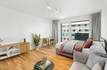In addition to your private living area, you will benefit from spacious, high-quality designed communal areas that go far beyond the usual: Whether focused work in the co-working space, relaxed hours in the stylish residents' lounge, or active breaks in the in-house fitness and yoga studio – here you will find exactly the place you need. For social moments, you have access to an exclusive private dining room, a gaming room, and an inviting cinema. Those who wish to engage in creative activities will find the ideal setting in the professionally equipped podcast room. A special highlight is the green rooftop terrace with a community garden – a retreat above the city rooftops, inviting you to relax, garden, and enjoy.