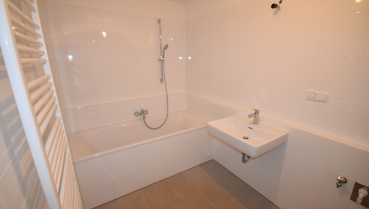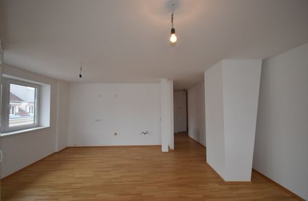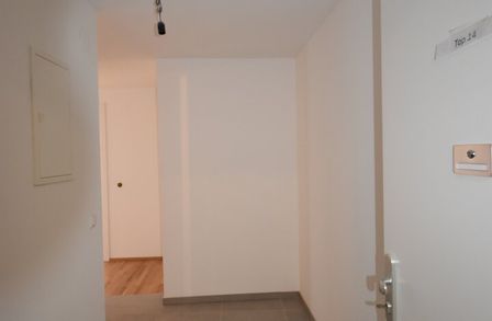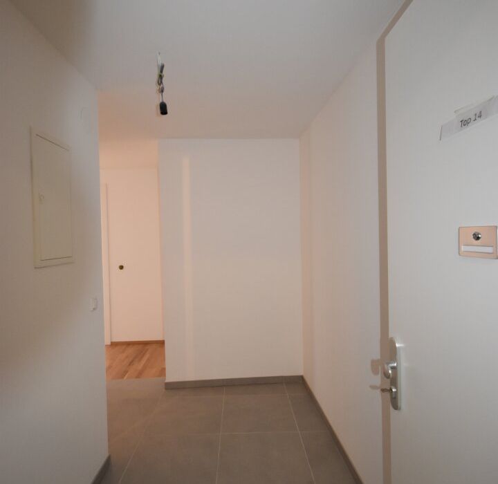 Vom Eingang aus gelangt man in das Vorzimmer. Auf der linken Seite befinden sich das separate WC sowie das Badezimmer mit Badewanne und Waschmaschinenanschluss. Rechts liegt ein kleiner Abstellraum, direkt daneben das Schlafzimmer. Vom Vorzimmer erreicht man geradeaus den Wohn- und Küchenbereich, der Zugang zu einer kleinen Loggia bietet.