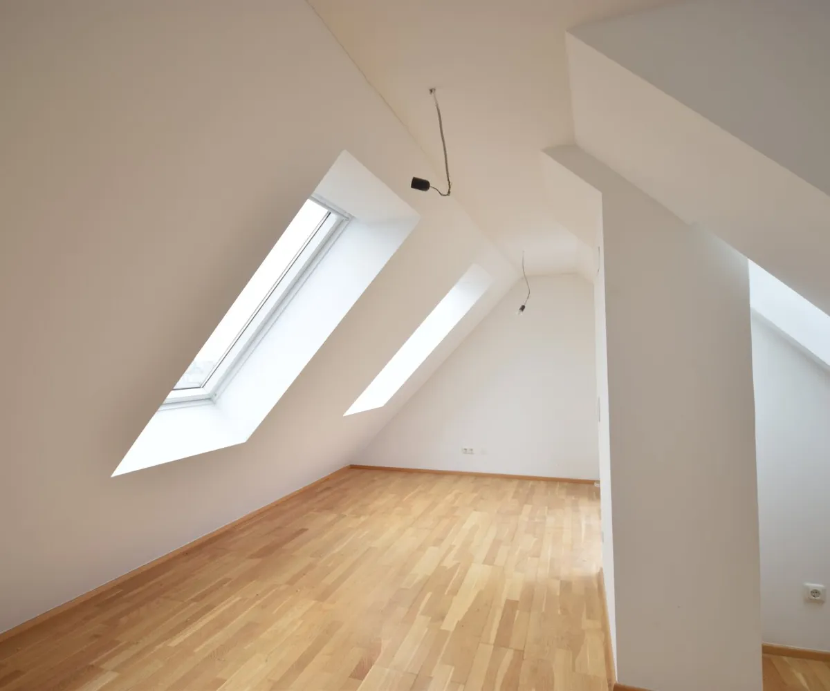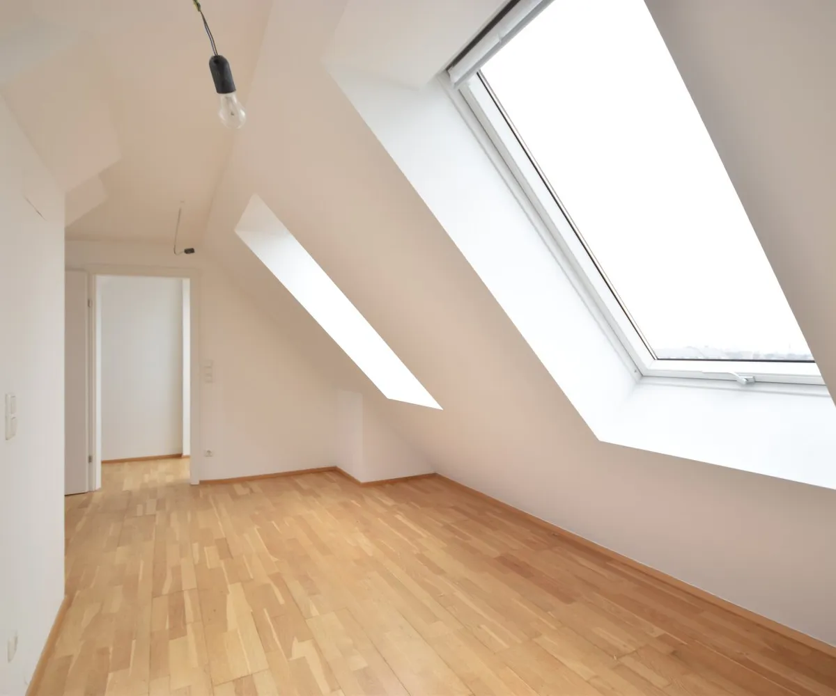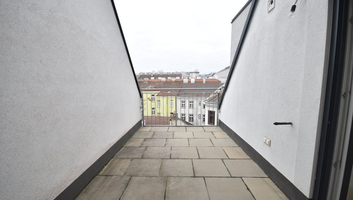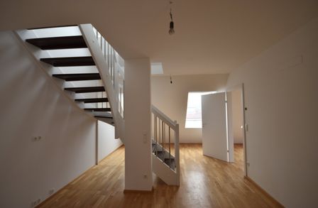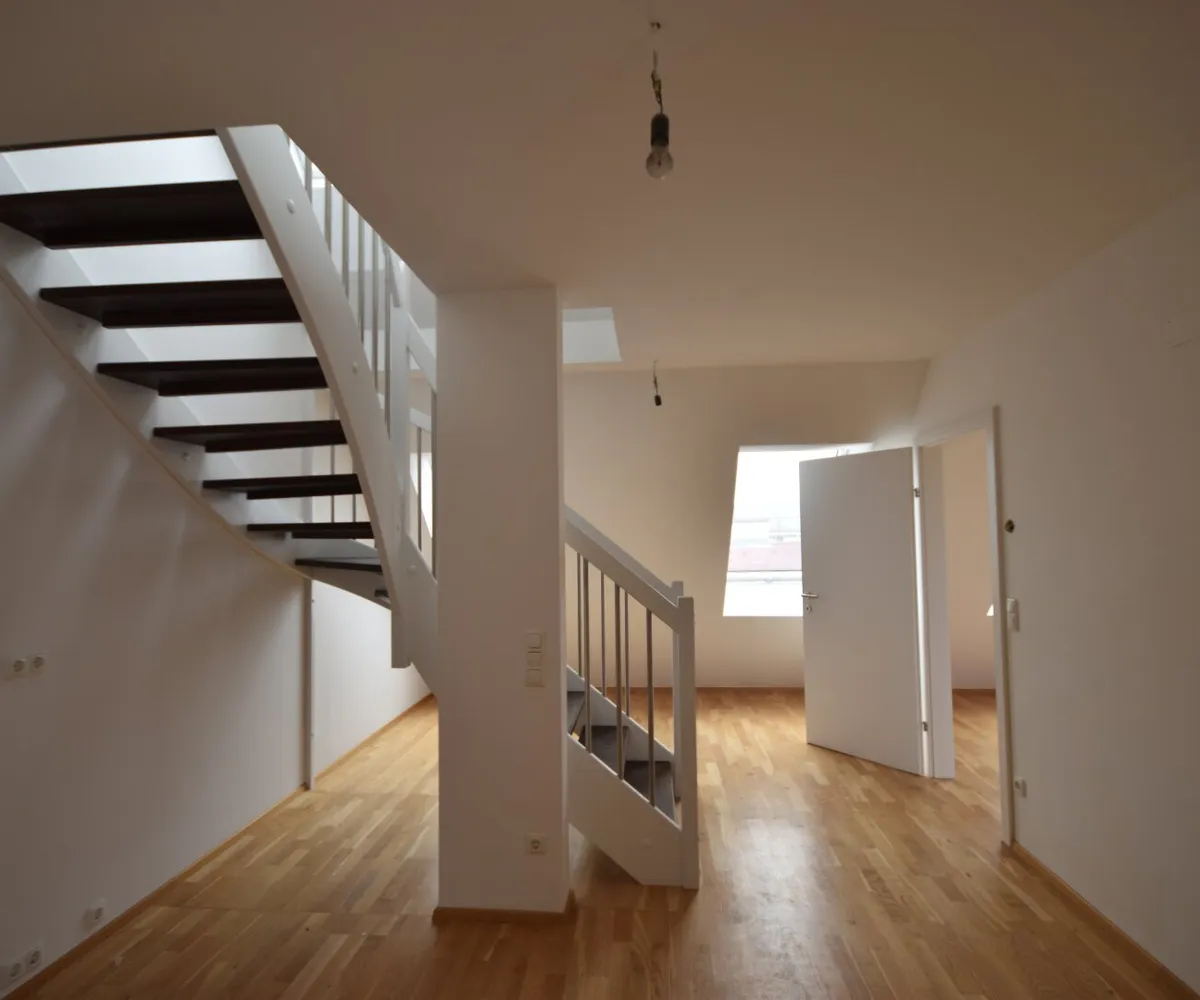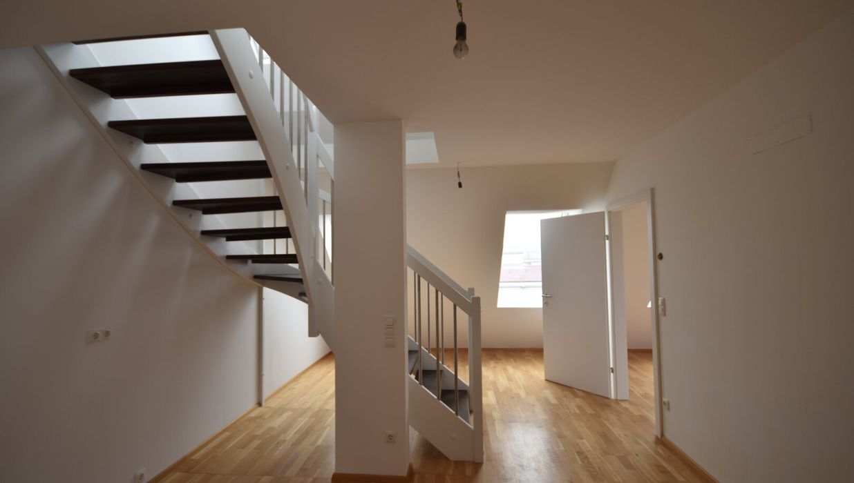 Vom Eingang aus betritt man ein kompaktes Vorzimmer, das ausreichend Platz für eine Garderobe bietet. Rechts davon befindet sich das Badezimmer, ausgestattet mit Dusche, Badewanne sowie einem Anschluss für die Waschmaschine.Links vom Vorzimmer aus gesehen gelangt man in den offenen Wohn- und Essbereich, der direkten Zugang zu einem geräumigen Balkon bietet. Hinter dem Wohn- und Essbereich, auf der rechten Seite gelegen, befindet sich das Schlafzimmer, das ebenfalls einen Zugang zu dem selben Balkon hat.im Wohn- und Essbereich führen Treppen in das obere Stockwerk. Von dort gelangt man direkt zu einem kleinen Abstellraum. Auf der linken Seite befindet sich ein mittelgroßer Raum, der sich ideal als weiteres Schlafzimmer oder als Büro mit gemütlicher Leseecke eignet. Von diesem Raum aus hat man außerdem Zugang zu einer charmanten Dachterrasse.