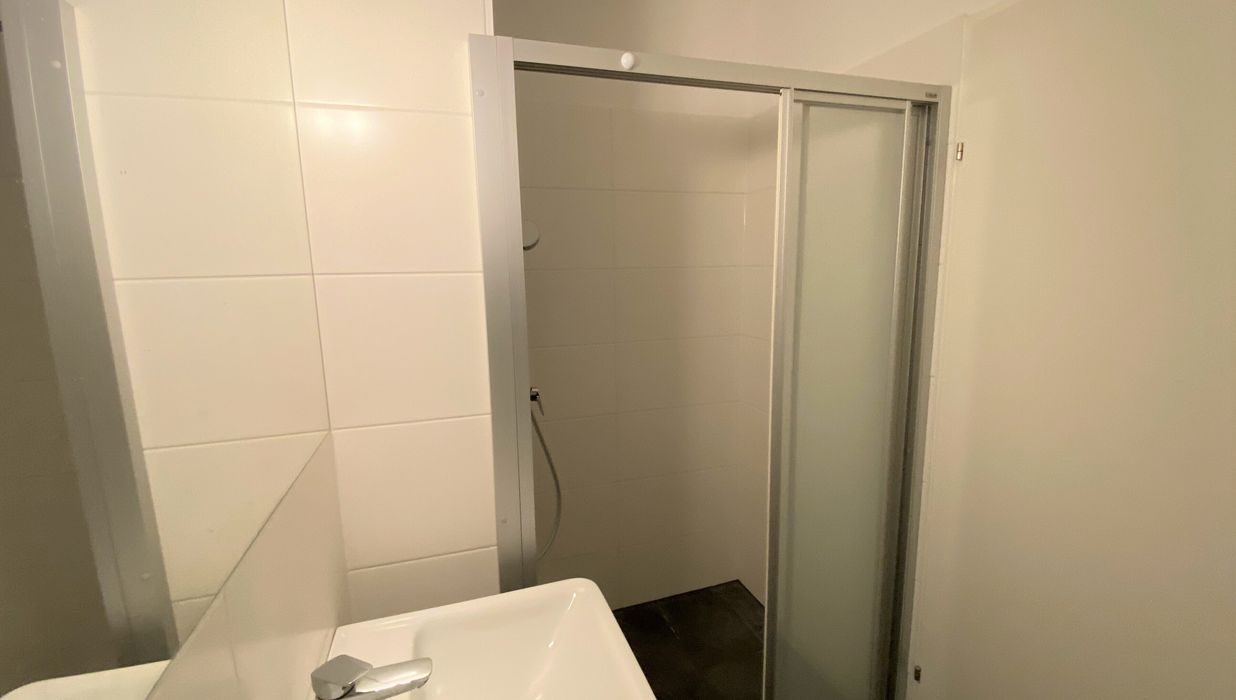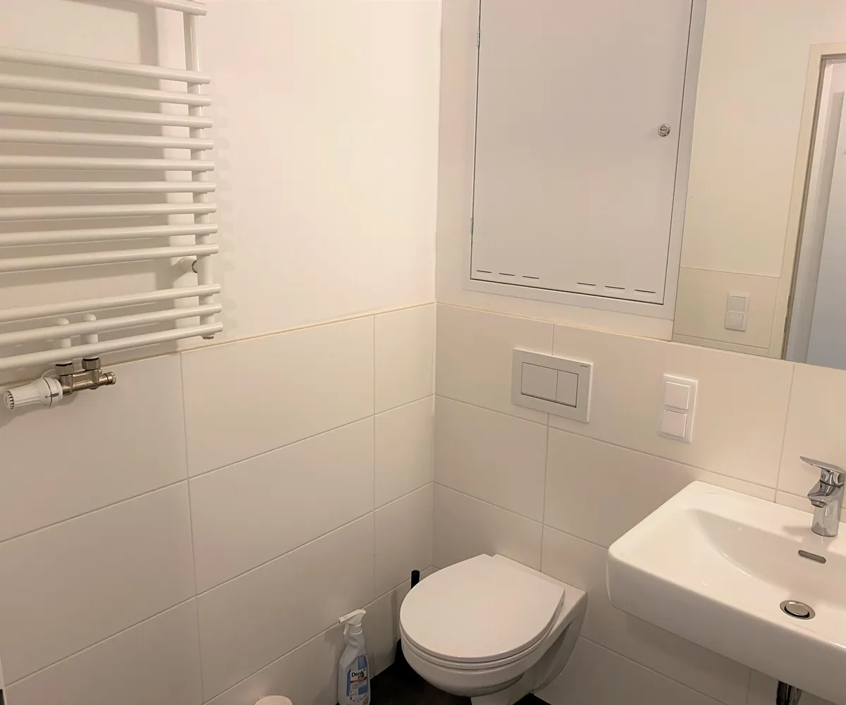 Die Wohnung selbst liegt im 3. Obergeschoss, ist Richtung Innenhof ausgerichtet und verfügt über einen möblierten Wohnraum (mit Bett, Sofa, Schrank, Tischchen und Sessel), ein Badezimmer mit Dusche und Toilette sowie einen Vorraum mit Küchennische (Kühlschrank, 2 Herdplatten & Mikrowelle)