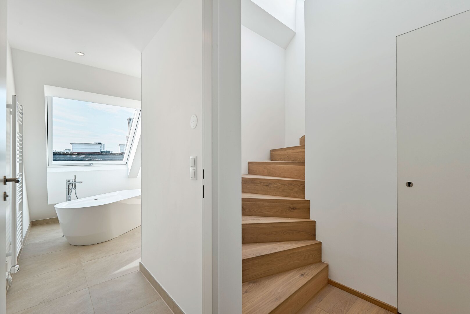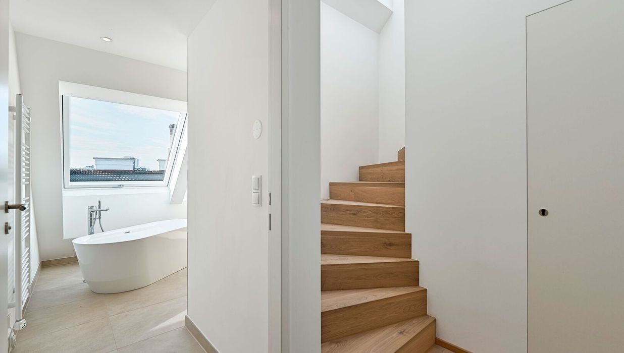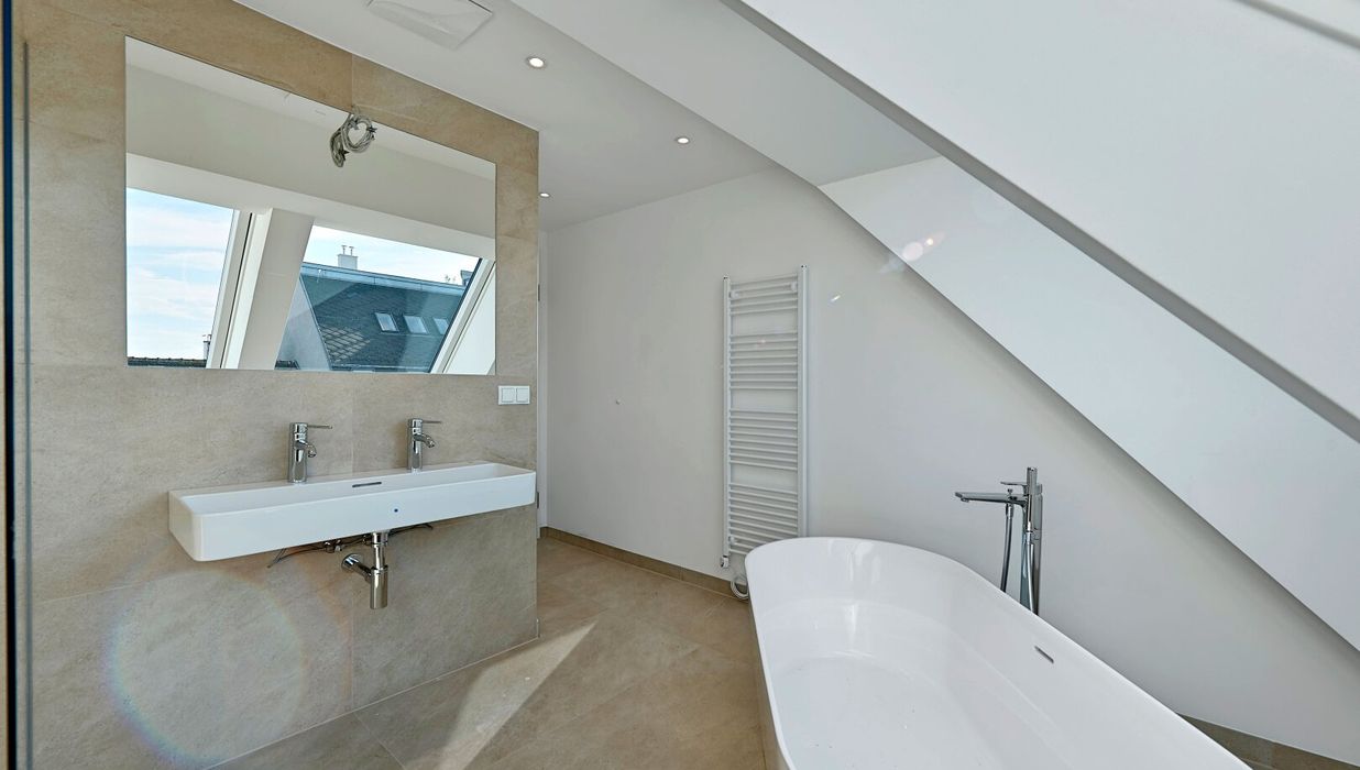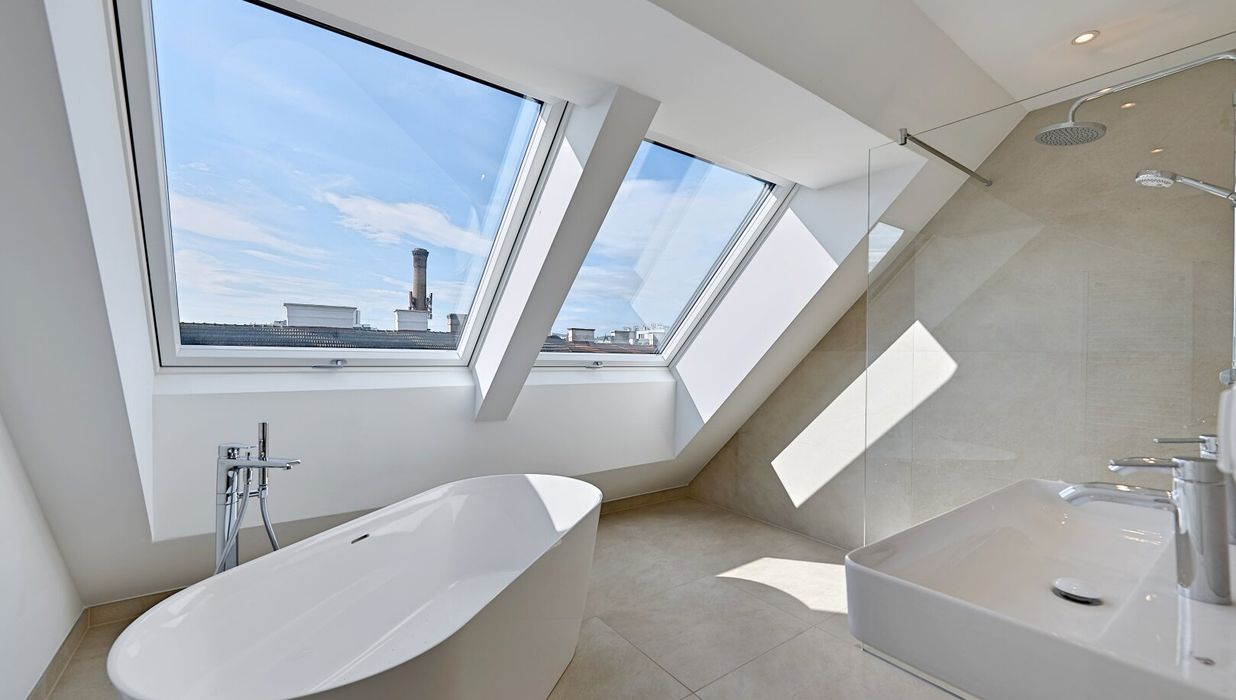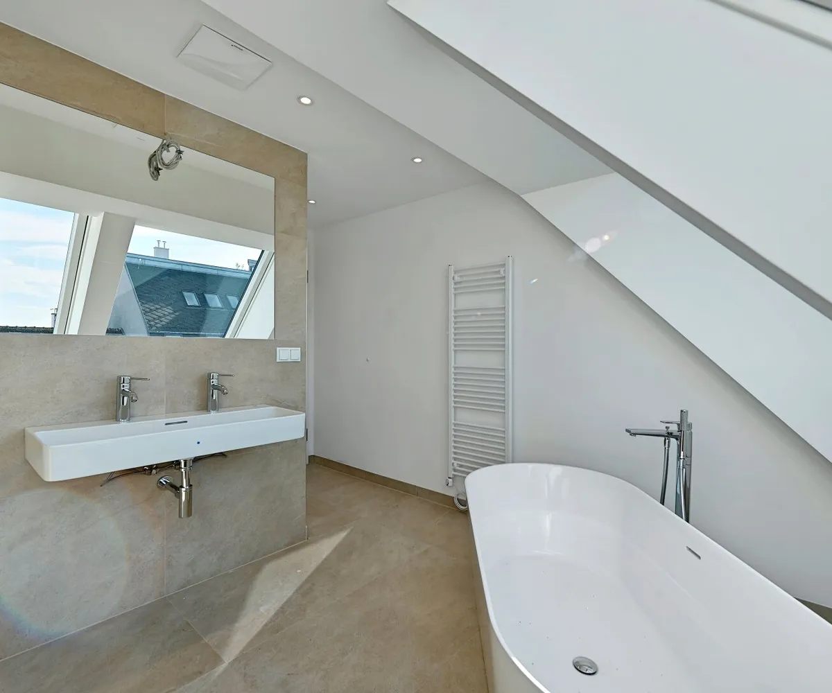 Vom Vorraum mit versteckter Garderobe bzw. Abstellraum gelangt man in das edle und luxuriöse Badezimmer mit freistehender Badewanne, ebenerdiger Dusche und einem Doppelwaschtisch. Mit den pompösen Dachfenstern wirkt das Badezimmer noch stilvoller und ist ein echtes Highlight der Wohnung.