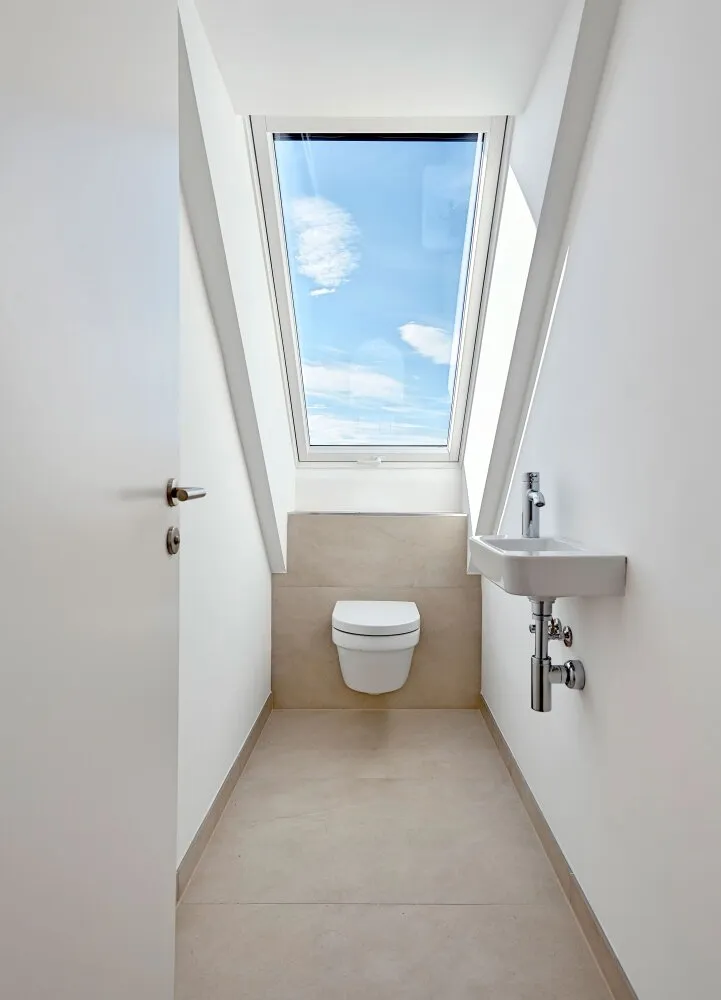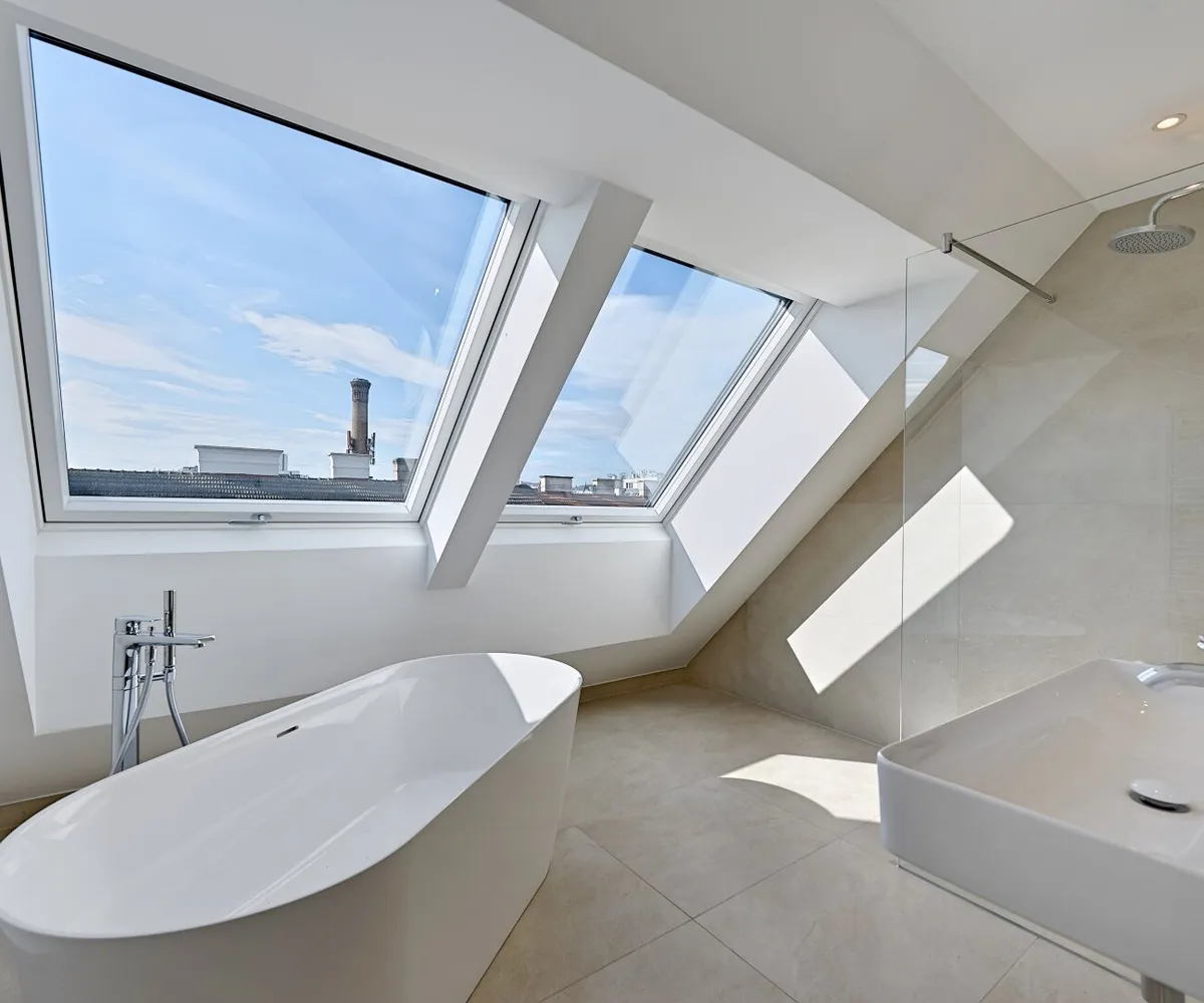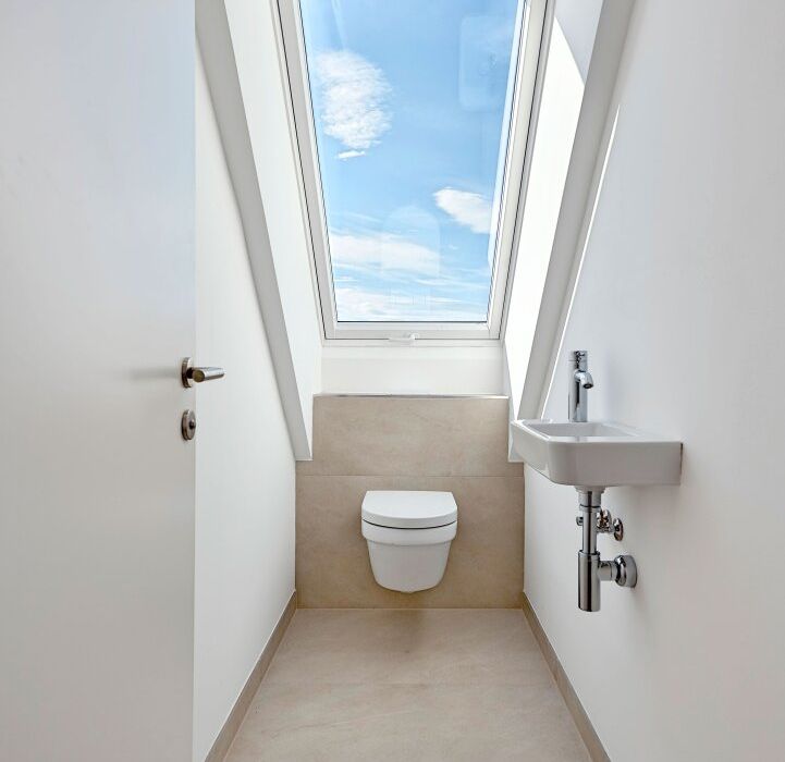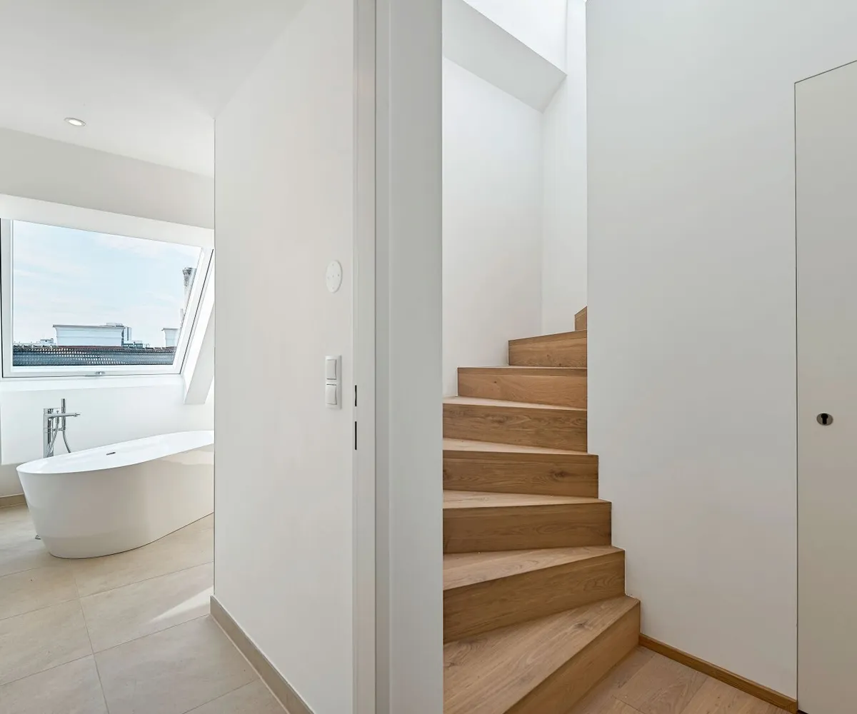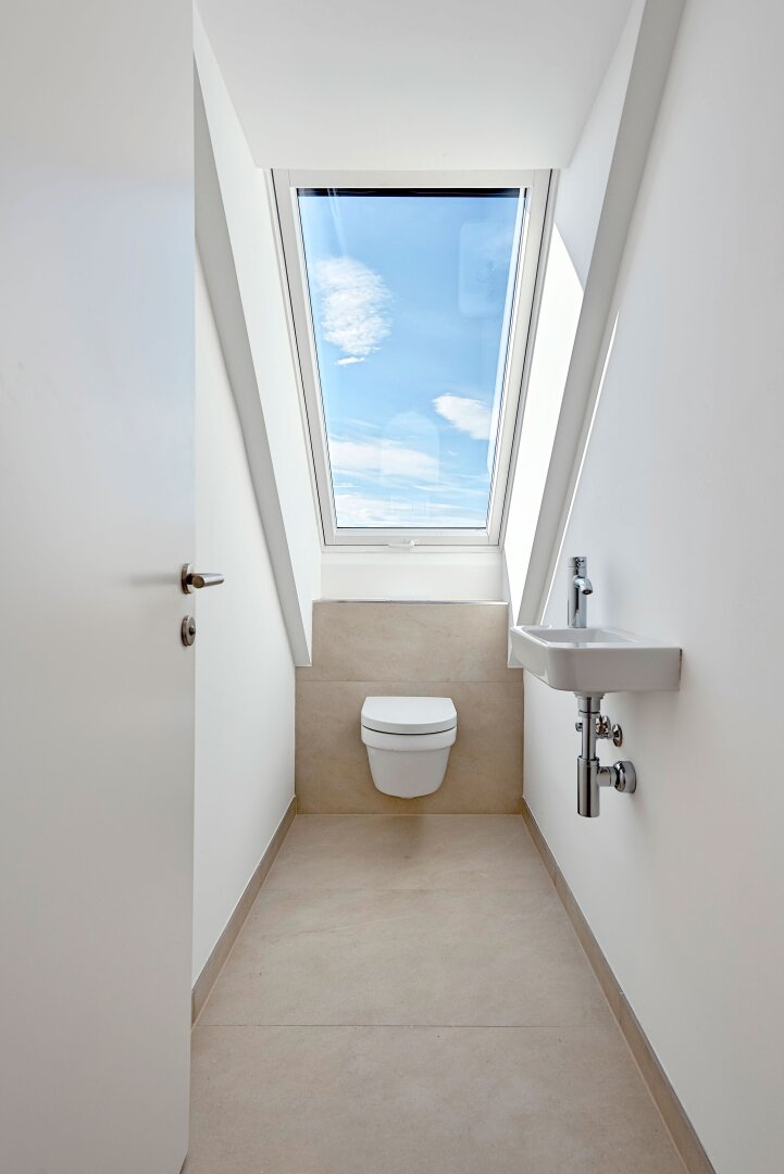 Vom Vorraum mit versteckter Garderobe bzw. Abstellraum gelangt man in das edle und luxuriöse Badezimmer mit freistehender Badewanne, ebenerdiger Dusche und einem Doppelwaschtisch. Mit den pompösen Dachfenstern wirkt das Badezimmer noch stilvoller und ist ein echtes Highlight der Wohnung.