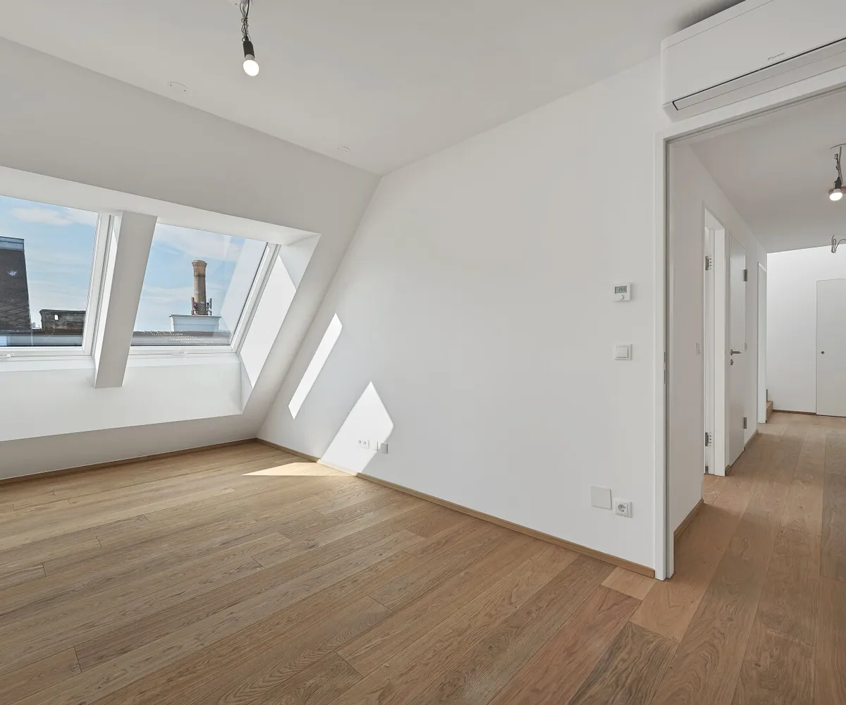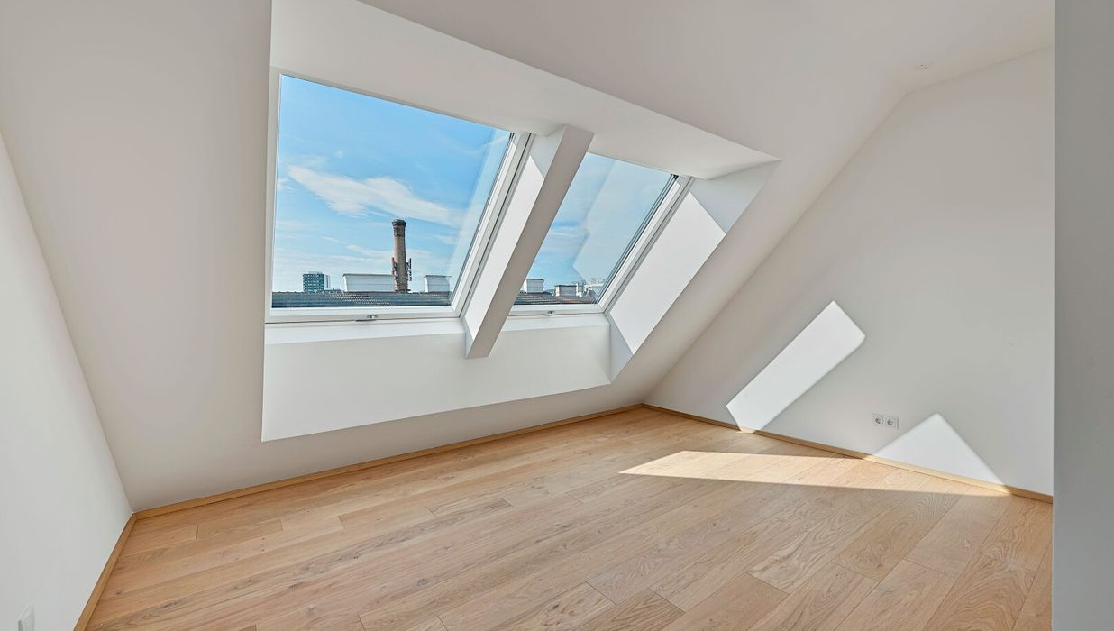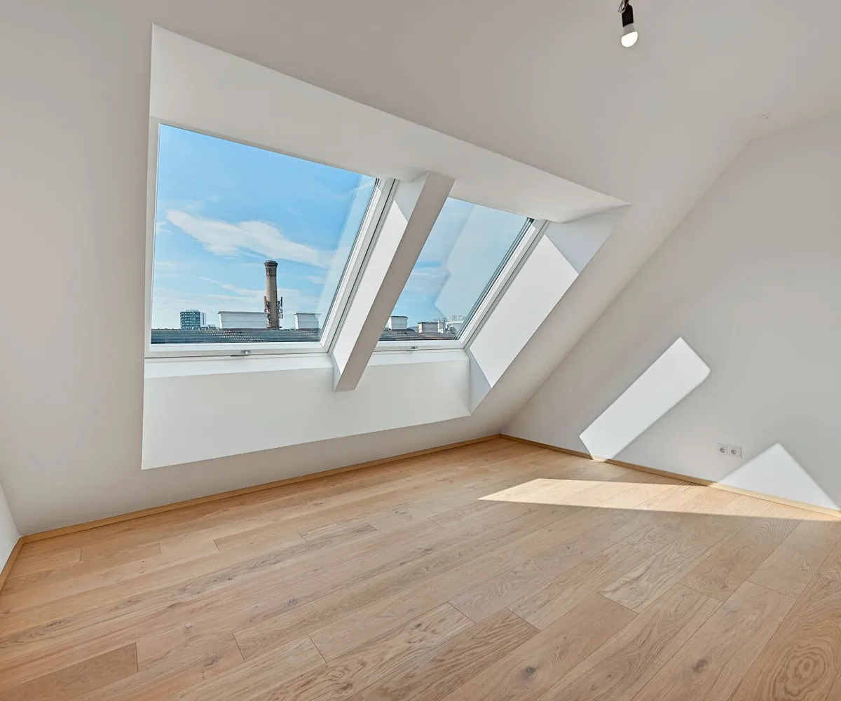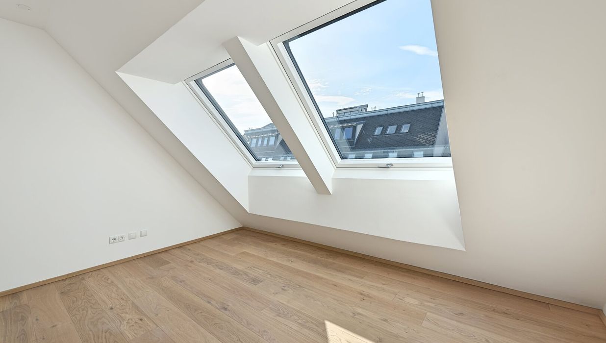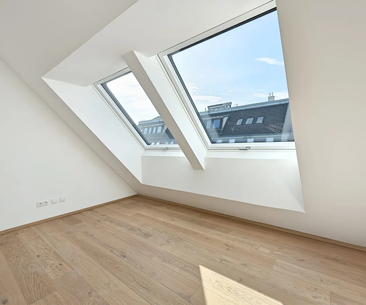 Die zwei Schlaf- bzw. Arbeitszimmer sind sehr geräumig und haben auch jeweils zwei großflächige Dachfenster, wodurch der traumhafte Eichenholz Parkett besonders gut zur Geltung kommt.