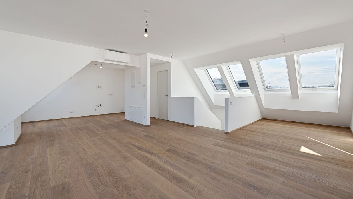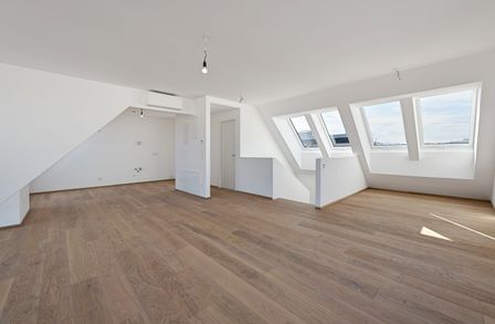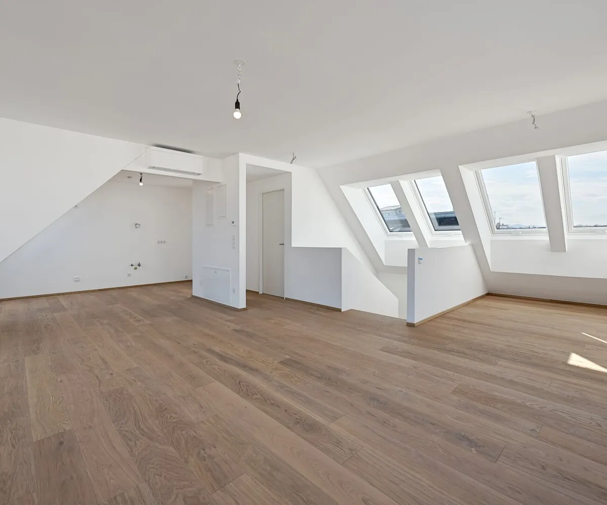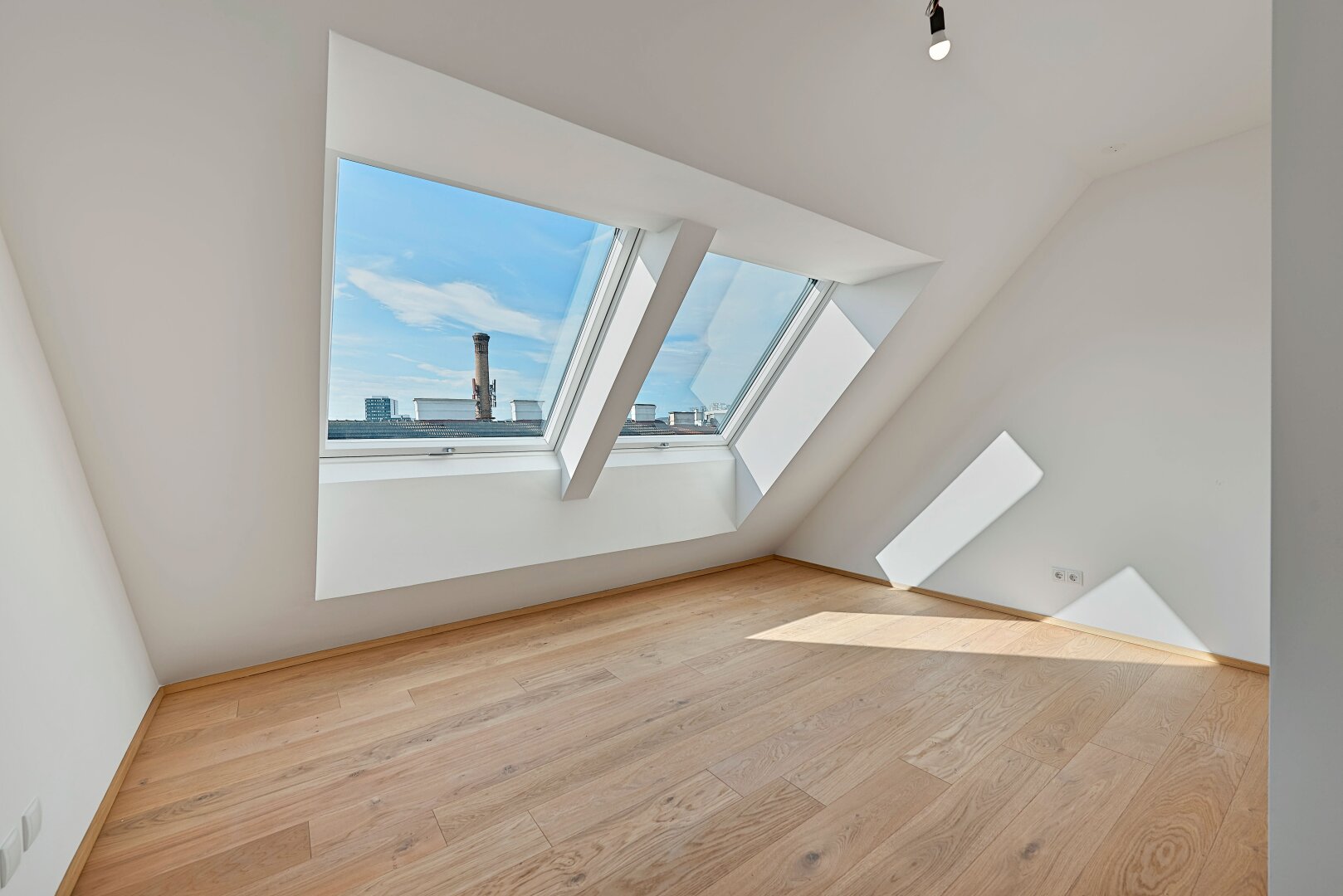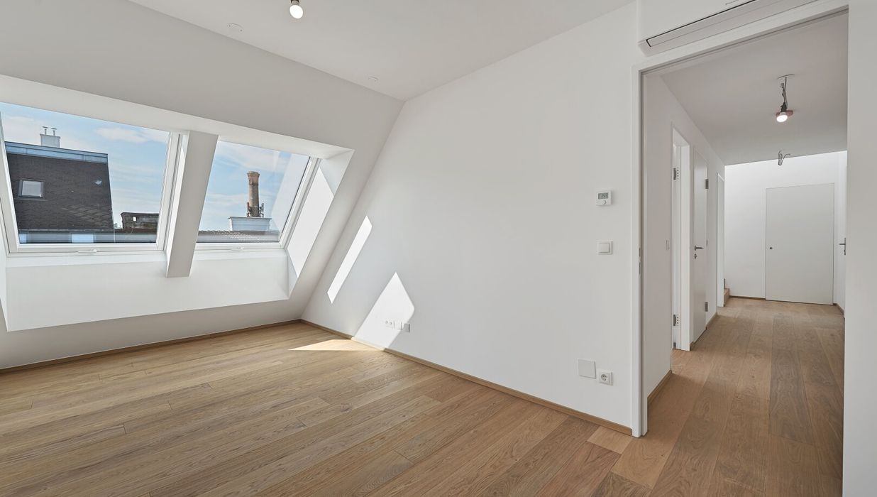Die zwei Schlaf- bzw. Arbeitszimmer sind sehr geräumig und haben auch jeweils zwei großflächige Dachfenster, wodurch der traumhafte Eichenholz Parkett besonders gut zur Geltung kommt.