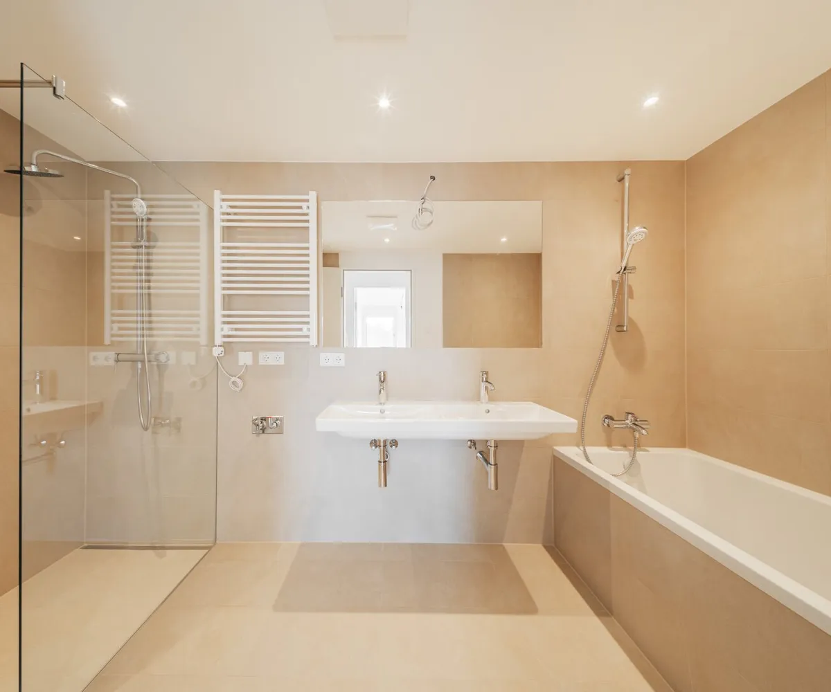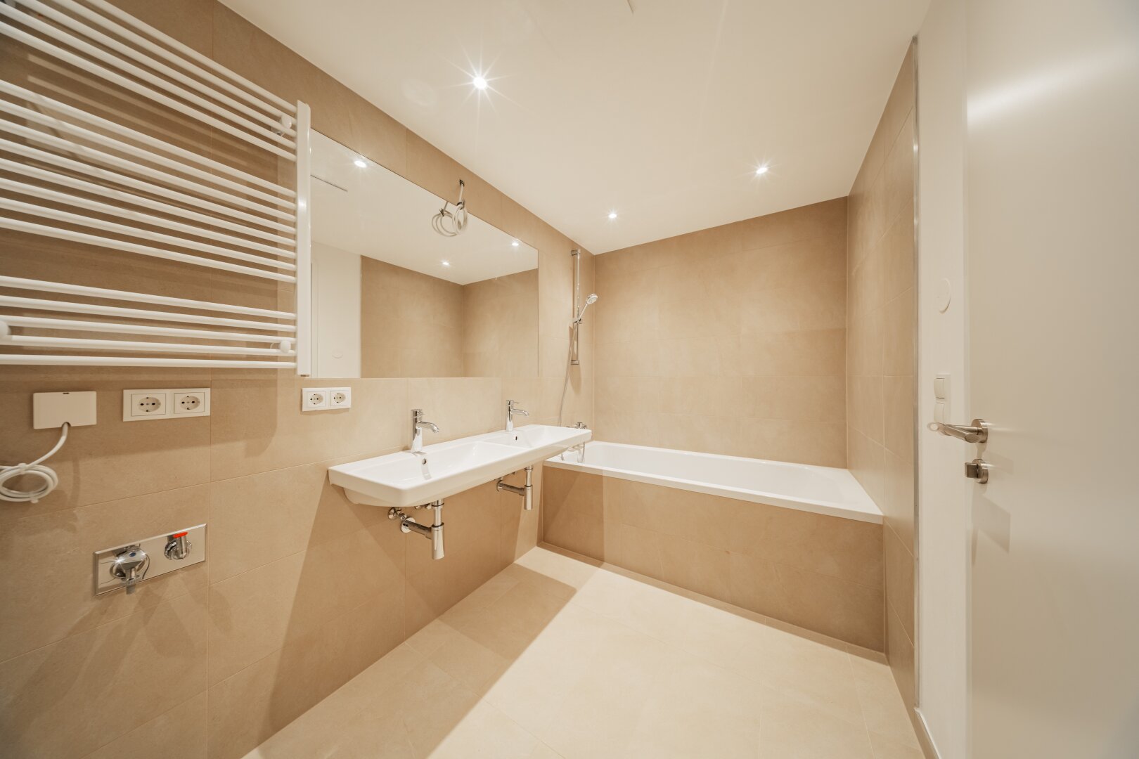 - Badezimmer mit Badewanne, Dusche , Doppelwaschtisch, Handtuchwärmer und Waschmaschinenanschluss