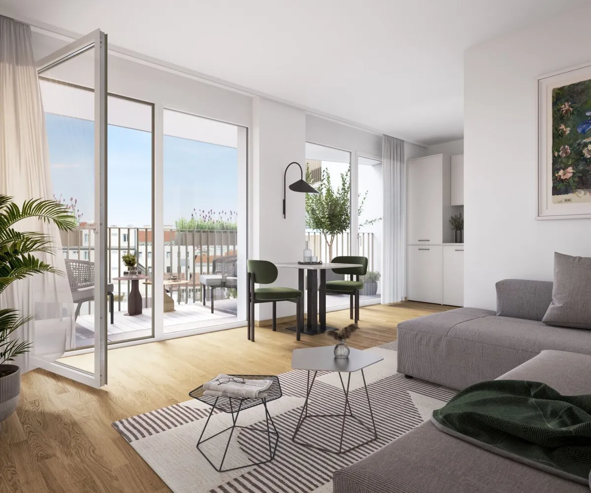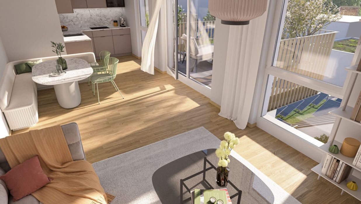 Die sorgfältig geplanten Eigentumswohnungen und Townhouses bieten mit ihren vielfältigen Grundrissen und Wohnungsgrößen für jede Lebensphase die ideale Wohnlösung. Ein behagliches Wohnambiente erzeugen die edlen Eichenparkettböden sowie die hochwertige Sanitärausstattung in den Bädern. Die Raumtemperatur lässt sich bequem über die Fußbodenheizung, die durch Fernwärme betrieben wird, sowie über die elektrisch bedienbaren Raffstores oder Rollläden regulieren. In den Dachgeschosswohnungen sorgen zusätzlich installierte Klimaanlagen dafür, dass es auch im Sommer angenehm kühl bleibt. Jede Wohneinheit verfügt über eine eigene private Freifläche, die die Wohnräume nach außen erweitert und einen idealen Rückzugsort für Erholung und Entspannung bietet.