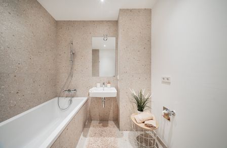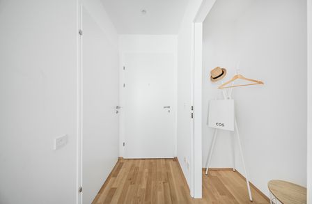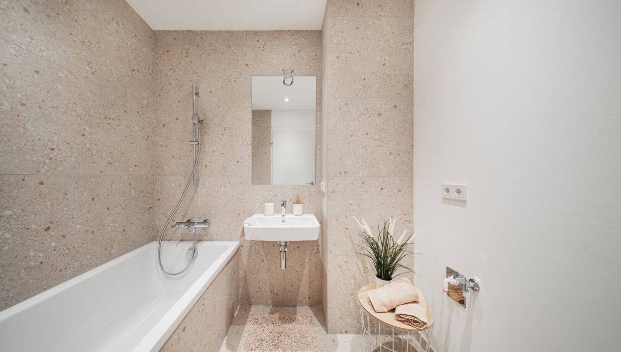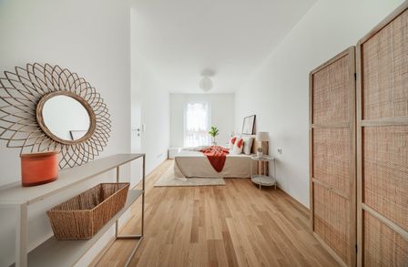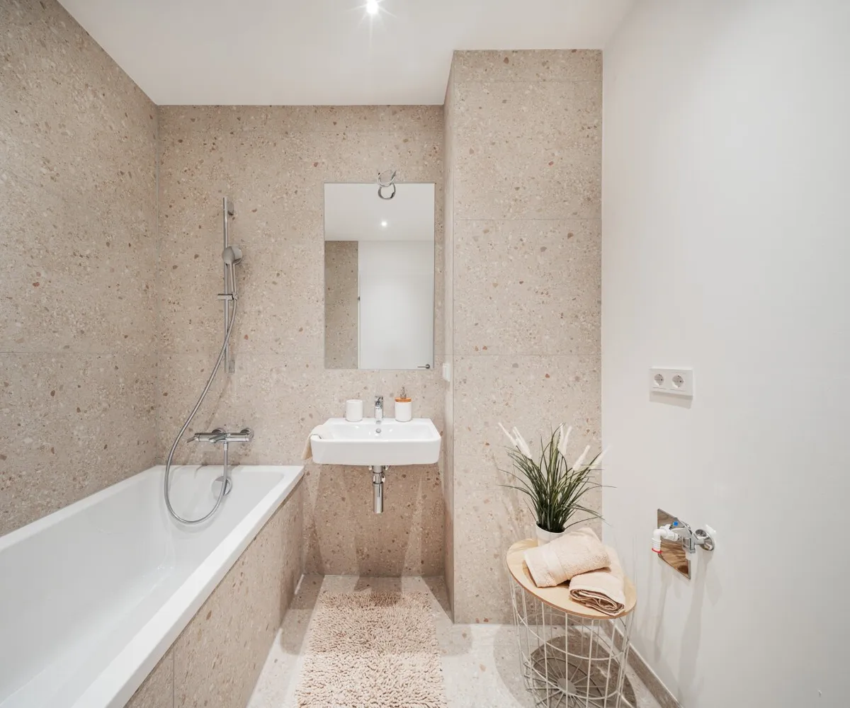 Die sorgfältig geplanten Eigentumswohnungen und Townhouses bieten mit ihren vielfältigen Grundrissen und Wohnungsgrößen für jede Lebensphase die ideale Wohnlösung. Ein behagliches Wohnambiente erzeugen die edlen Eichenparkettböden sowie die hochwertige Sanitärausstattung in den Bädern. Die Raumtemperatur lässt sich bequem über die Fußbodenheizung, die durch Fernwärme betrieben wird, sowie über die elektrisch bedienbaren Raffstores oder Rollläden regulieren. In den Dachgeschosswohnungen sorgen zusätzlich installierte Klimaanlagen dafür, dass es auch im Sommer angenehm kühl bleibt. Jede Wohneinheit verfügt über eine eigene private Freifläche, die die Wohnräume nach außen erweitert und einen idealen Rückzugsort für Erholung und Entspannung bietet.