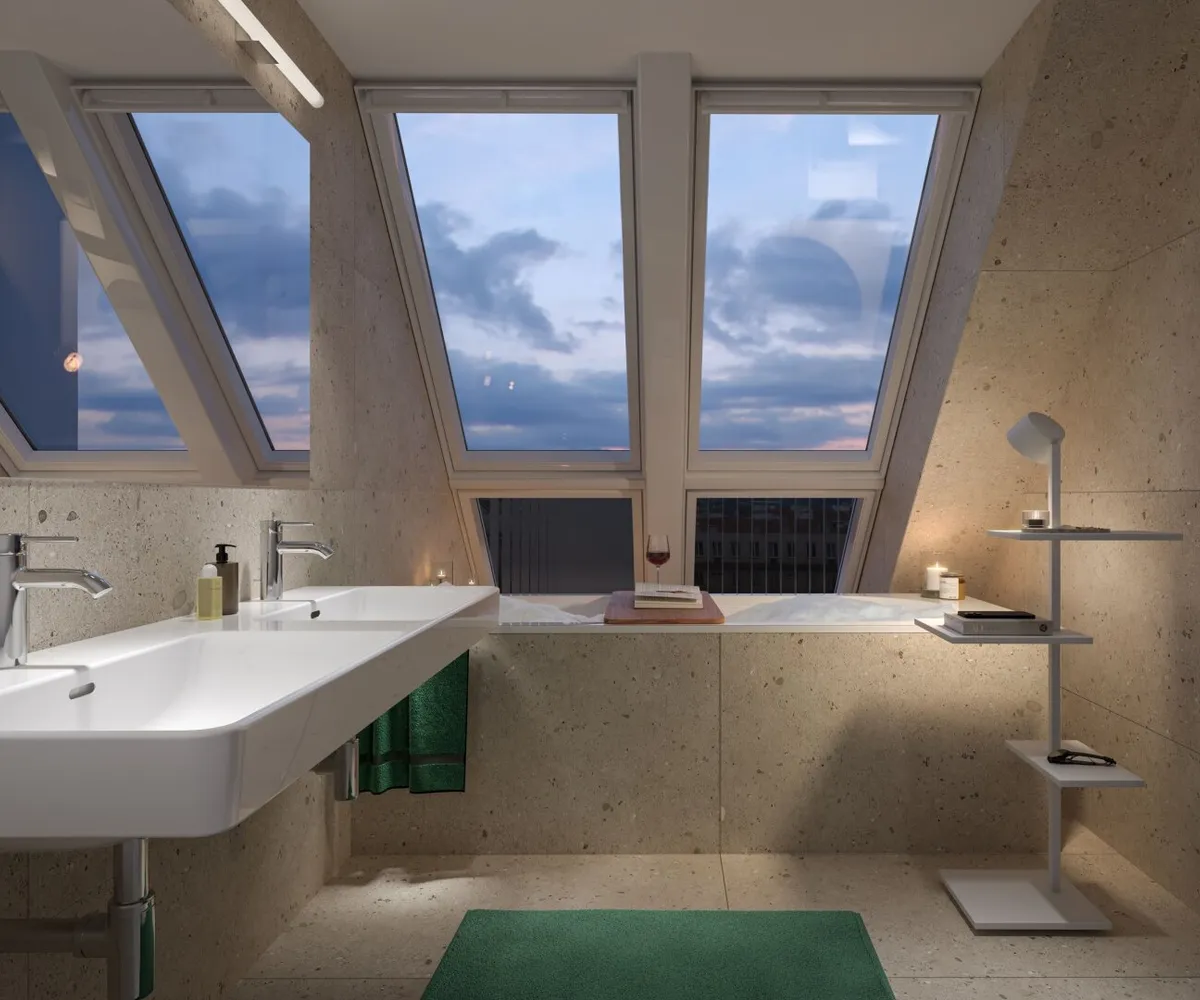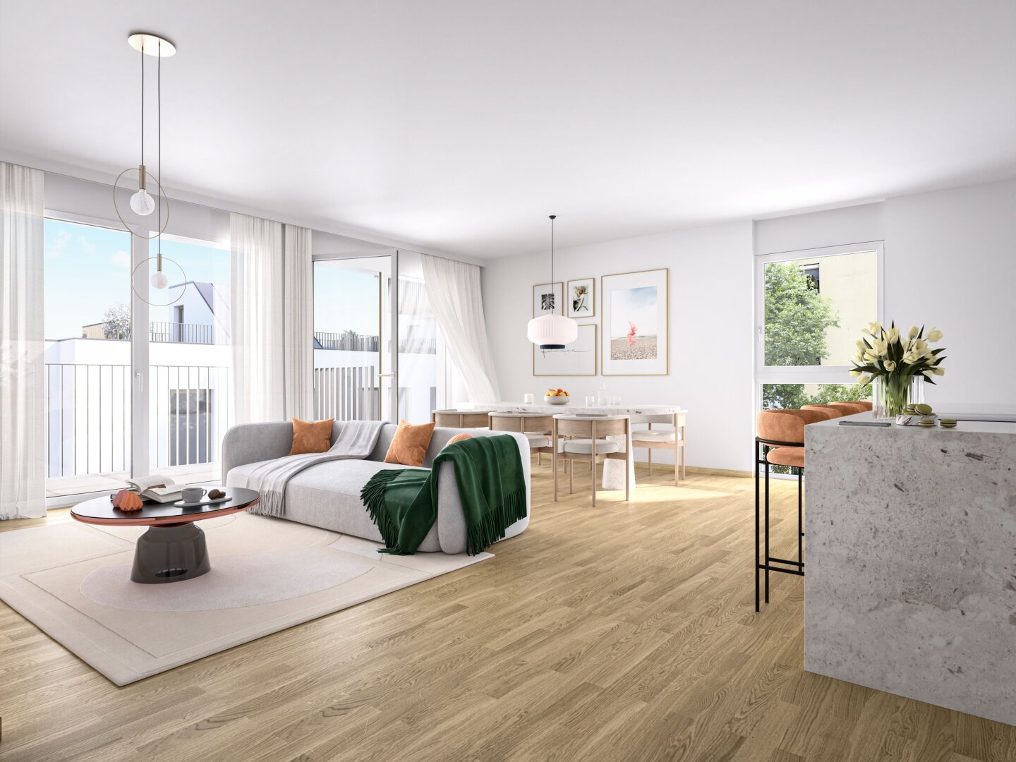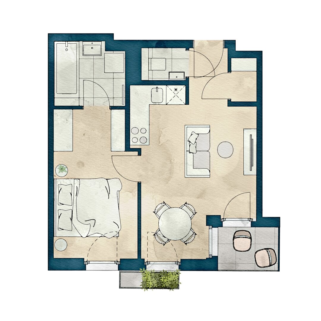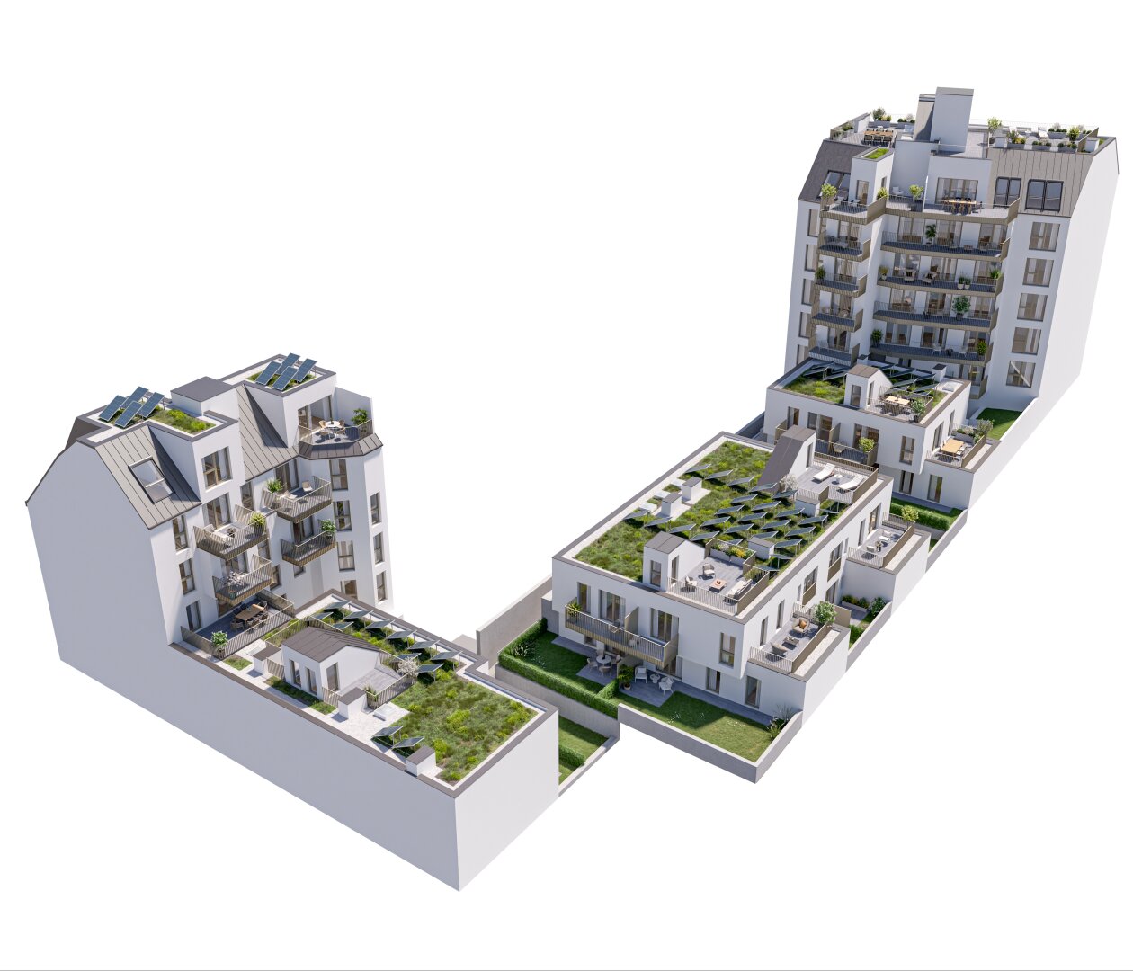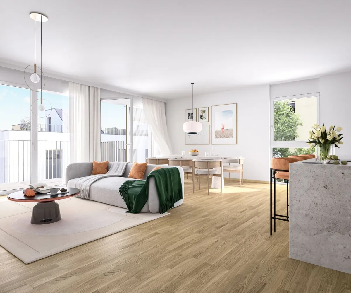 Die sorgfältig geplanten Eigentumswohnungen und Townhouses bieten mit ihren vielfältigen Grundrissen und Wohnungsgrößen für jede Lebensphase die ideale Wohnlösung. Ein behagliches Wohnambiente erzeugen die edlen Eichenparkettböden sowie die hochwertige Sanitärausstattung in den Bädern. Die Raumtemperatur lässt sich bequem über die Fußbodenheizung, die durch Fernwärme betrieben wird, sowie über die elektrisch bedienbaren Raffstores oder Rollläden regulieren. In den Dachgeschosswohnungen sorgen zusätzlich installierte Klimaanlagen dafür, dass es auch im Sommer angenehm kühl bleibt. Jede Wohneinheit verfügt über eine eigene private Freifläche, die die Wohnräume nach außen erweitert und einen idealen Rückzugsort für Erholung und Entspannung bietet.